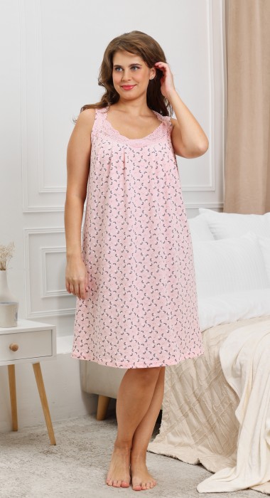 Сорочка женская из трикотажного полотна «кулирка» слегка расширенная книзу, без рукавов. Кружевные детали кокетки на полочке образуют V-ный вырез горловины. На нижней части полочки по шву притачивания кружевной кокетки заложены симметричные складки, проймы окантованы основным материалом.