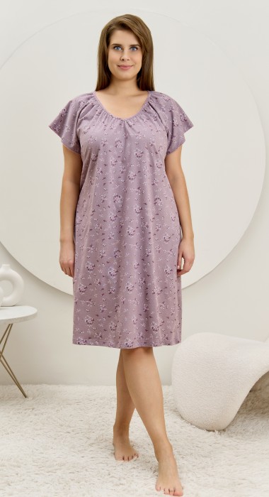 Сорочка женская из трикотажного полотна «кулирка» с набивным рисунком свободного покроя, с короткими втачными рукавами покроя «реглан». Углубленная горловина V- образной формы, собрана по краю на сборку и окантована основным материалом. Низ изделия и нижние срезы рукавов обработаны узким обметочным швом нитками в тон изделия.