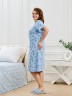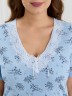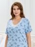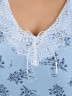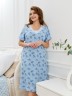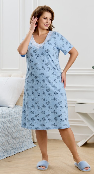 Сорочка женская из трикотажного полотна «кулирка» с набивным рисунком, полуприталенного силуэта, слегка расширенная к низу, с короткими втачными рукавами. Горловина V- образной формы, обработана кружевом с фестонным краем, по центру настрочен декоративный бантик из узкой атласной тесьмы.