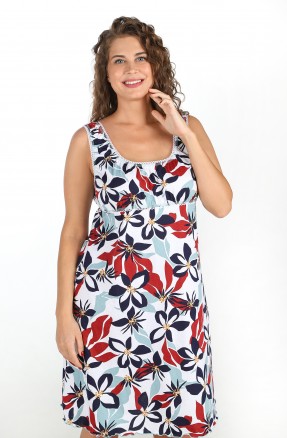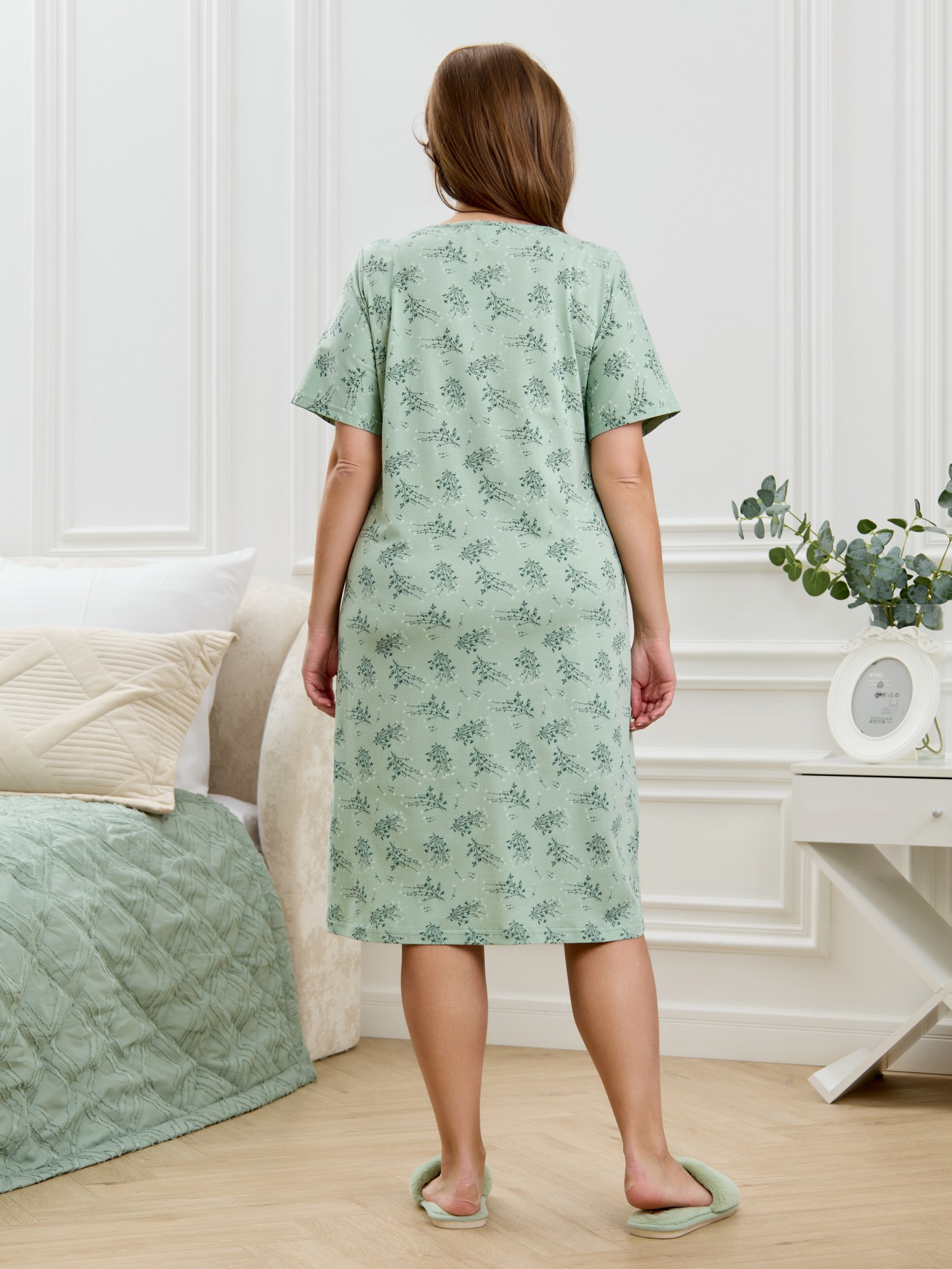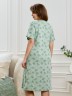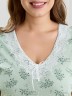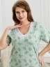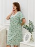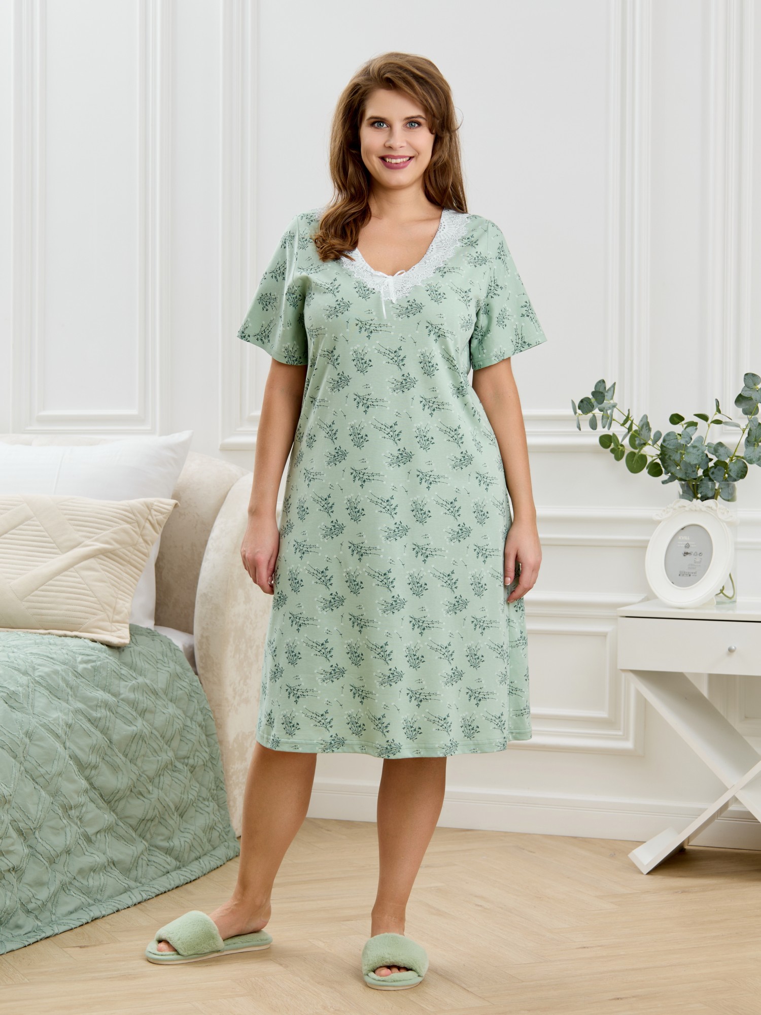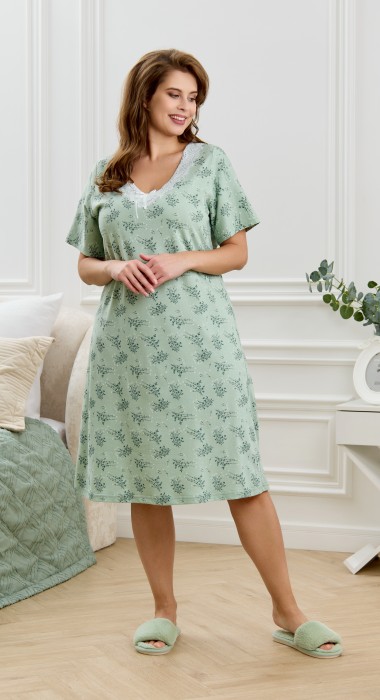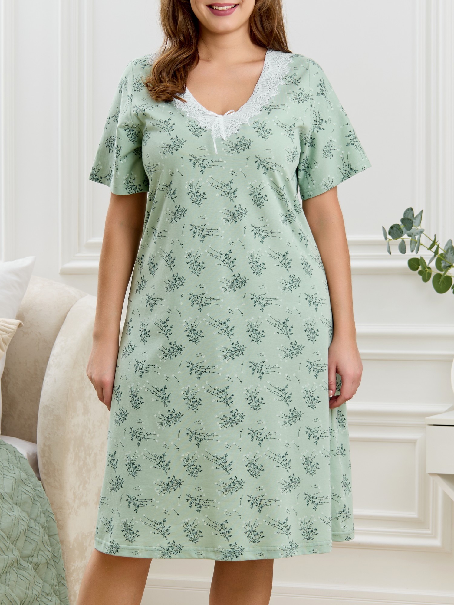 Сорочка женская из трикотажного полотна «кулирка» с набивным рисунком, полуприталенного силуэта, слегка расширенная к низу, с короткими втачными рукавами. Горловина V- образной формы, обработана кружевом с фестонным краем, по центру настрочен декоративный бантик из узкой атласной тесьмы.