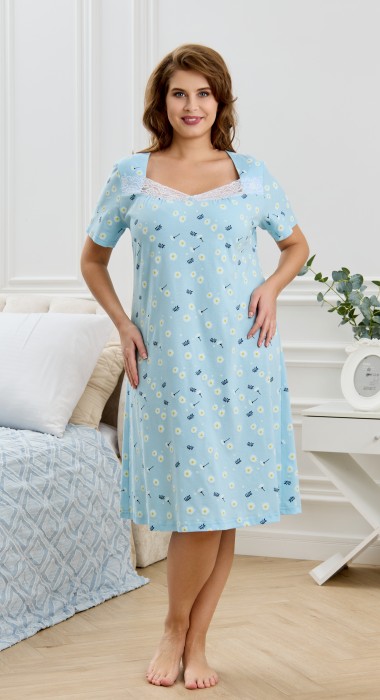 Сорочка женская из трикотажного полотна «кулирка» с набивным рисунком, свободного кроя, слегка расширенная книзу, с короткими втачными рукавами. Полочка – с двойными кокетками, кружевом в шве соединения кокеток с основной деталью и декоративной вставкой «петлей» для достижения небольшого эффекта драпировки. Основная деталь переда присборена по шву притачивания кокетки.