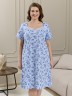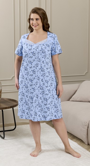 Сорочка женская из трикотажного полотна «кулирка» с набивным рисунком, свободного кроя, слегка расширенная книзу, с короткими втачными рукавами. Полочка – с двойными кокетками, кружевом в шве соединения кокеток с основной деталью и декоративной вставкой «петлей» для достижения небольшого эффекта драпировки. Основная деталь переда присборена по шву притачивания кокетки.