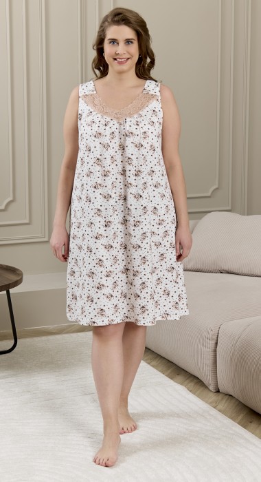 Сорочка женская из трикотажного полотна «кулирка» с набивным рисунком, свободного кроя, расширенная книзу, без рукавов на широких бретелях, с углублённой V-образной горловиной. Полочка с притачной кокеткой, состоящей из двух деталей. На нижней части полочки по шву притачивания кружевной кокетки заложены симметричные складки, горловина спинки и проймы окантованы основным материалом.