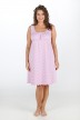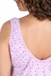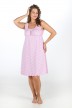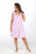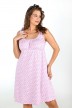 Сорочка женская из трикотажного полотна «кулирка» с набивным рисунком, расширенная книзу, без рукавов, с расширенной, углубленной горловиной овальной формы и притачной кокеткой по переду. Срезы пройм и горловины, а также шов притачивания кокетки, обработаны фасонной эластичной тесьмой с кружевным краем. Низ изделия обработан узкой обметочной строчкой.