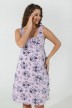 Сорочка женская из трикотажного полотна «кулирка» с набивным рисунком, расширенная книзу, без рукавов, с расширенной, углубленной горловиной овальной формы и притачной кокеткой по переду. Срезы пройм и горловины, а также шов притачивания кокетки, обработаны фасонной эластичной тесьмой с кружевным краем. Низ изделия обработан узкой обметочной строчкой.