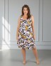 Сорочка женская из трикотажного полотна «кулирка» с набивным рисунком, расширенная книзу, без рукавов, с расширенной, углубленной горловиной овальной формы и притачной кокеткой по переду. Срезы пройм и горловины, а также шов притачивания кокетки, обработаны фасонной эластичной тесьмой с кружевным краем. Низ изделия обработан узкой обметочной строчкой.