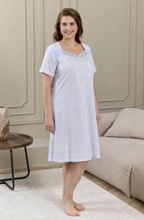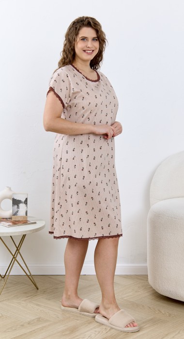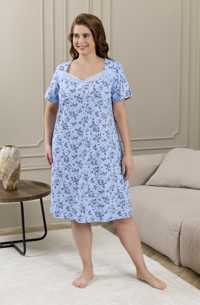 Сорочка женская из трикотажного полотна «кулирка» с набивным рисунком, свободного покроя, с цельнокроеными рукавами и овальным вырезом горловины. Нижние срезы рукавов, горловина, низ изделия отделаны узким кружевом контрастного цвета.