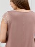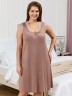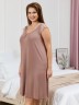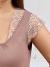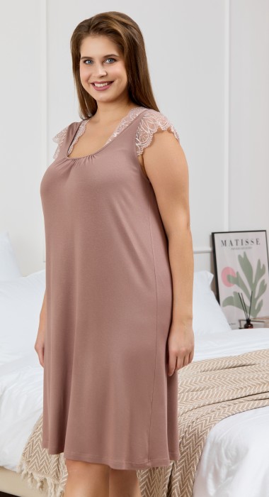 Сорочка женская из гладкокрашеного вискозного трикотажного полотна, свободного покроя, слегка расширенная к низу, с втачными рукавами - «крылышками», выполненными из кружева и втачанными в верхние части пройм. Расширенная иуглубленная горловина с кружевными отделочными деталями и сборкой по центру, окантована основным материалом.