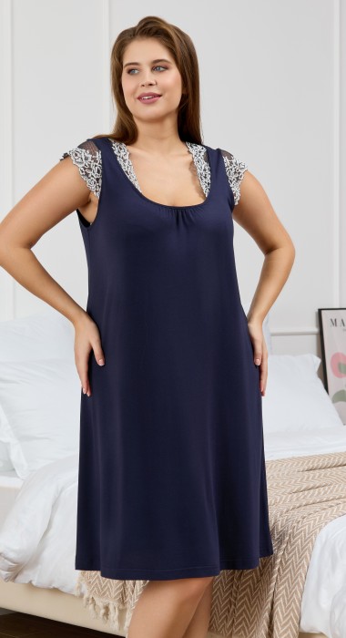 Сорочка женская из гладкокрашеного вискозного трикотажного полотна, свободного покроя, слегка расширенная к низу, с втачными рукавами - «крылышками», выполненными из кружева и втачанными в верхние части пройм. Расширенная иуглубленная горловина с кружевными отделочными деталями и сборкой по центру, окантована основным материалом.