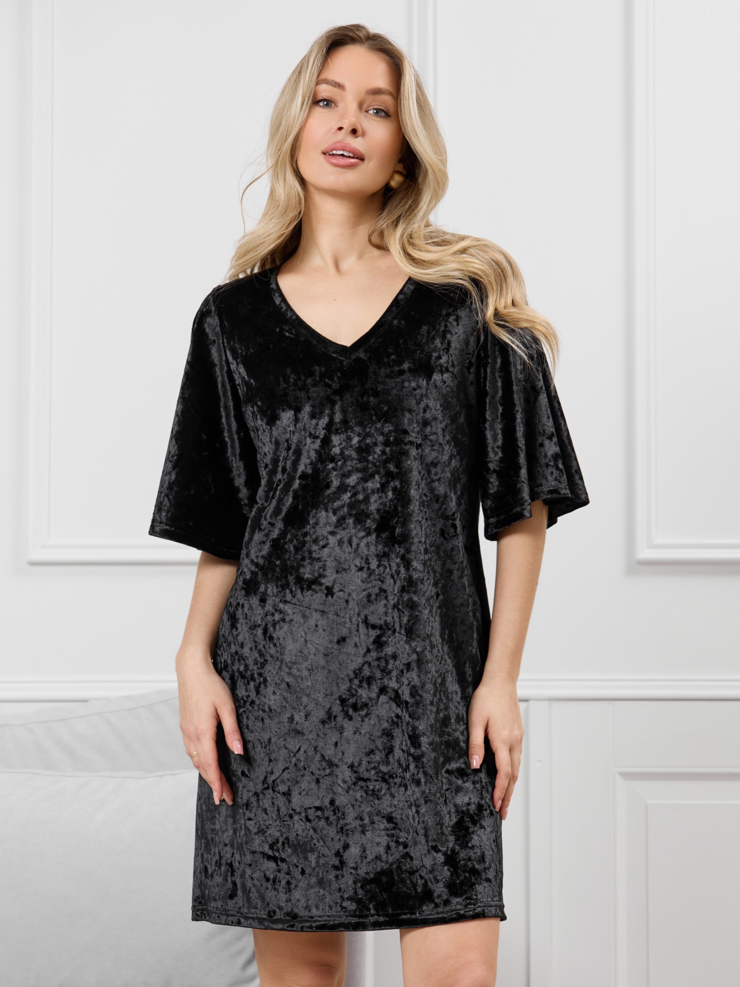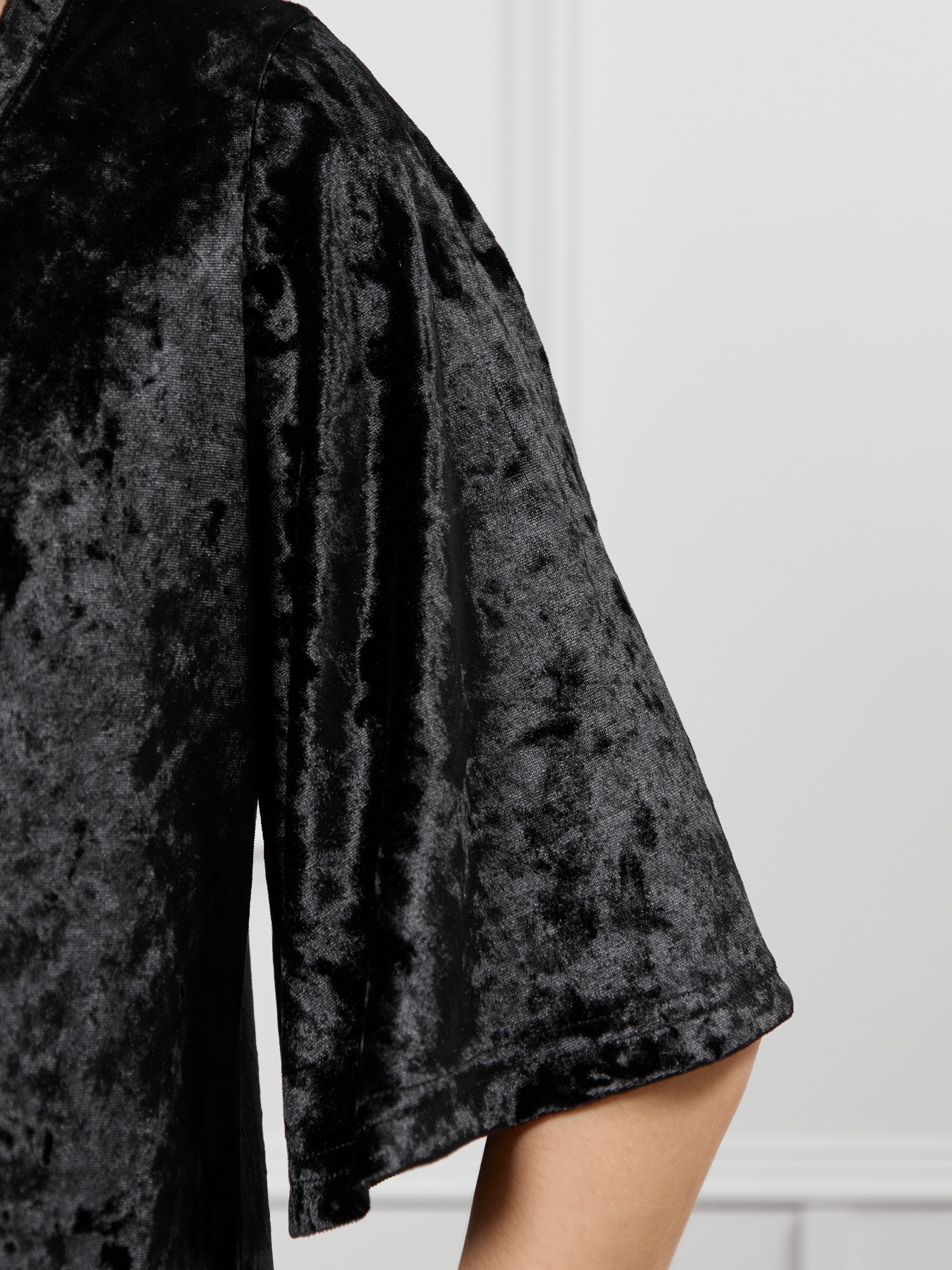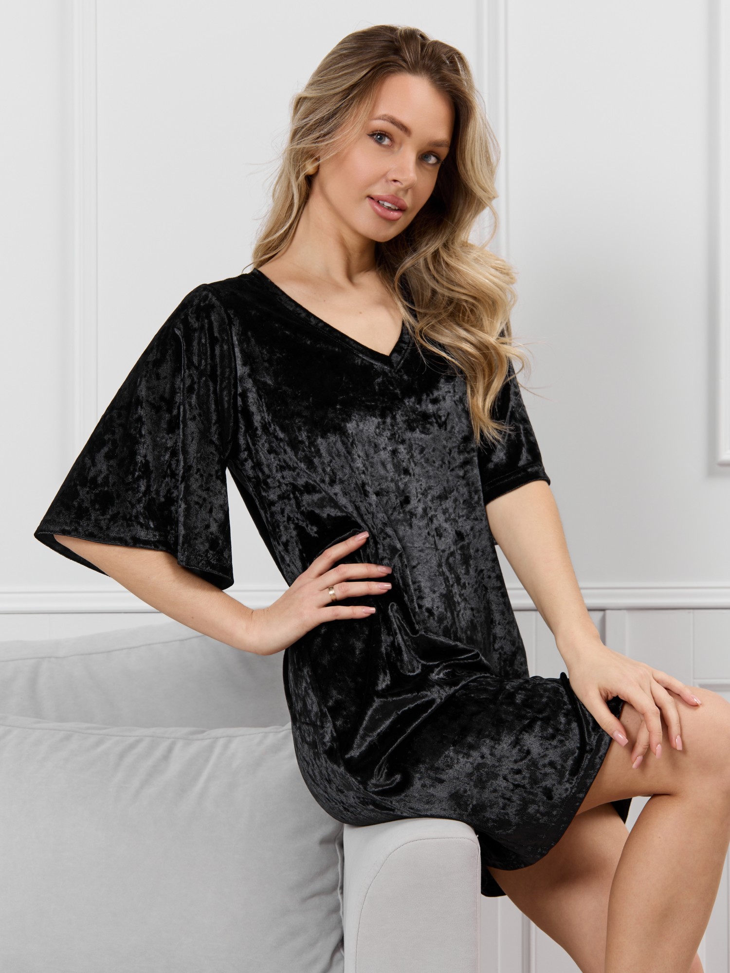 Туника молодежная из гладкокрашенного полотна «велюр стрейч» с мраморным эффектом, прямого силуэта слегка расширенная книзу, с горловиной V-образной формы, обработанной втачной планкой, с рукавами длиной до локтя, расширенные книзу в форме «конуса».