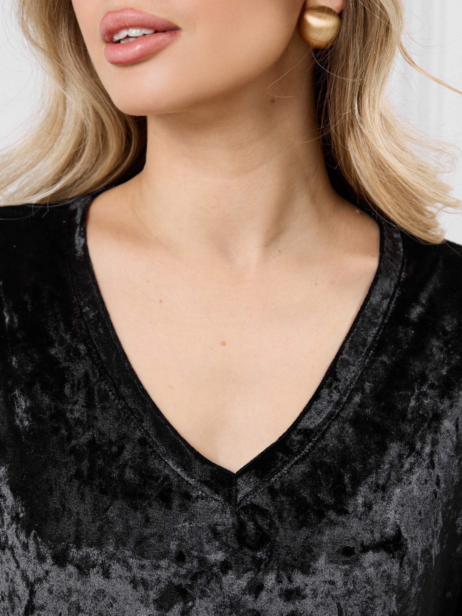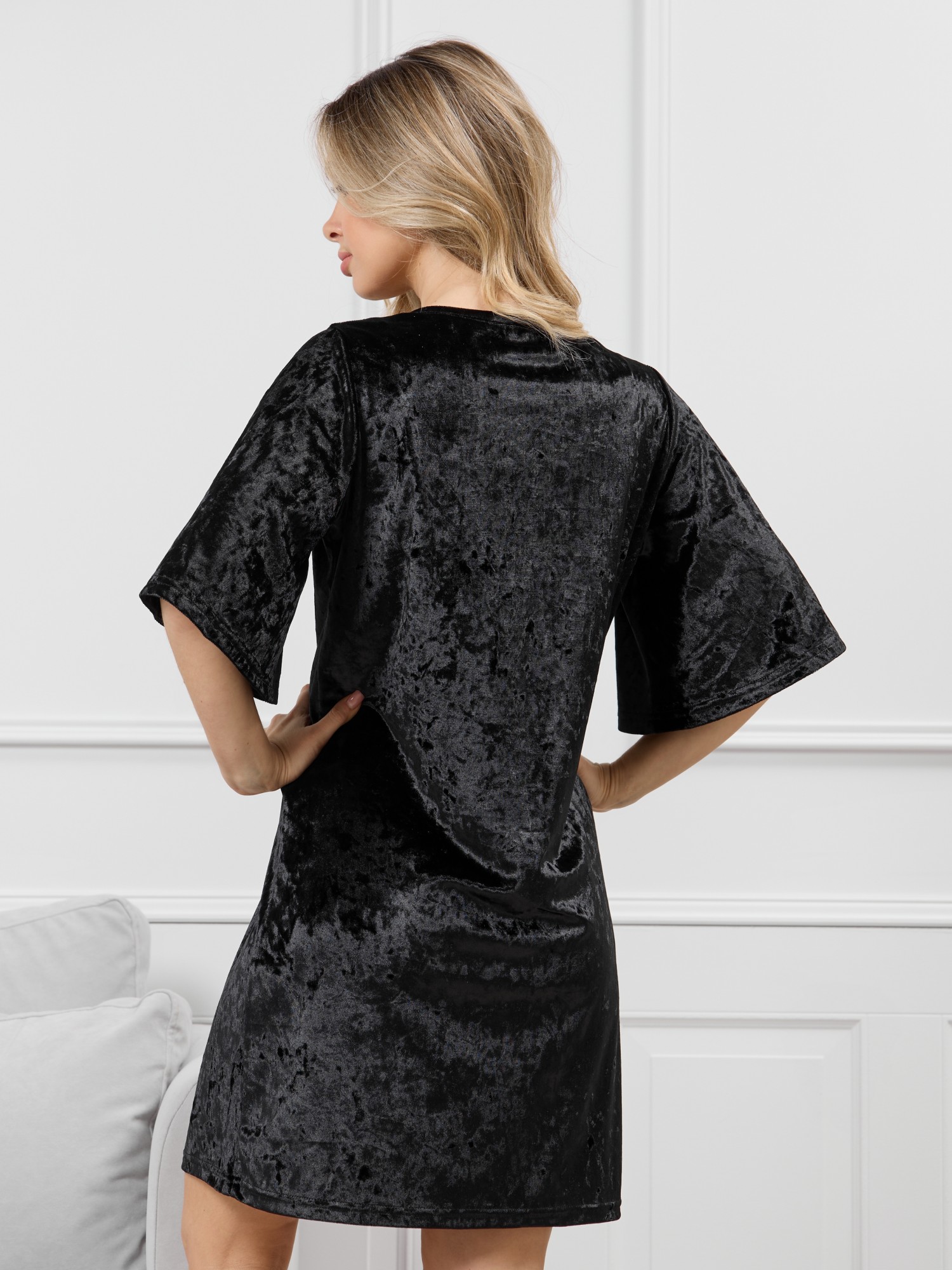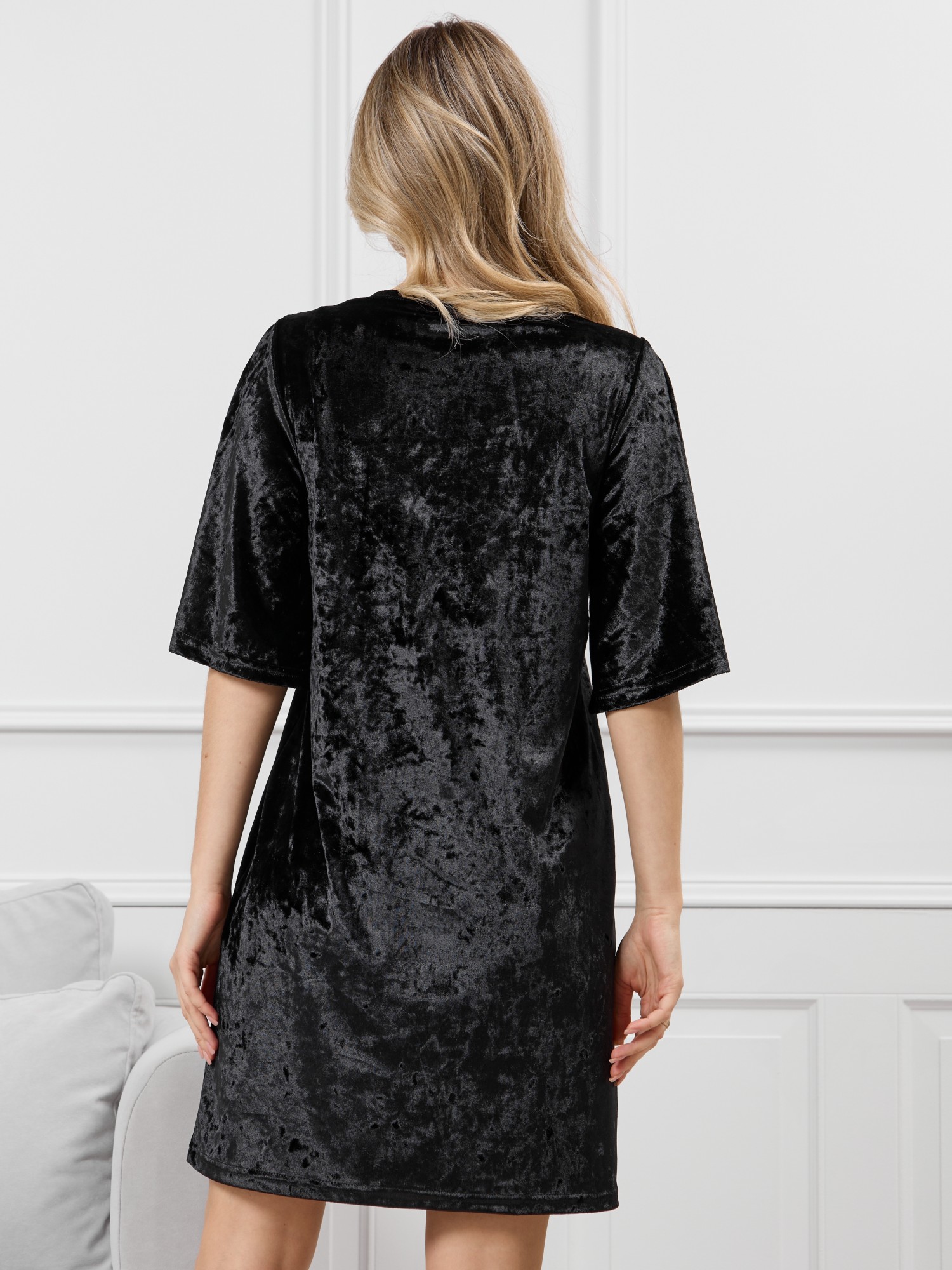 Туника молодежная из гладкокрашенного полотна «велюр стрейч» с мраморным эффектом, прямого силуэта слегка расширенная книзу, с горловиной V-образной формы, обработанной втачной планкой, с рукавами длиной до локтя, расширенные книзу в форме «конуса».