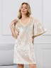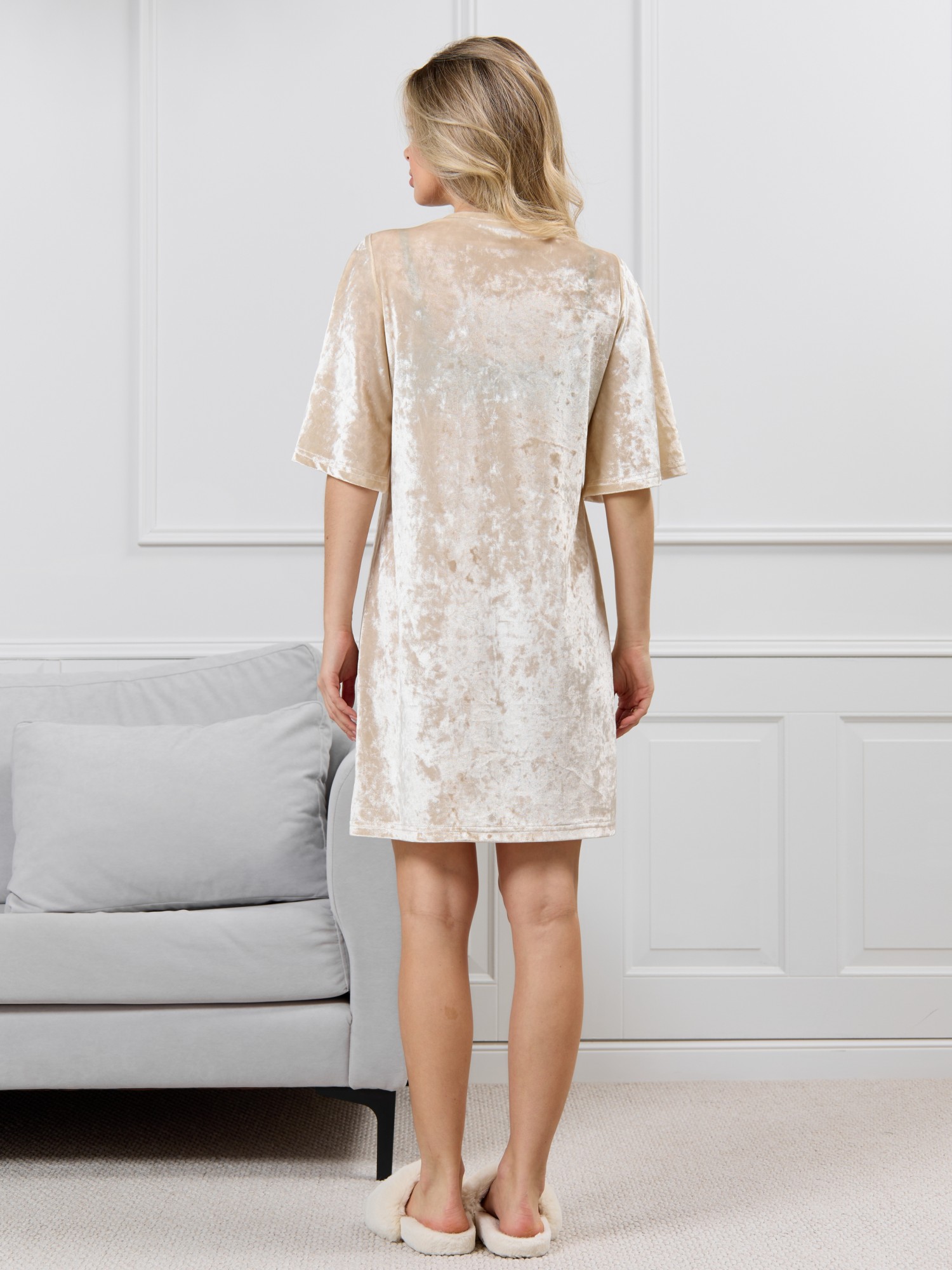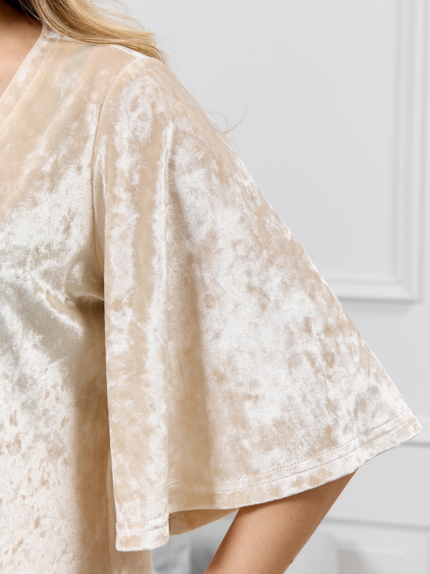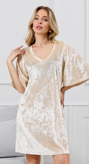 Туника молодежная из гладкокрашенного полотна «велюр стрейч» с мраморным эффектом, прямого силуэта слегка расширенная книзу, с горловиной V-образной формы, обработанной втачной планкой, с рукавами длиной до локтя, расширенные книзу в форме «конуса».