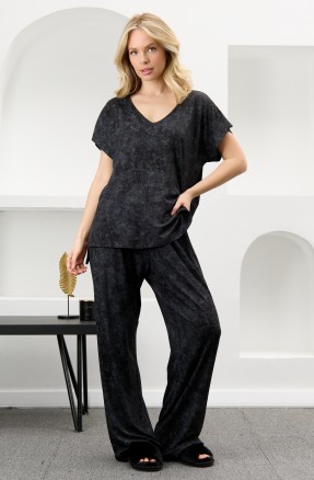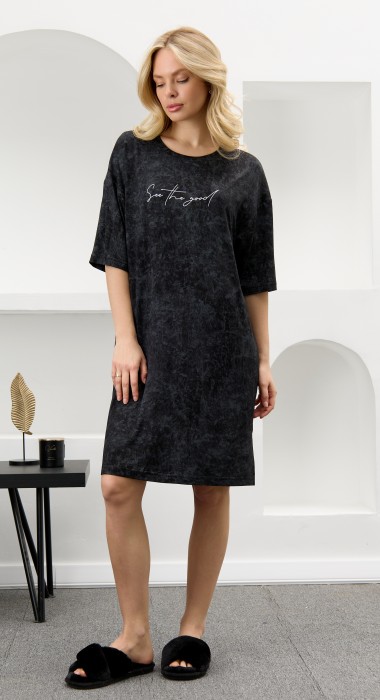 Туника женская из гладкокрашенного вискозного полотна с эффектом «варенка», свободного покроя, с втачными рукавами длиной до локтя, горловиной овальной формы, обработанной втачной планкой и разрезами в боковых швах. На полочке принт, выполненный в технике «шелкографии».