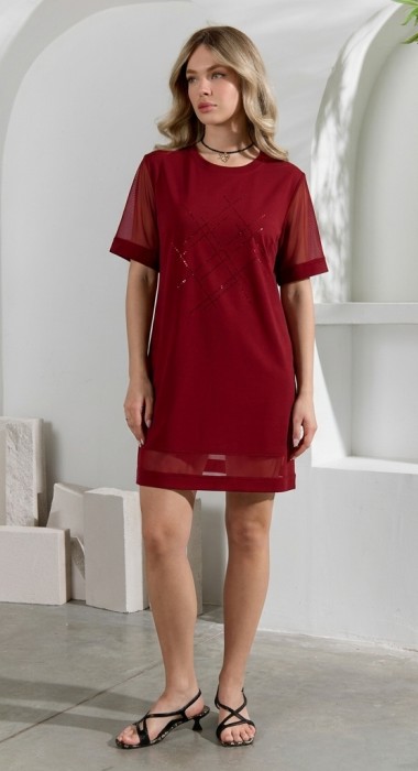Туника молодежная из гладкокрашеного полотна «кулирка» с лайкрой, прямого покроя, с короткими втачными рукавами, горловиной овальной формы, обработанной втачной планкой. По центру полочки выполнена вышивка пайетками. Рукава и декоративная вставка низа изделия - из материала «сетка». Низ рукавов с манжетами.
