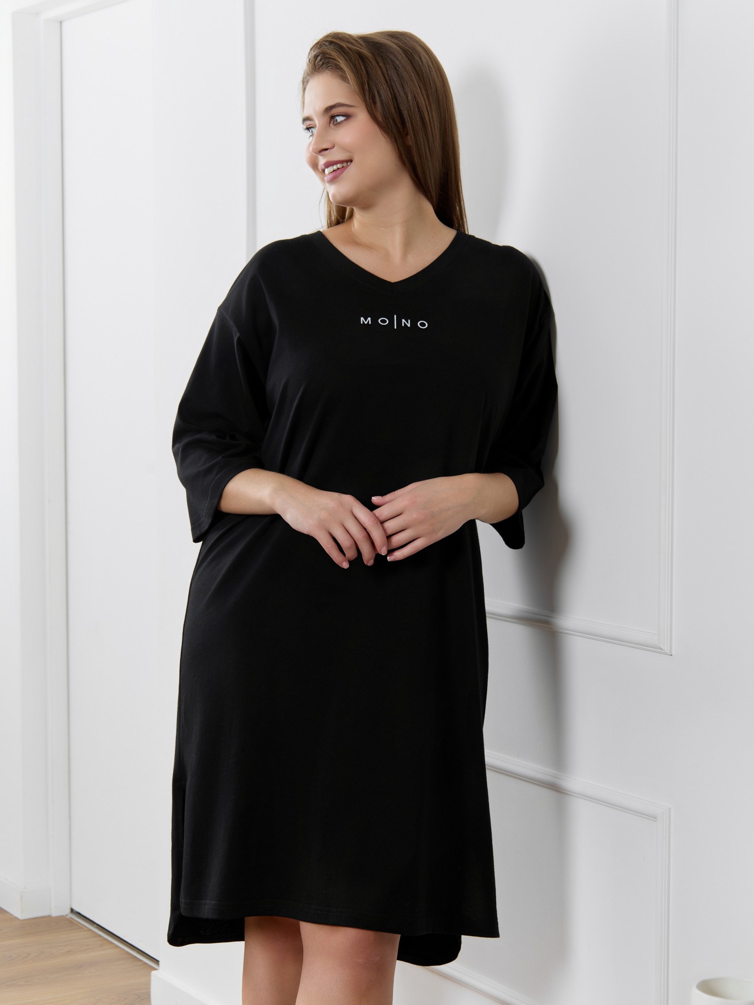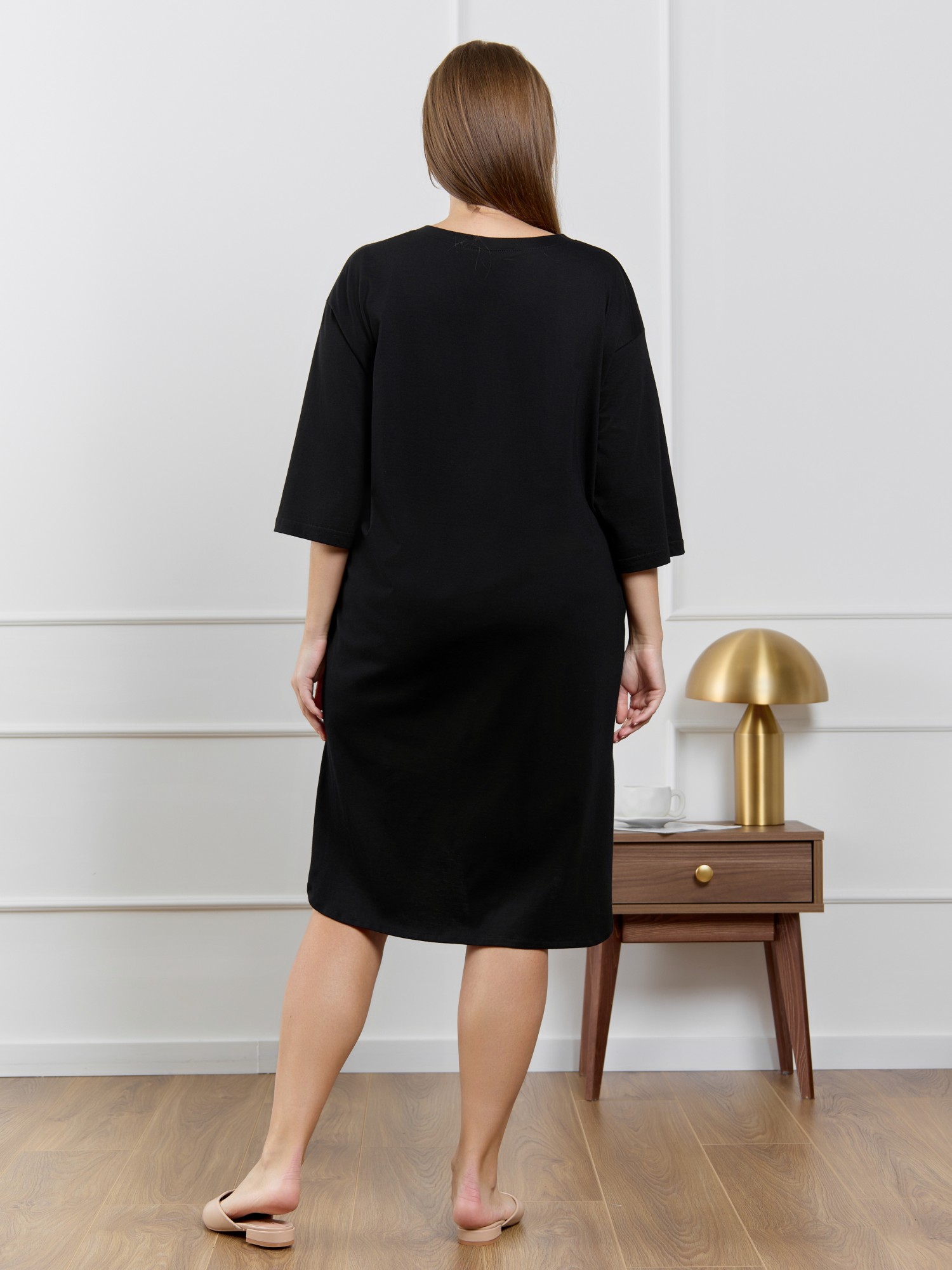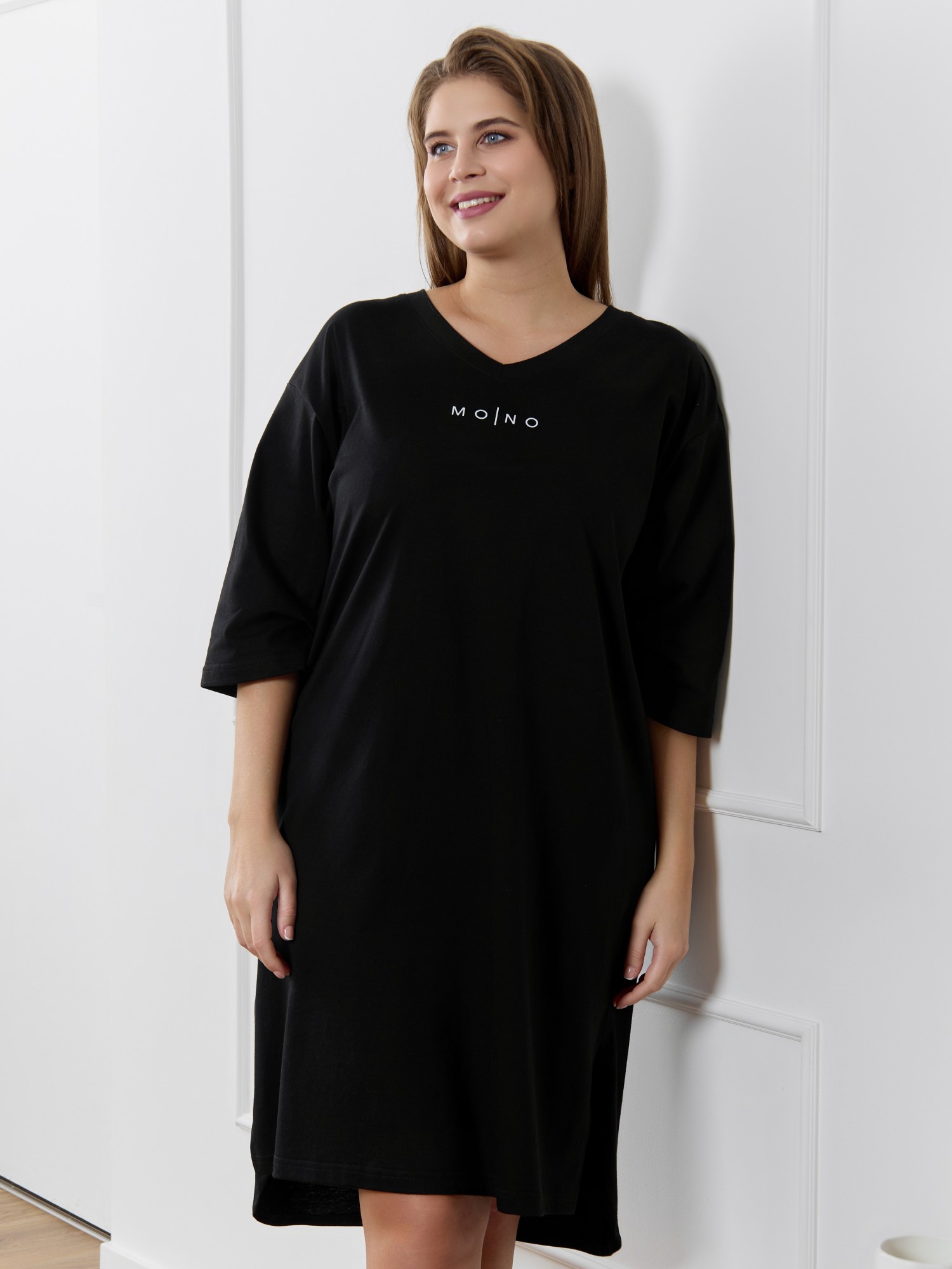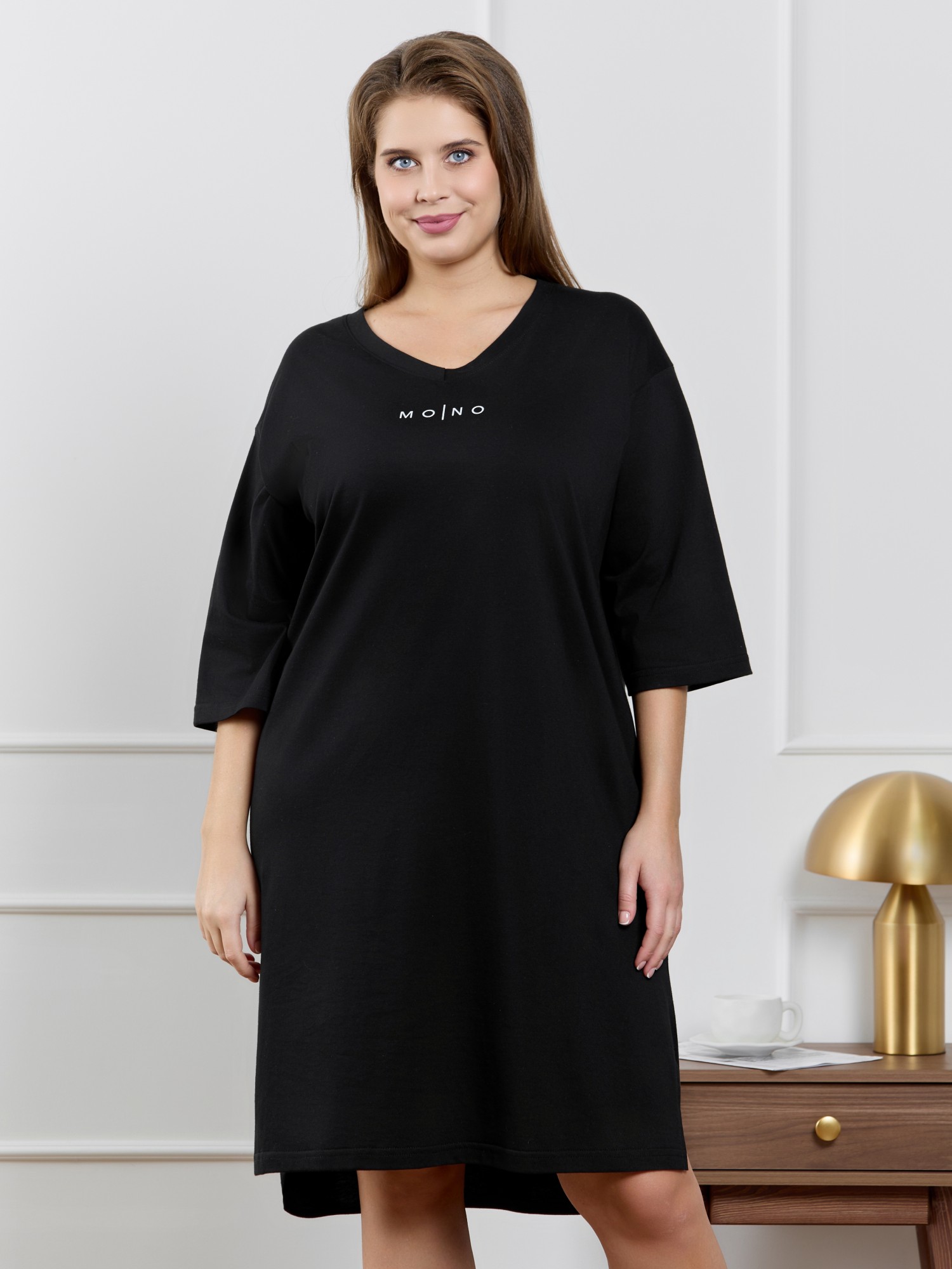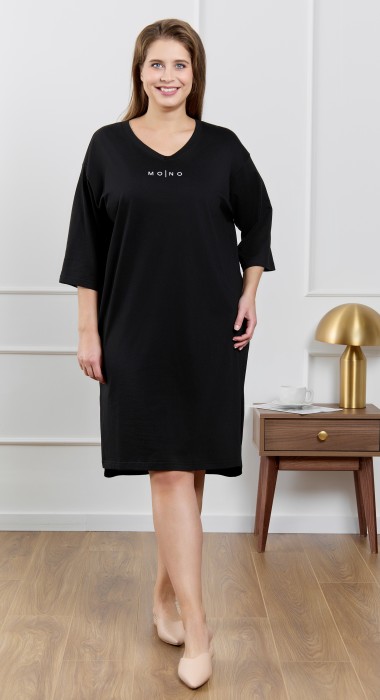 Туника женская из гладкокрашенного полотна «кулирка», свободного кроя, со спущенной линией плеча, втачными рукавами длиной до локтя, горловиной V-образной формы обработанной втачной планкой и принтом на полочке выполненным в технике «шелкографии». Модным элементом является разность длин фигурного низа изделия: низ полочки – прямой укороченный, низ спинки – удлиненный скруглённой формы.