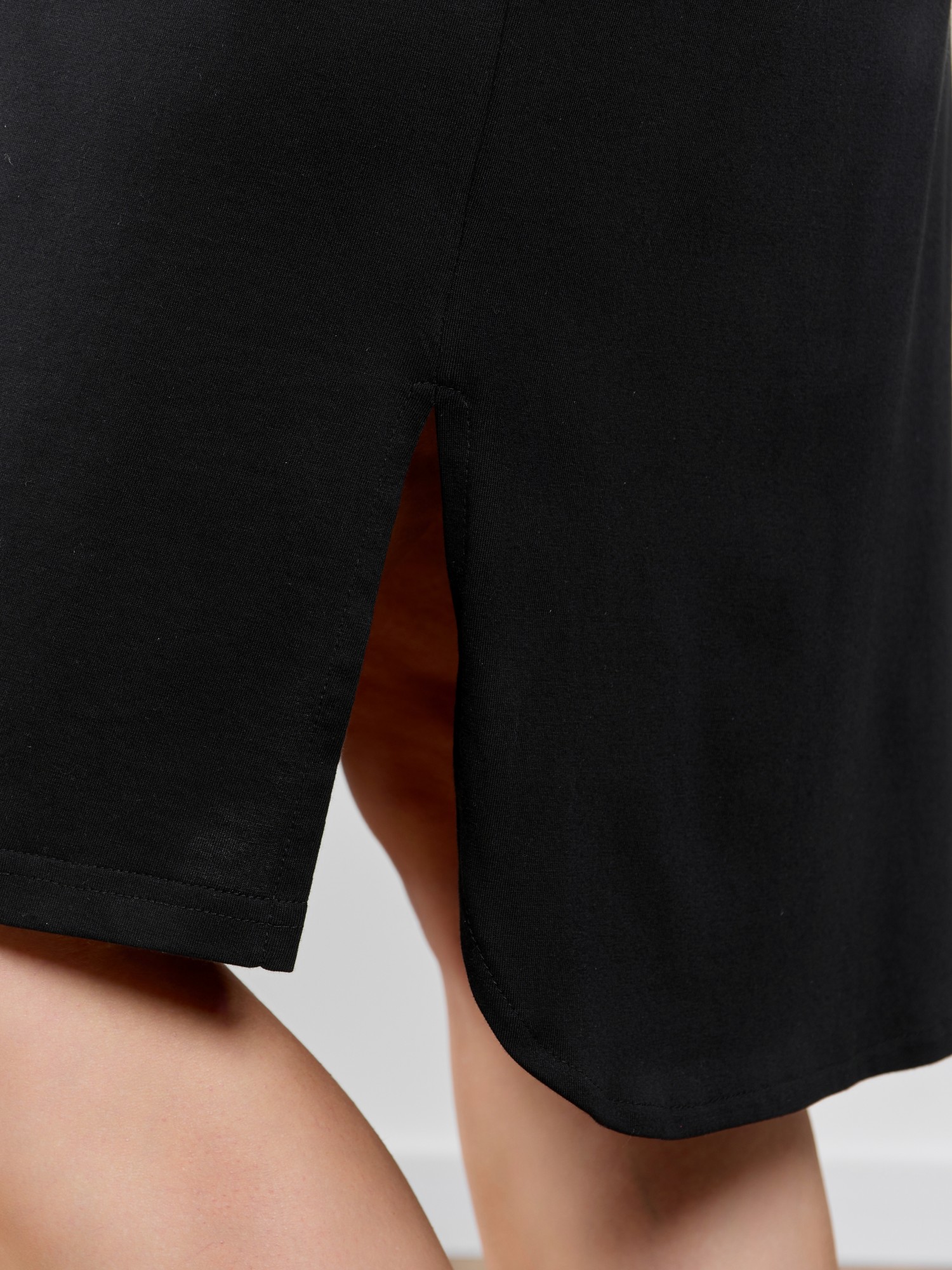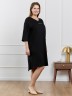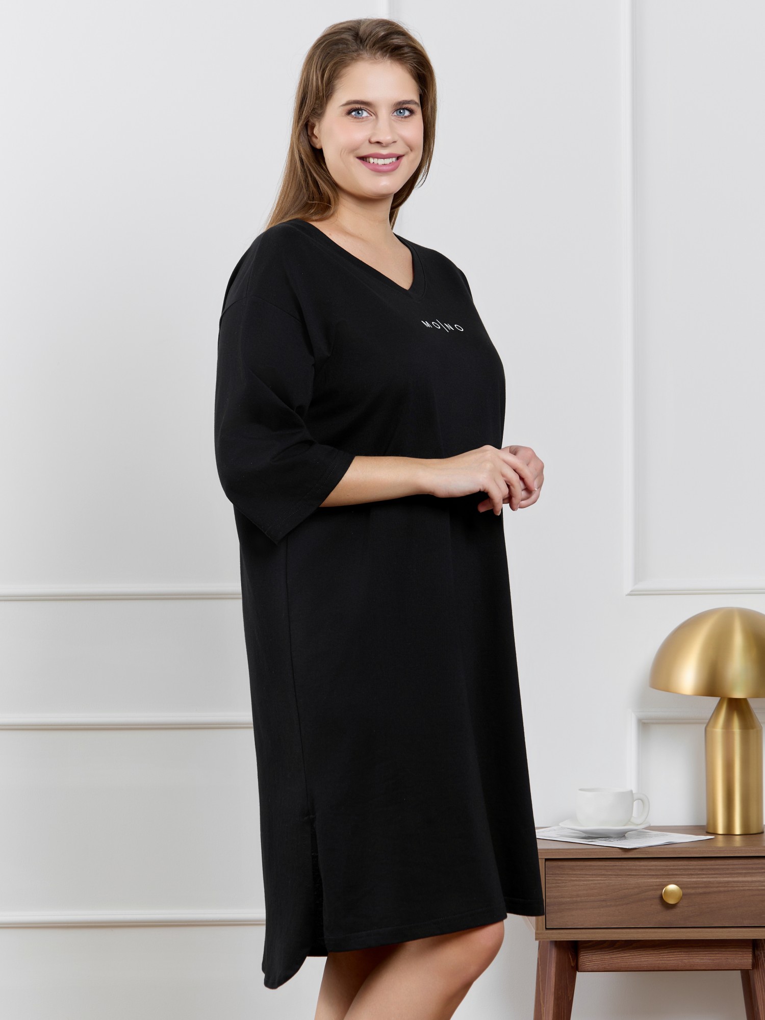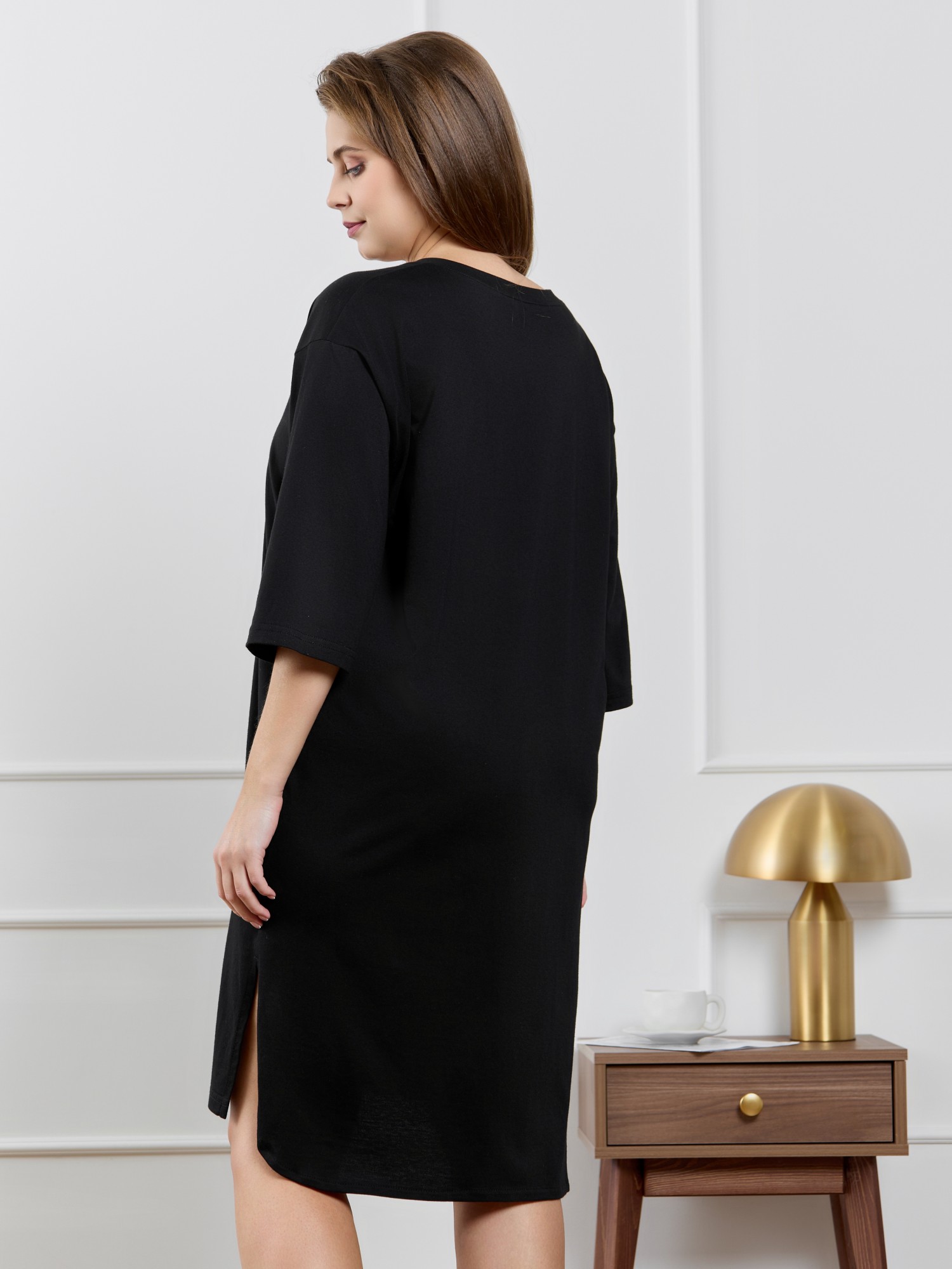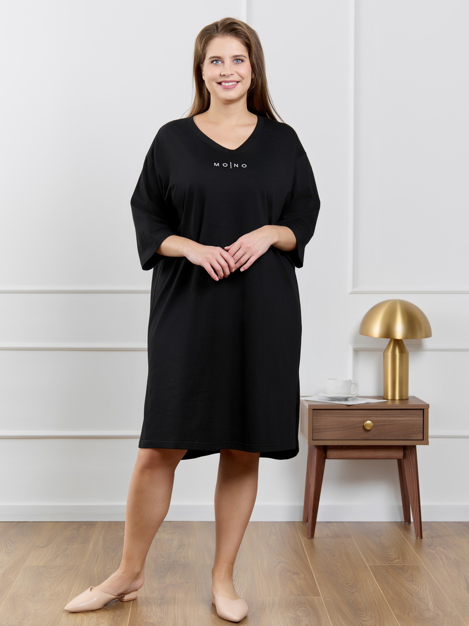 Туника женская из гладкокрашенного полотна «кулирка», свободного кроя, со спущенной линией плеча, втачными рукавами длиной до локтя, горловиной V-образной формы обработанной втачной планкой и принтом на полочке выполненным в технике «шелкографии». Модным элементом является разность длин фигурного низа изделия: низ полочки – прямой укороченный, низ спинки – удлиненный скруглённой формы.