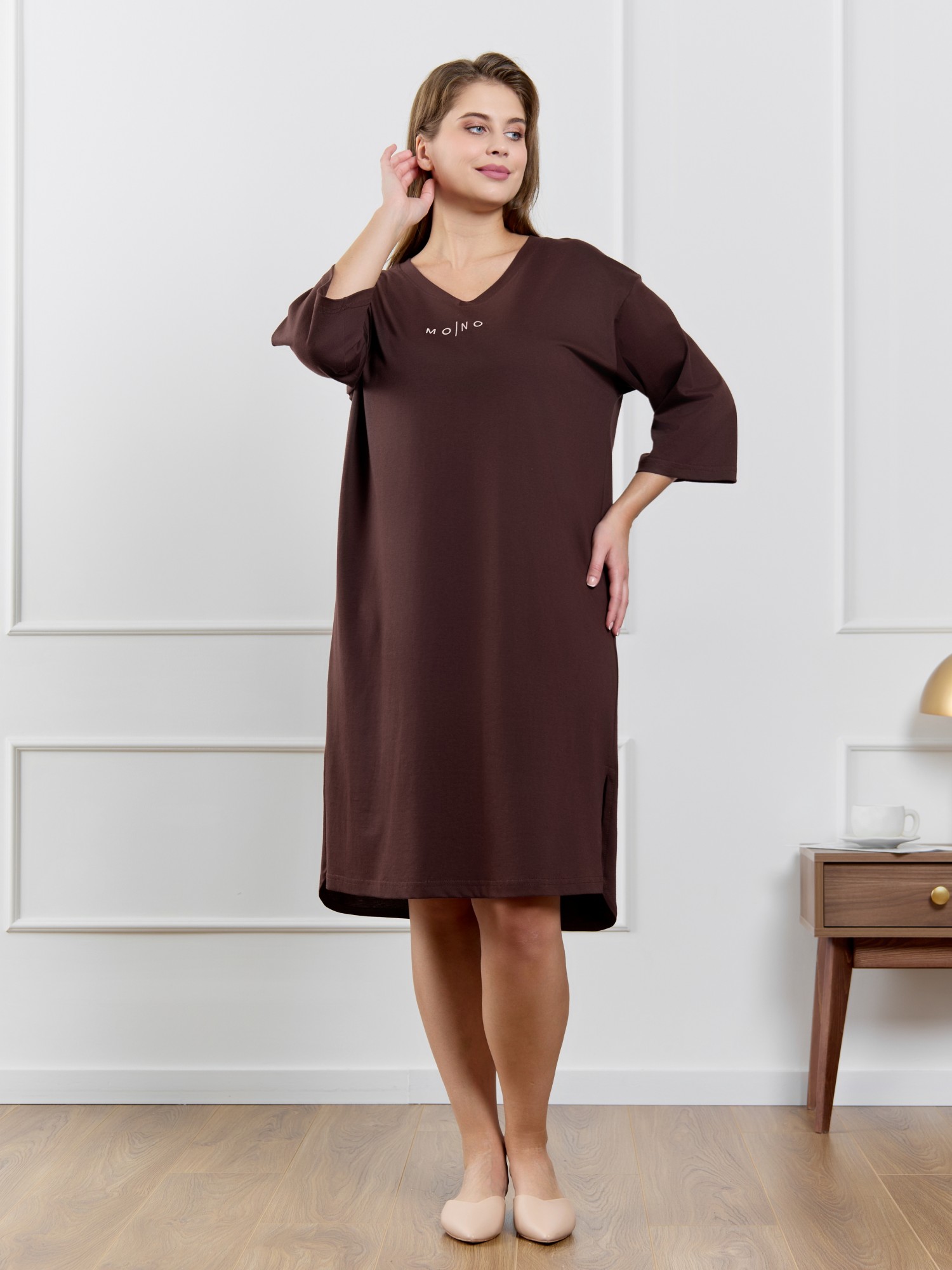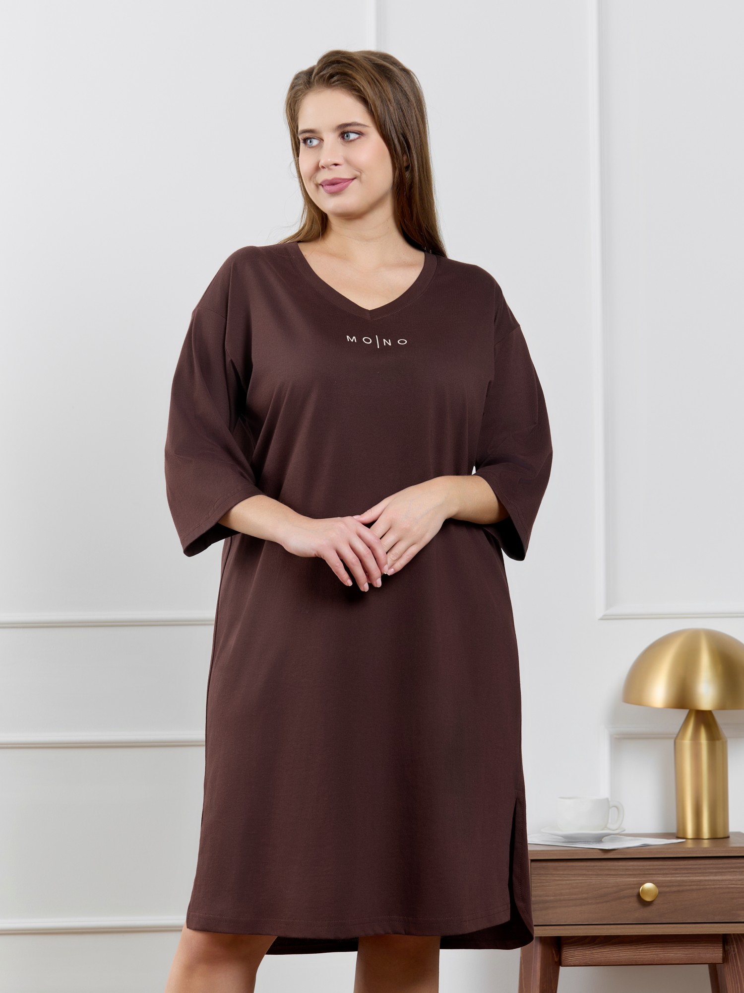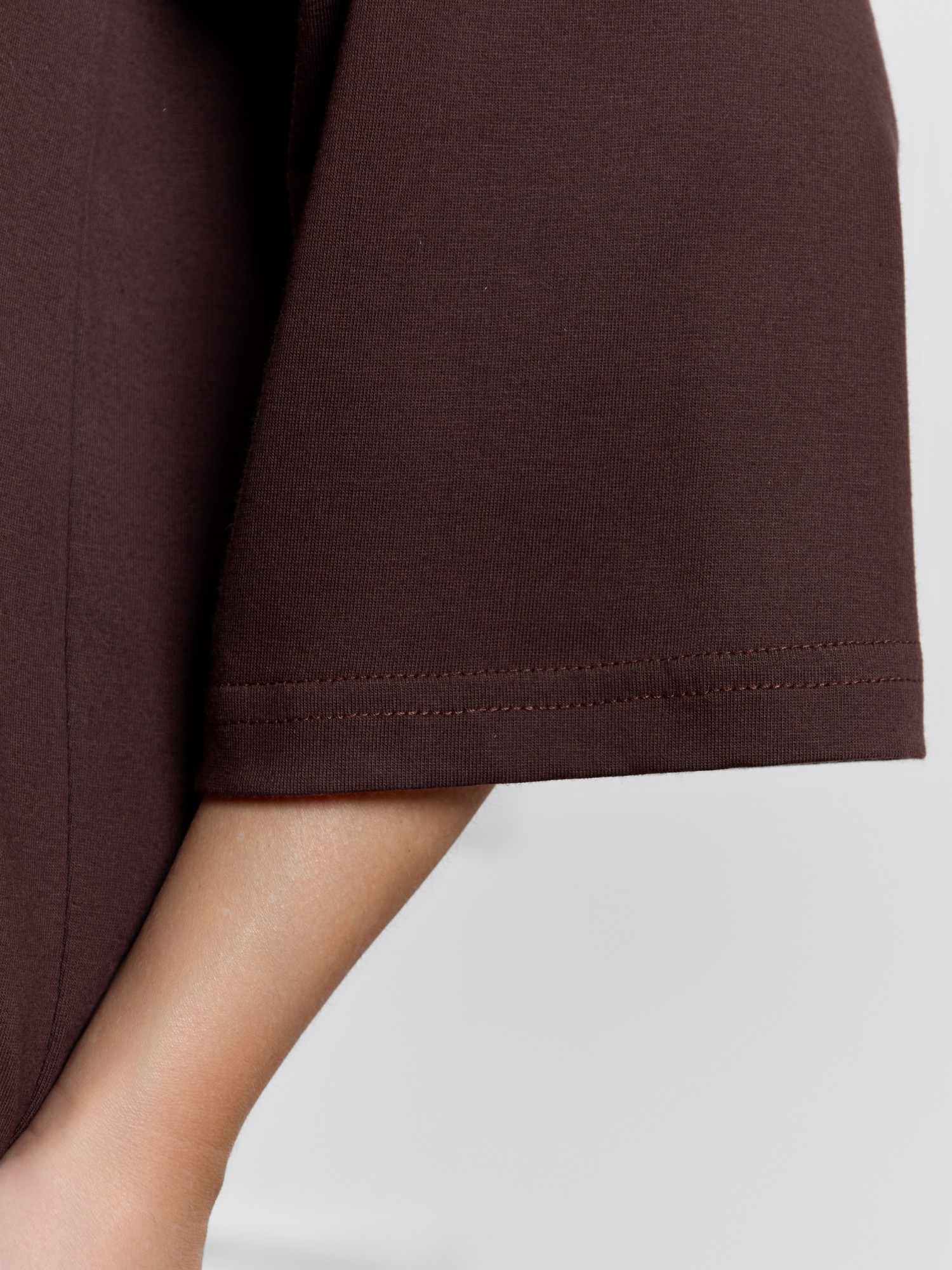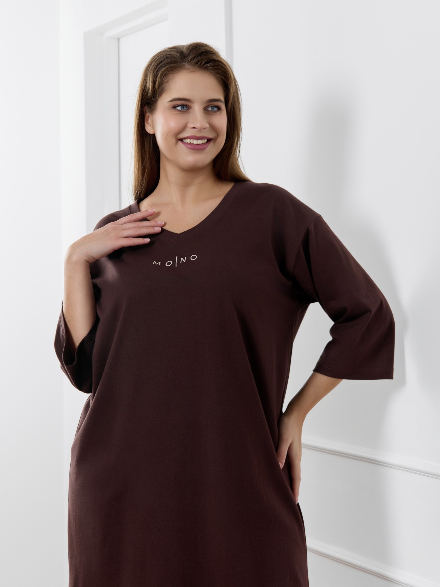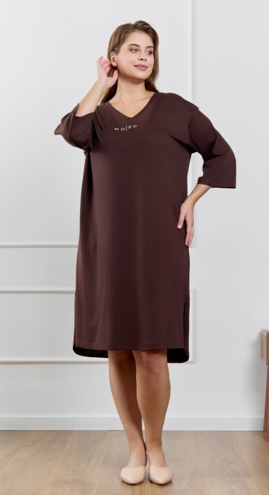 Туника женская из гладкокрашенного полотна «кулирка», свободного кроя, со спущенной линией плеча, втачными рукавами длиной до локтя, горловиной V-образной формы обработанной втачной планкой и принтом на полочке выполненным в технике «шелкографии». Модным элементом является разность длин фигурного низа изделия: низ полочки – прямой укороченный, низ спинки – удлиненный скруглённой формы.
