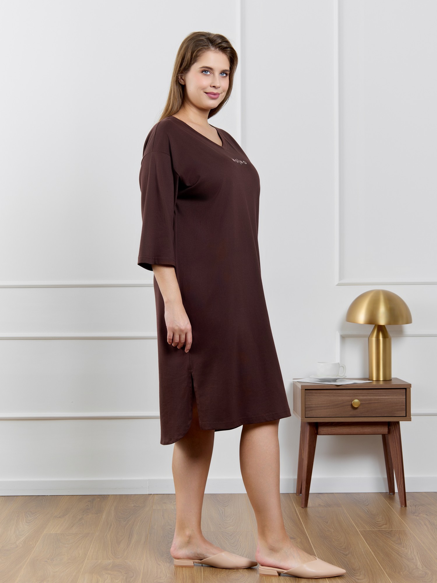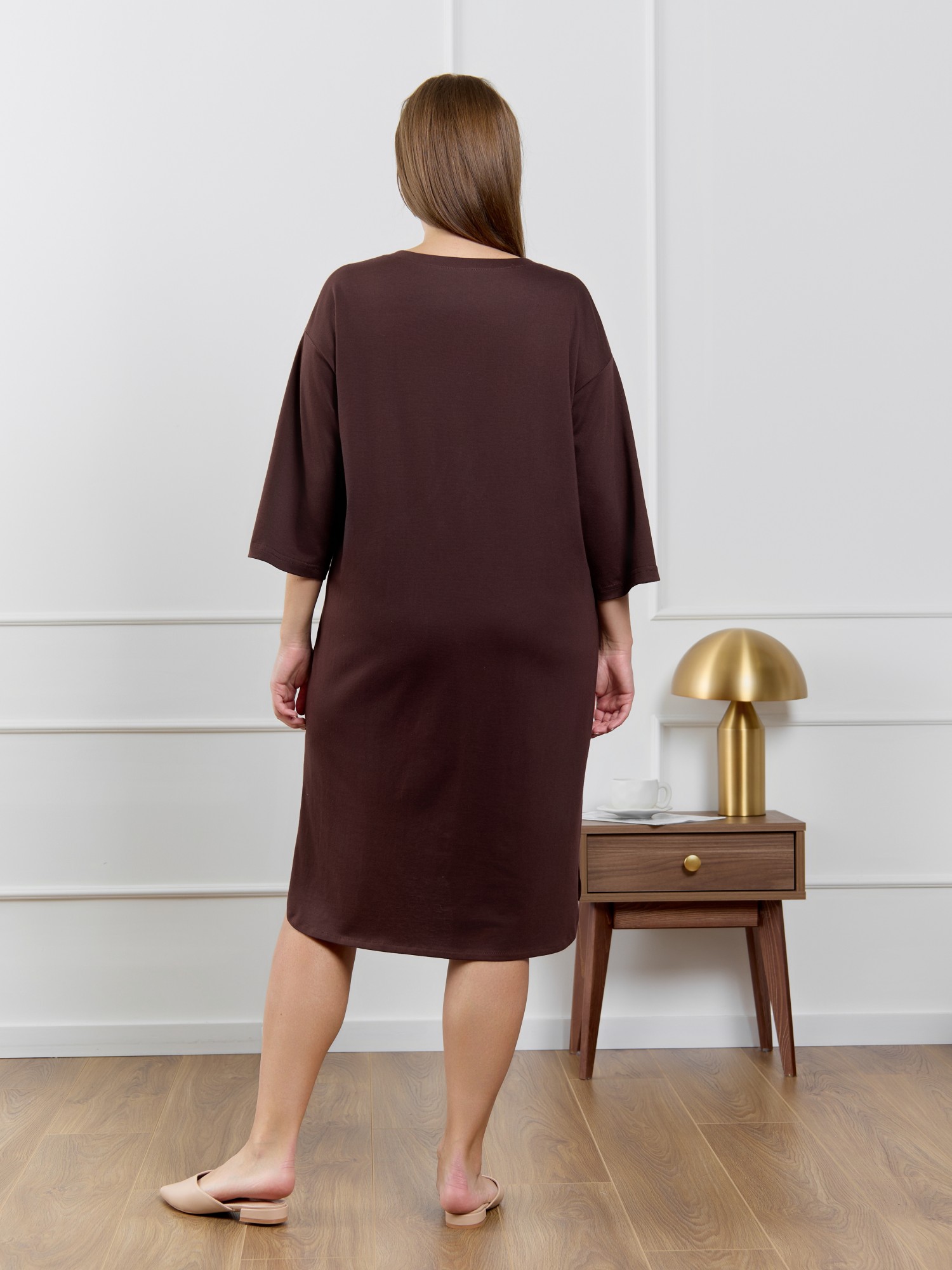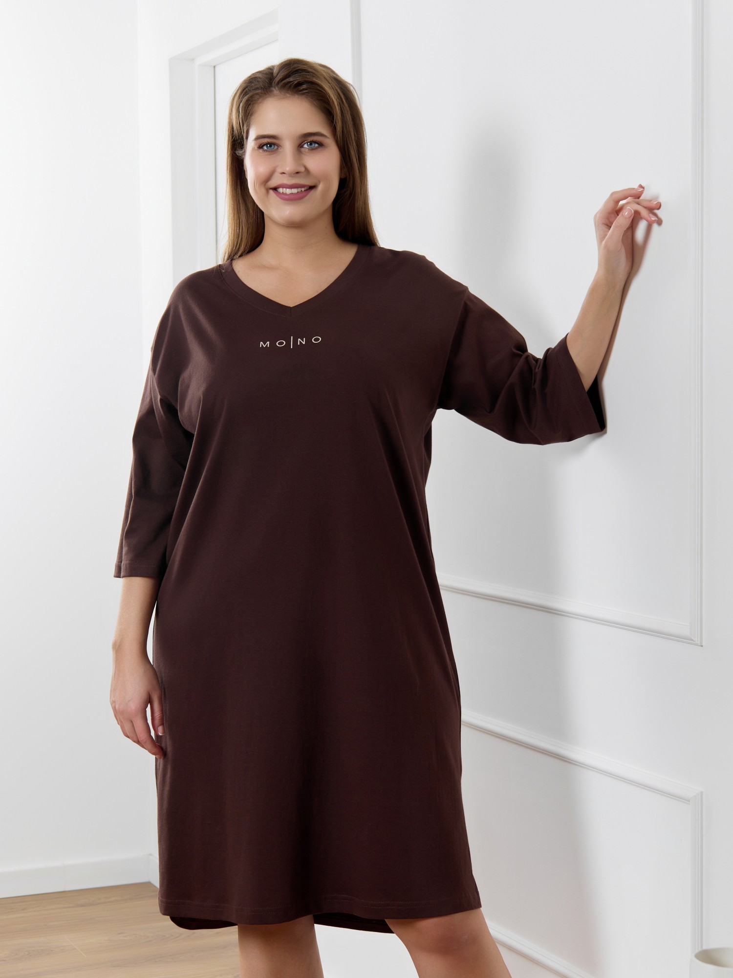 Туника женская из гладкокрашенного полотна «кулирка», свободного кроя, со спущенной линией плеча, втачными рукавами длиной до локтя, горловиной V-образной формы обработанной втачной планкой и принтом на полочке выполненным в технике «шелкографии». Модным элементом является разность длин фигурного низа изделия: низ полочки – прямой укороченный, низ спинки – удлиненный скруглённой формы.
