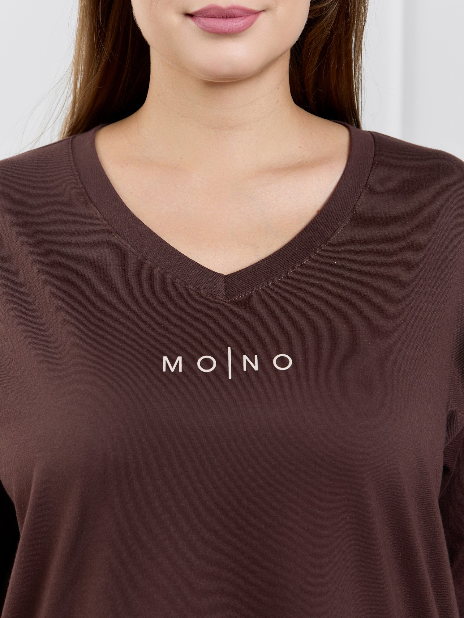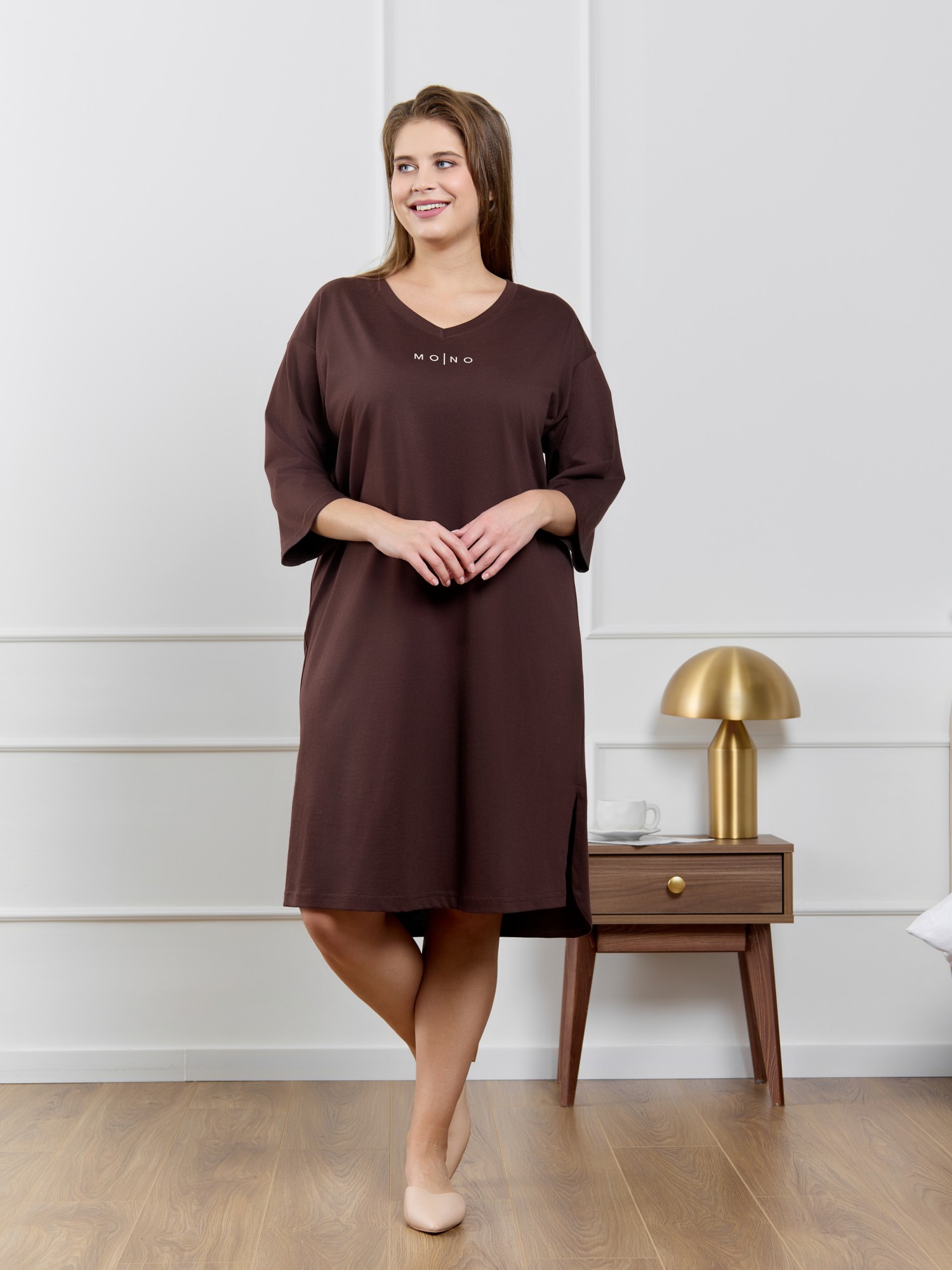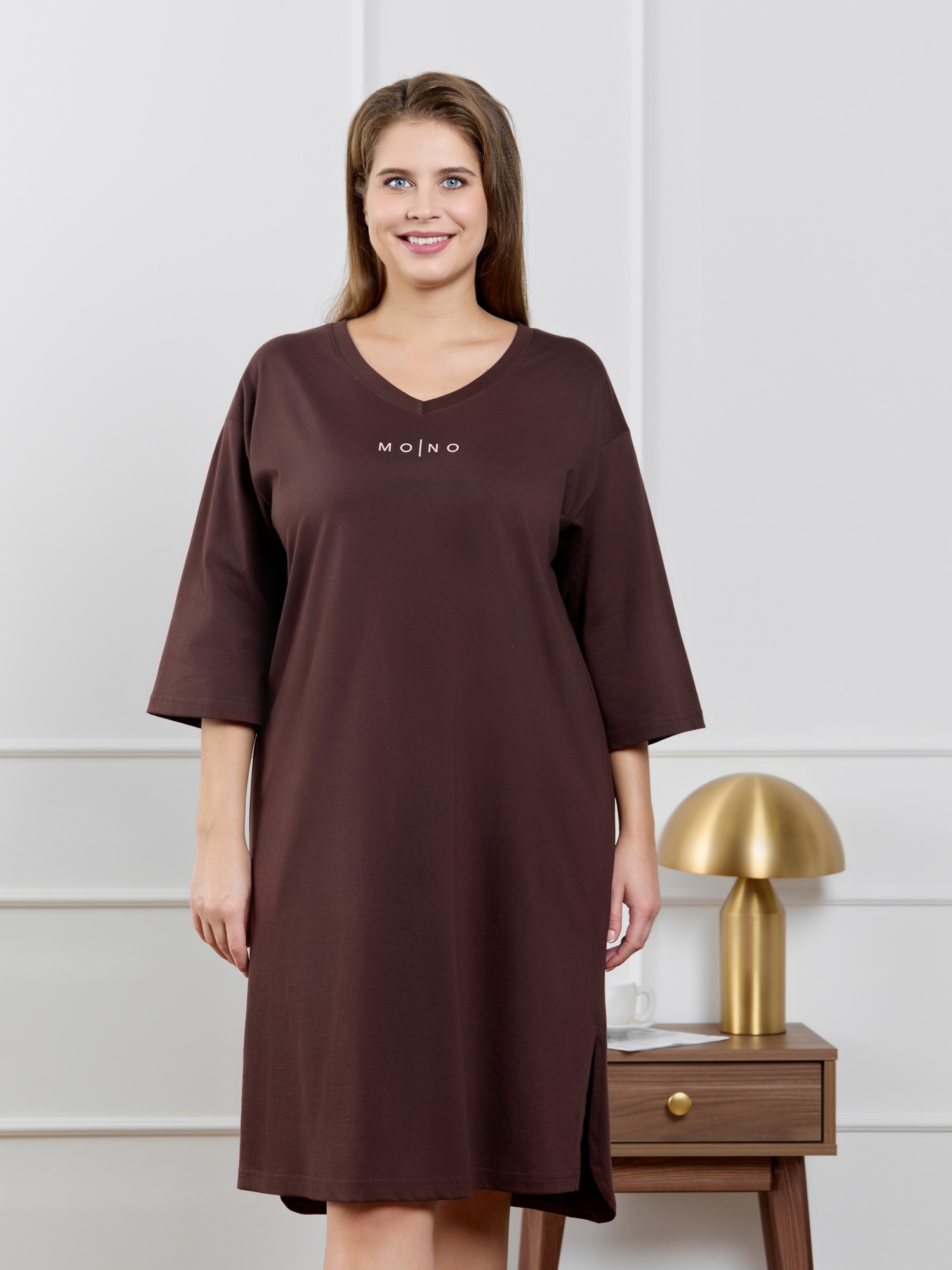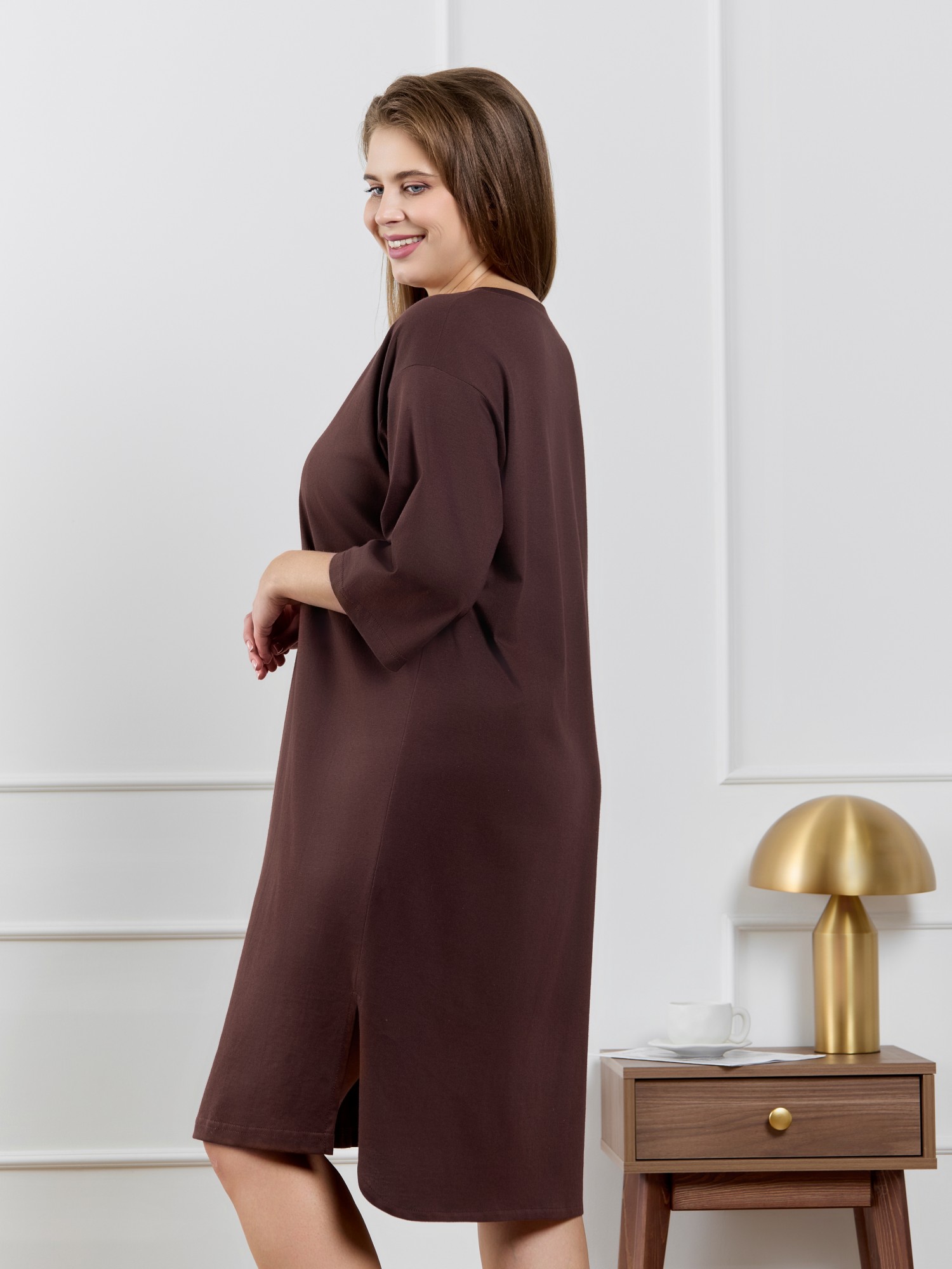 Туника женская из гладкокрашенного полотна «кулирка», свободного кроя, со спущенной линией плеча, втачными рукавами длиной до локтя, горловиной V-образной формы обработанной втачной планкой и принтом на полочке выполненным в технике «шелкографии». Модным элементом является разность длин фигурного низа изделия: низ полочки – прямой укороченный, низ спинки – удлиненный скруглённой формы.