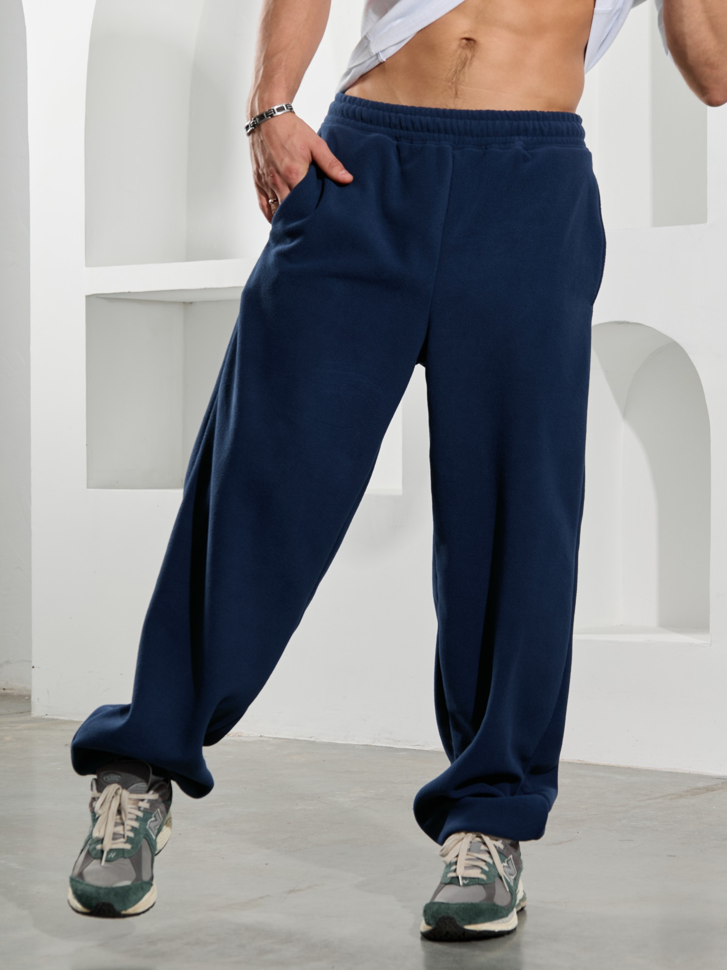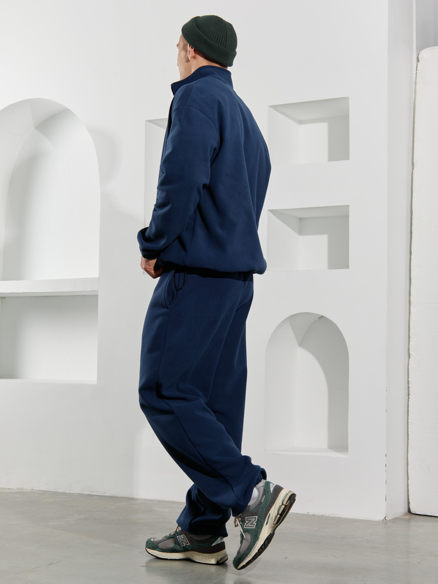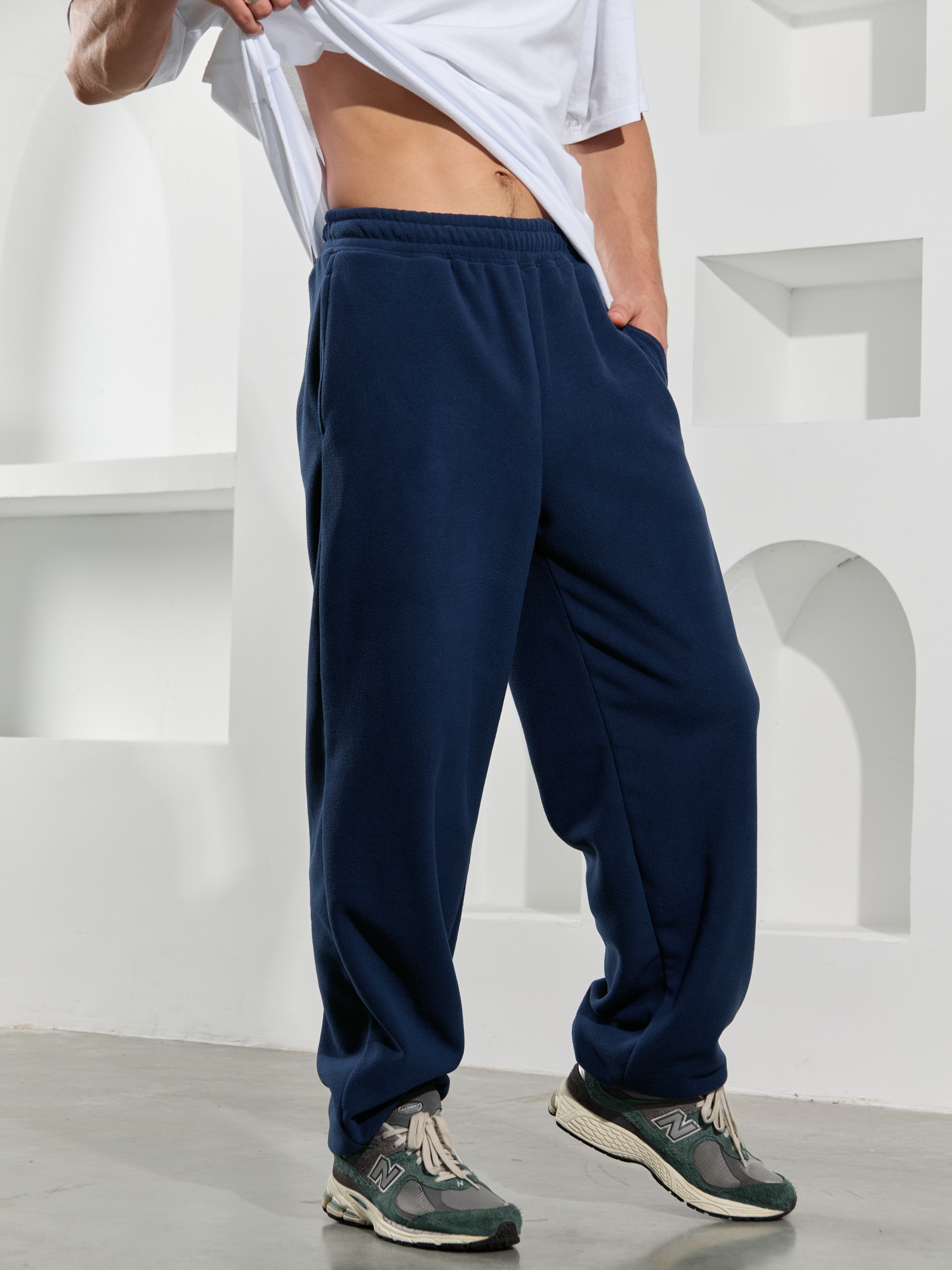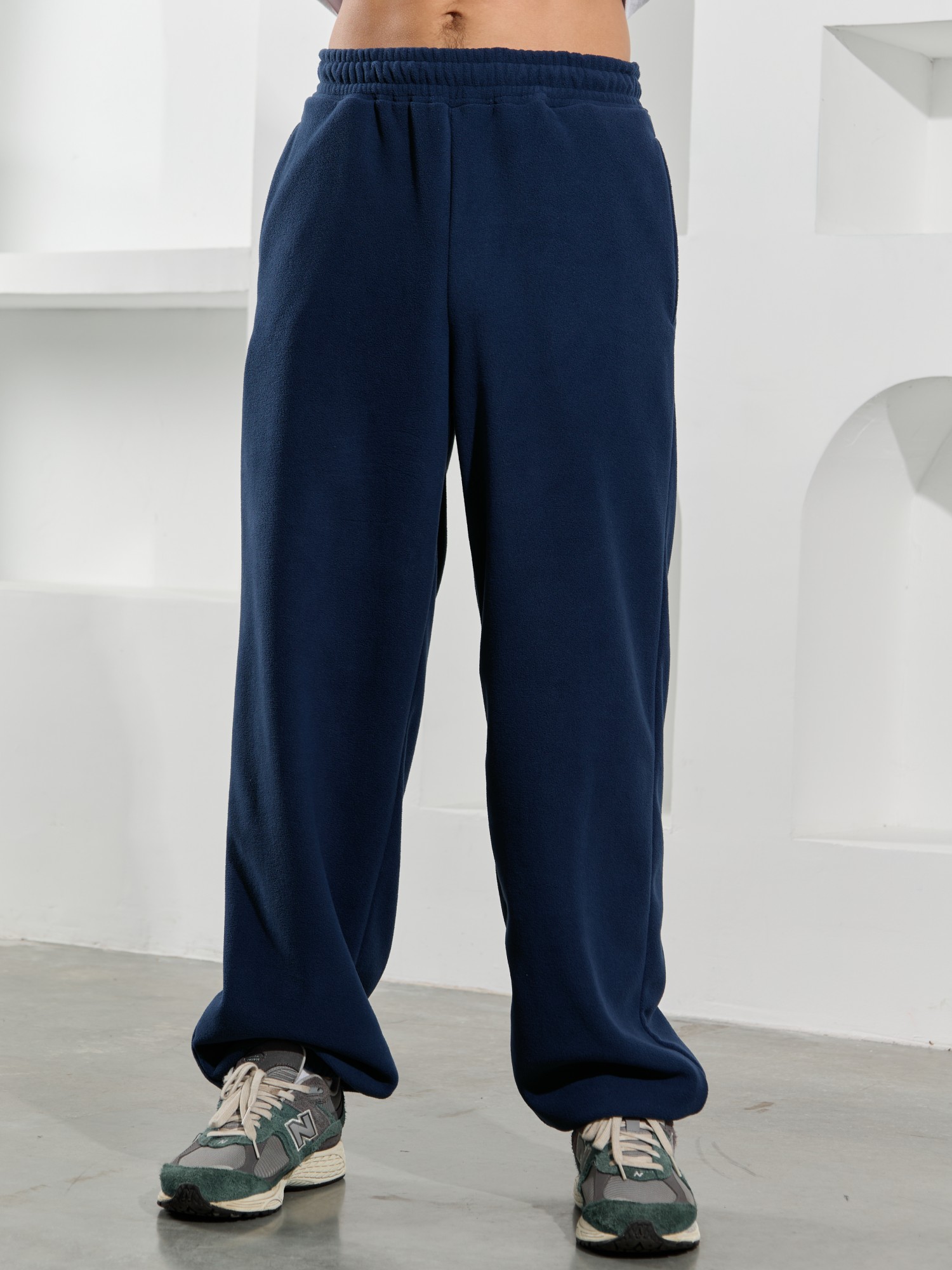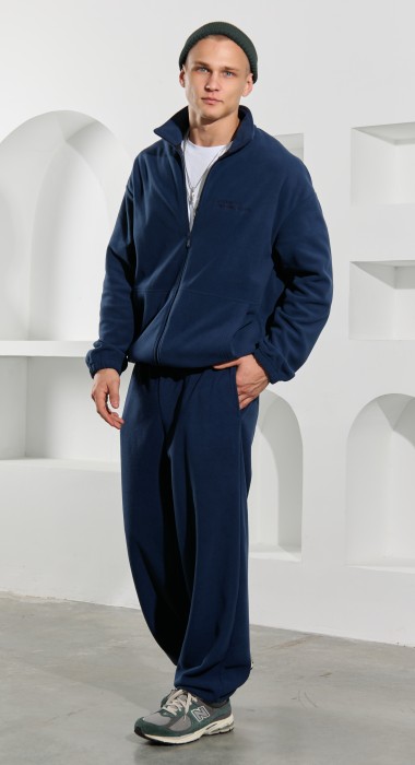 Брюки мужские из флиса, свободного покроя, на притачном поясе с эластичной тесьмой внутри, с карманами в боковых швах. С изнаночной стороны пояса вставлен шнурок для регулирования степени прилегания изделия по талии. Нижние срезы брюк обработаны подгибкой с эластичной тесьмой.