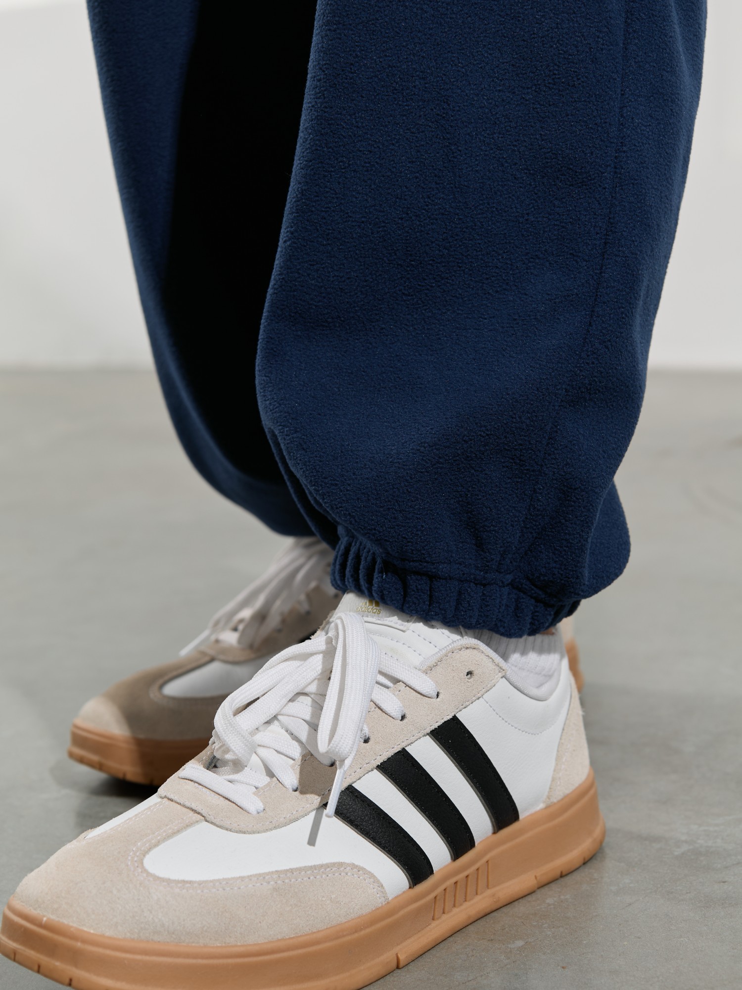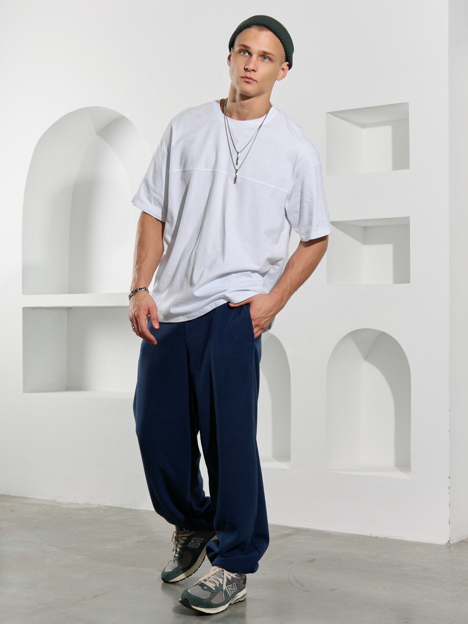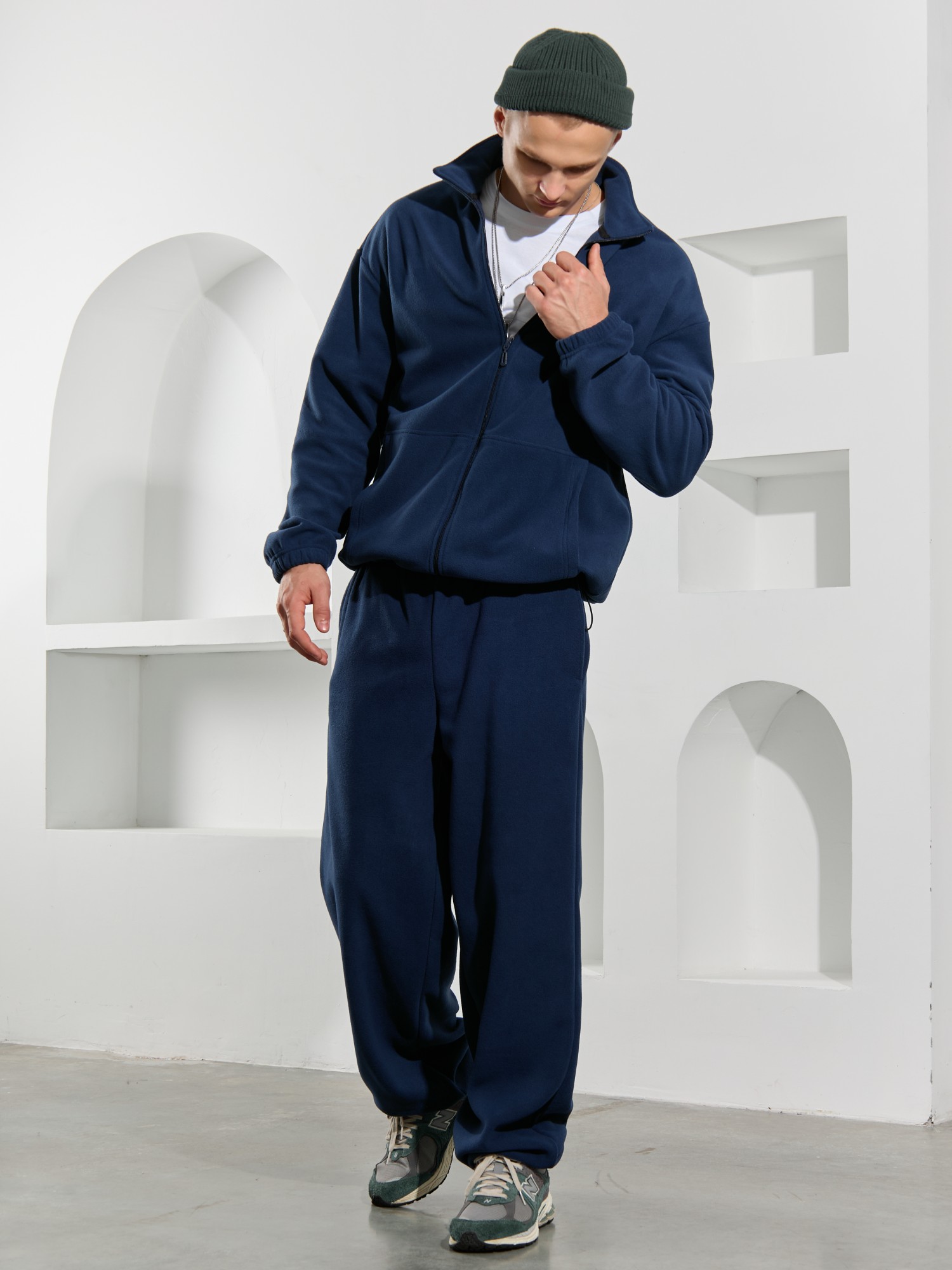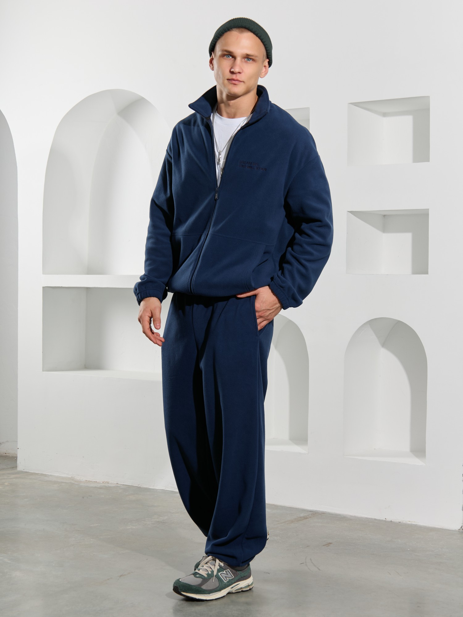 Брюки мужские из флиса, свободного покроя, на притачном поясе с эластичной тесьмой внутри, с карманами в боковых швах. С изнаночной стороны пояса вставлен шнурок для регулирования степени прилегания изделия по талии. Нижние срезы брюк обработаны подгибкой с эластичной тесьмой.
