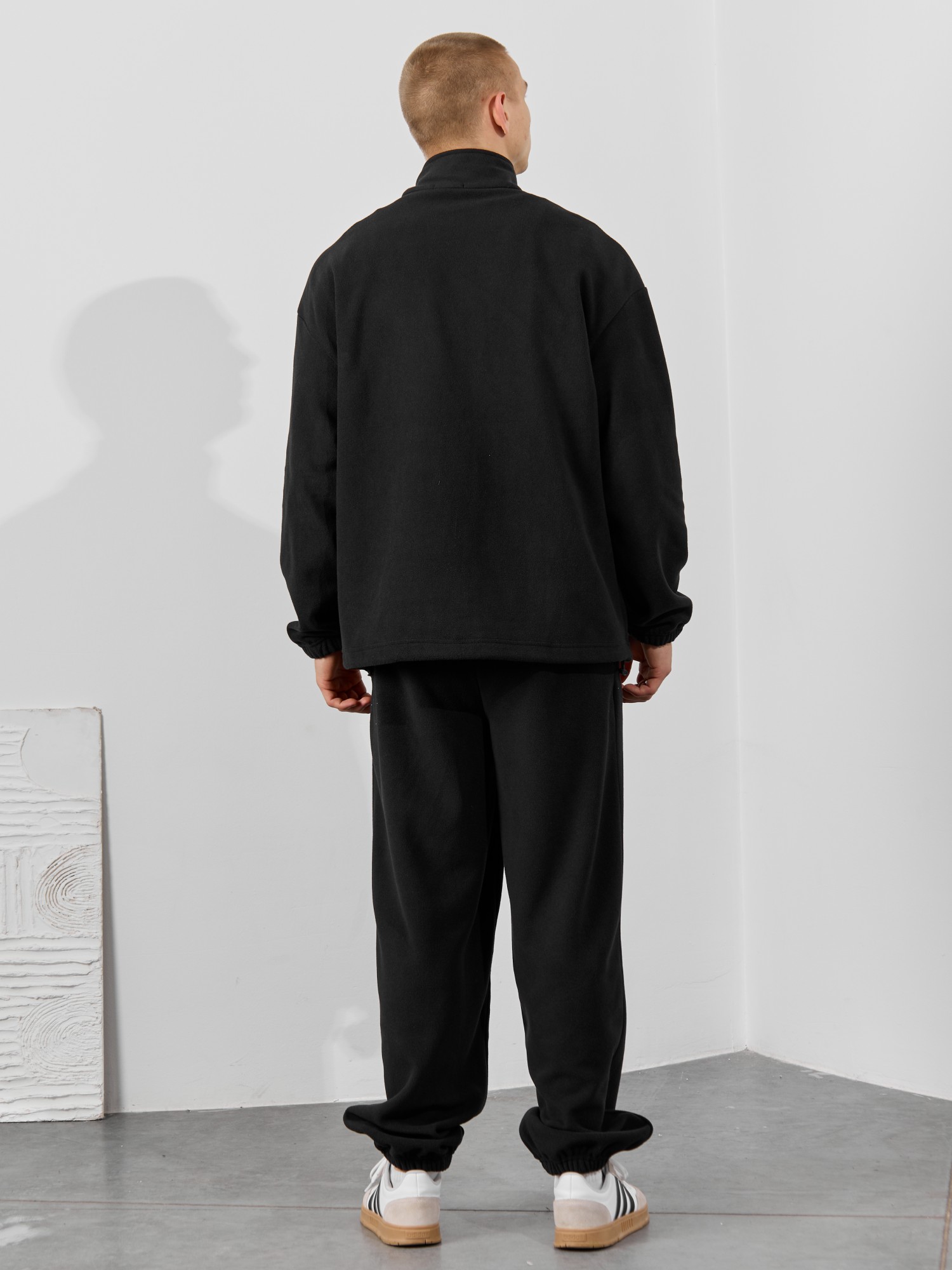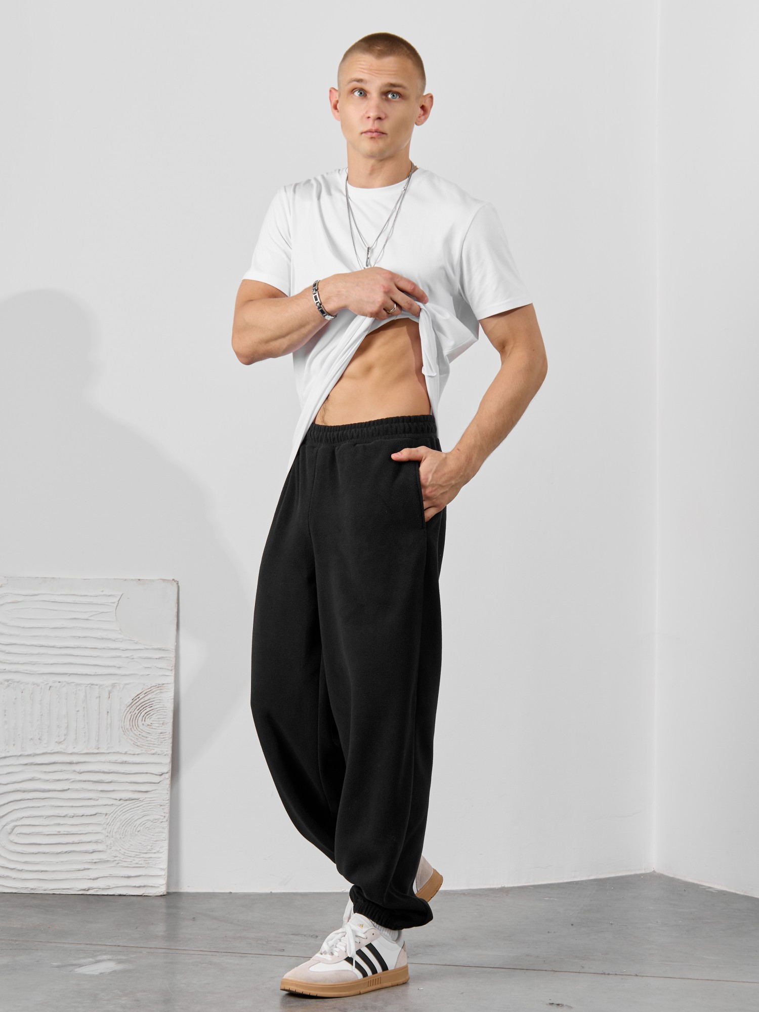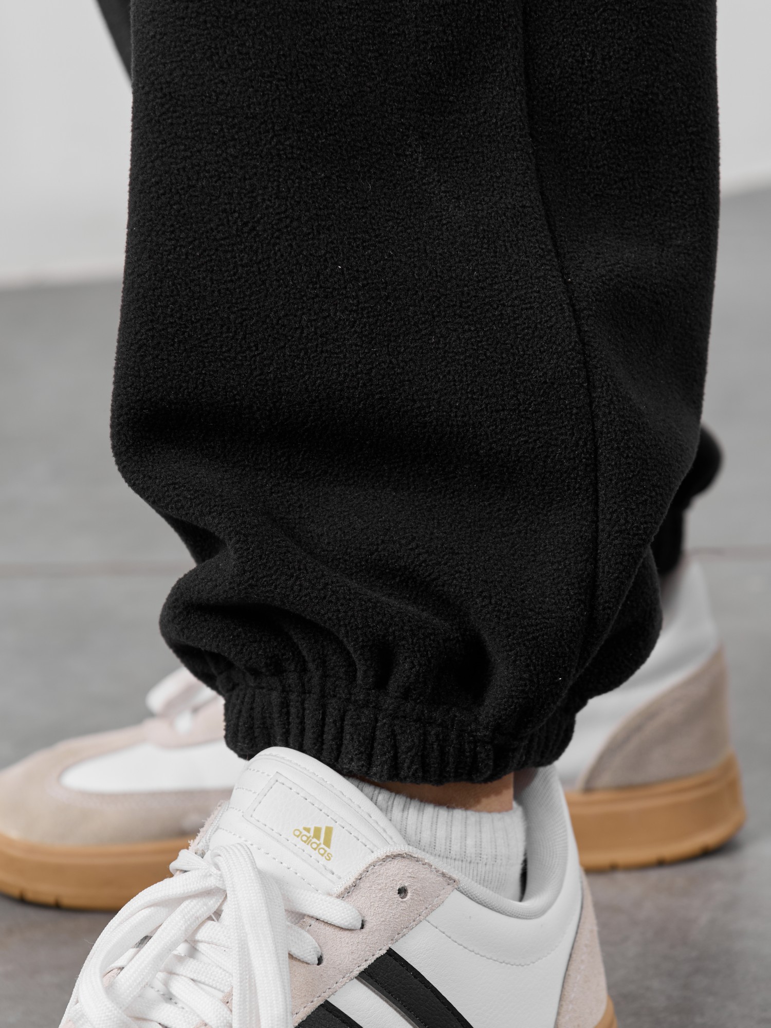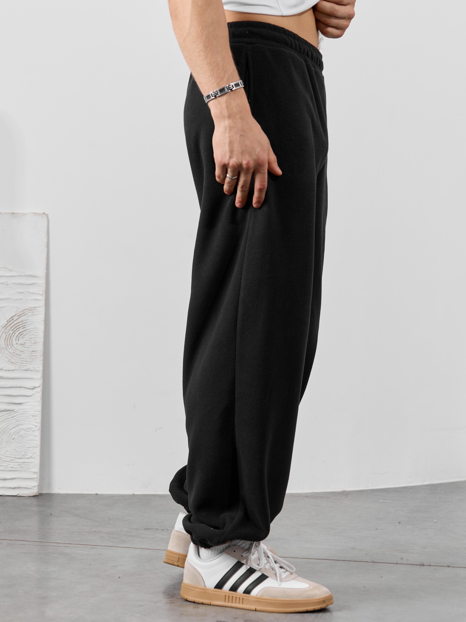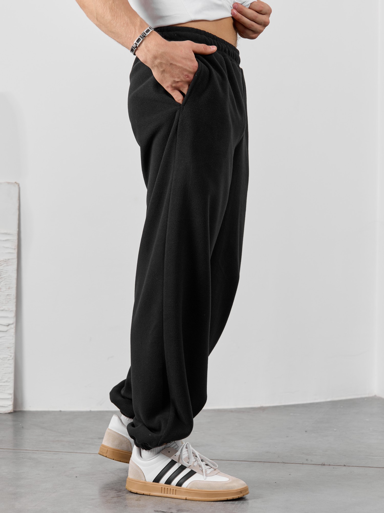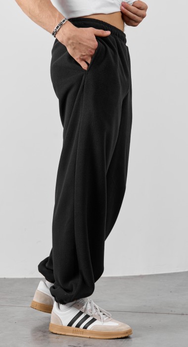 Брюки мужские из флиса, свободного покроя, на притачном поясе с эластичной тесьмой внутри, с карманами в боковых швах. С изнаночной стороны пояса вставлен шнурок для регулирования степени прилегания изделия по талии. Нижние срезы брюк обработаны подгибкой с эластичной тесьмой.