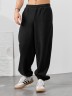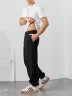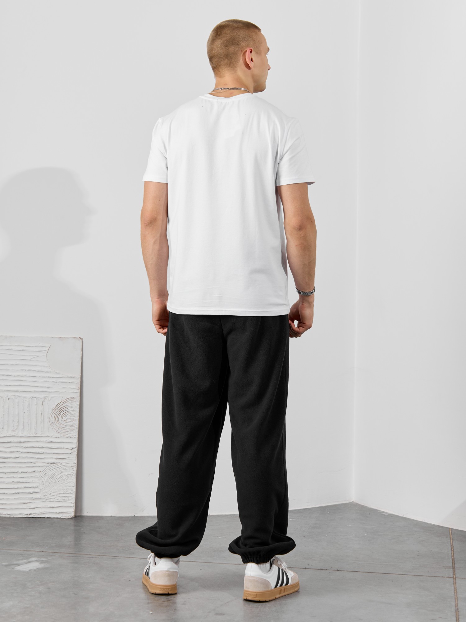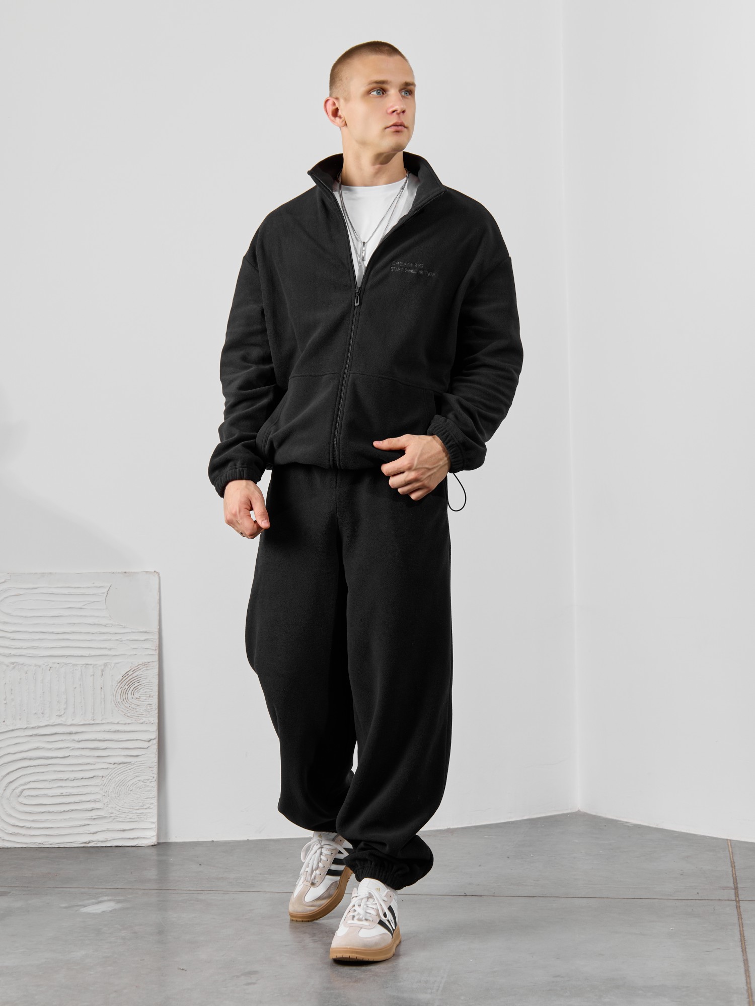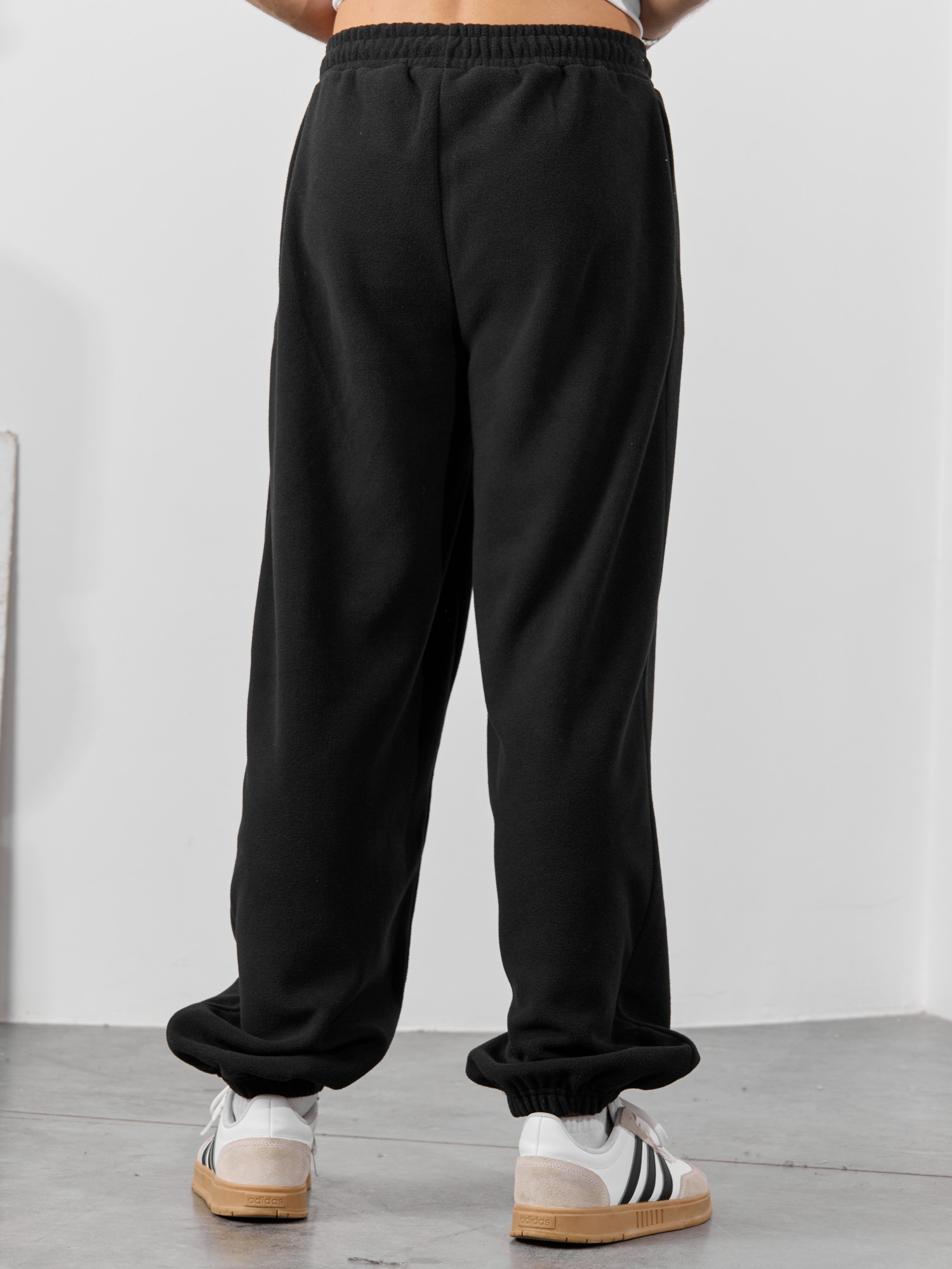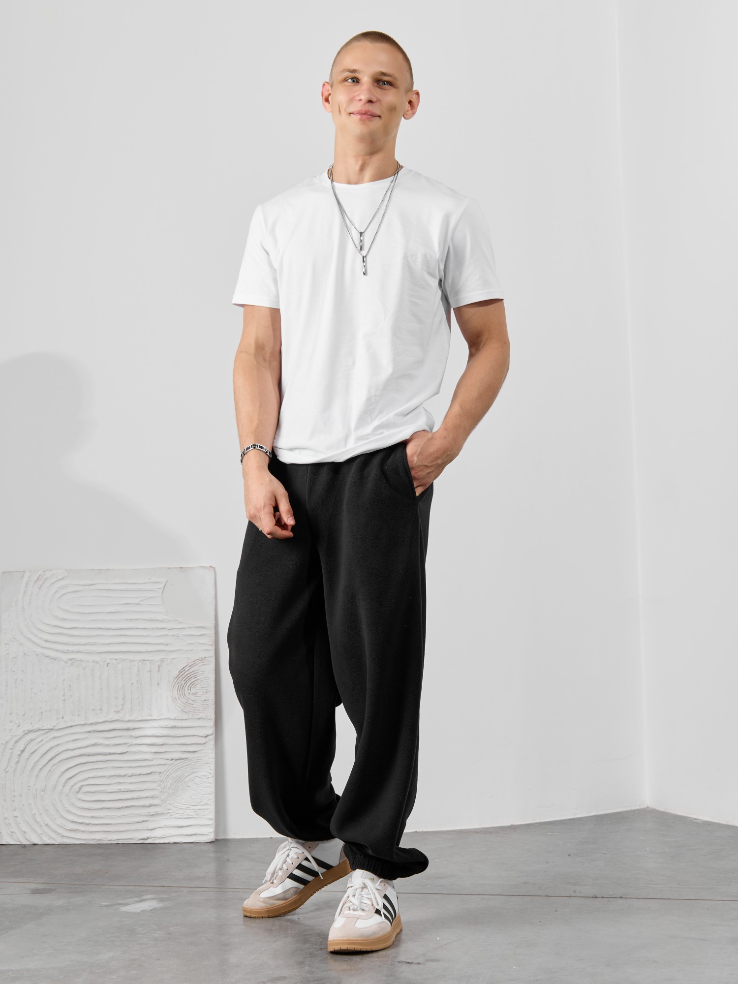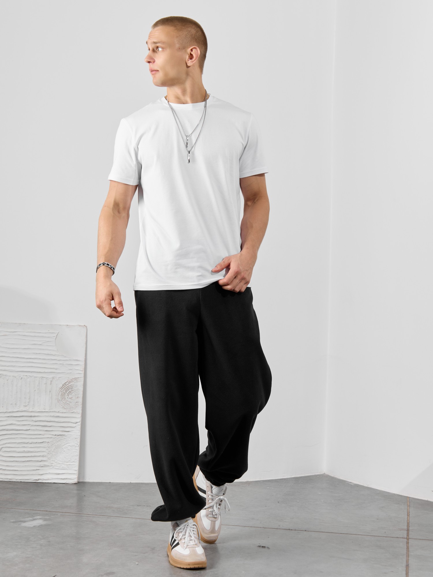 Брюки мужские из флиса, свободного покроя, на притачном поясе с эластичной тесьмой внутри, с карманами в боковых швах. С изнаночной стороны пояса вставлен шнурок для регулирования степени прилегания изделия по талии. Нижние срезы брюк обработаны подгибкой с эластичной тесьмой.