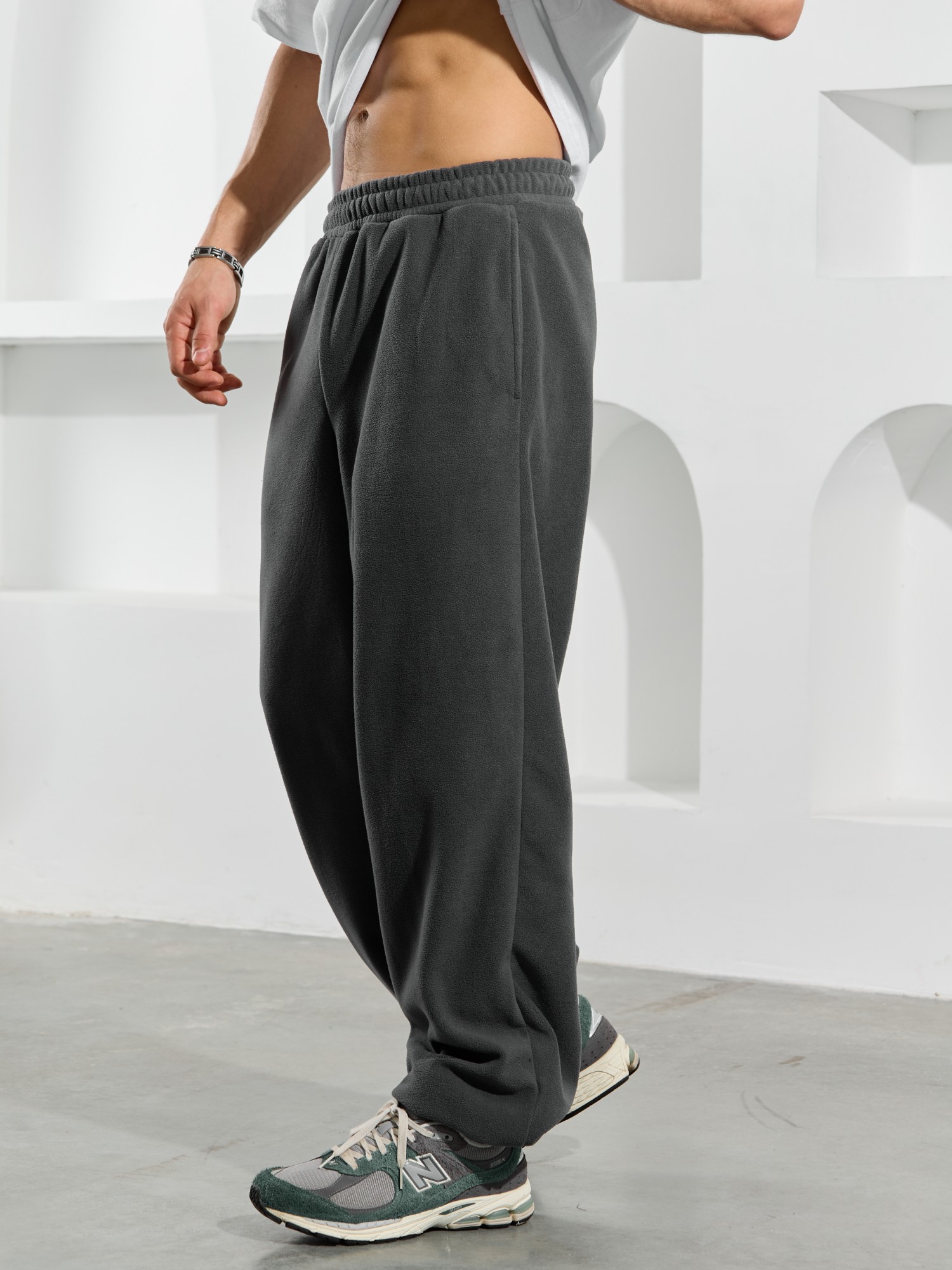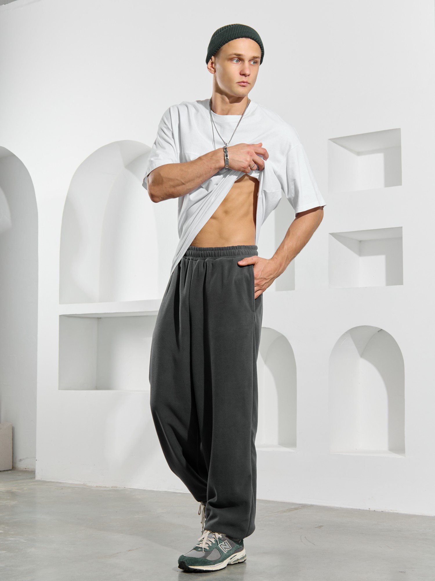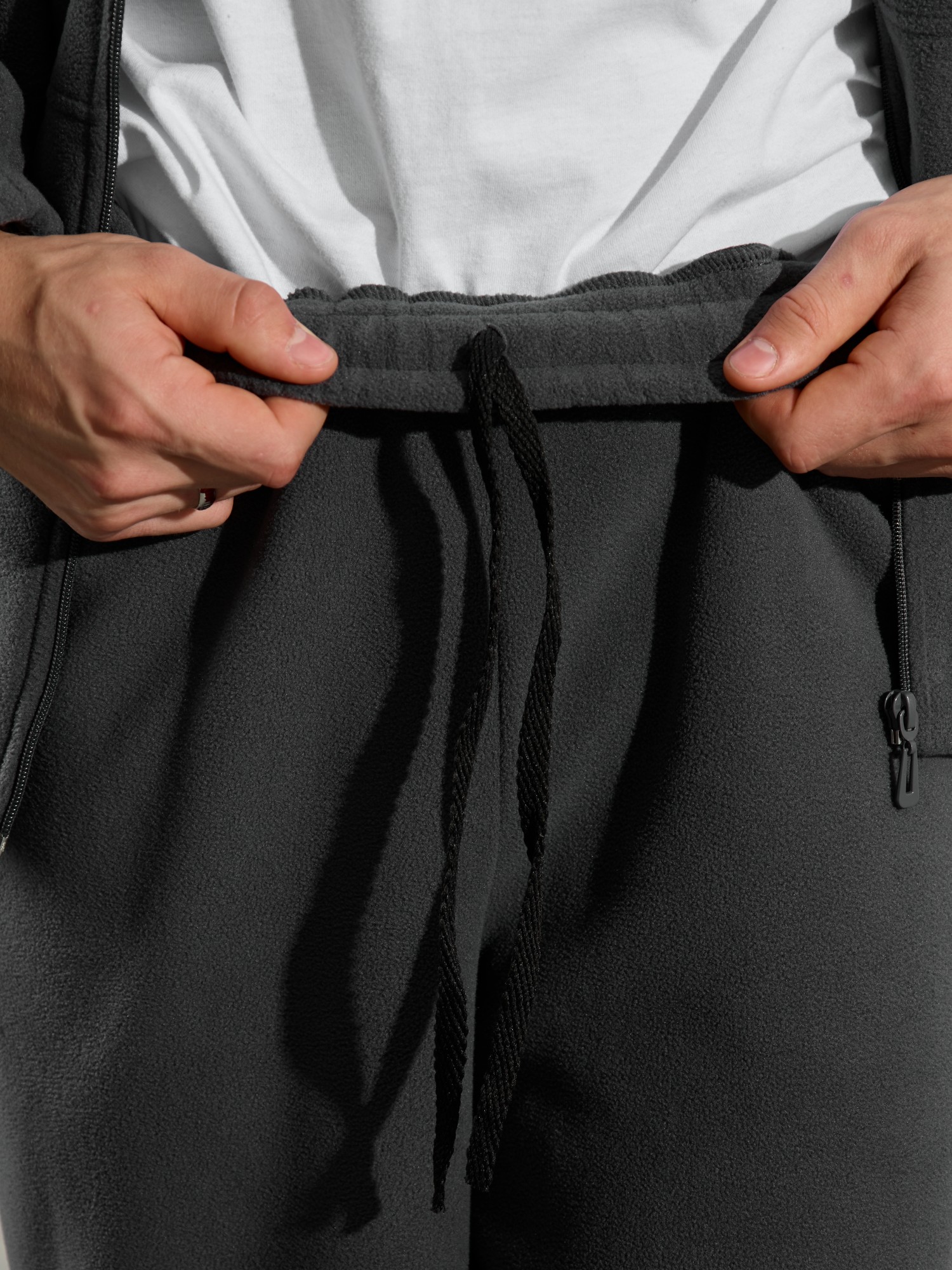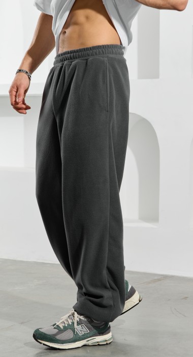 Брюки мужские из флиса, свободного покроя, на притачном поясе с эластичной тесьмой внутри, с карманами в боковых швах. С изнаночной стороны пояса вставлен шнурок для регулирования степени прилегания изделия по талии. Нижние срезы брюк обработаны подгибкой с эластичной тесьмой.