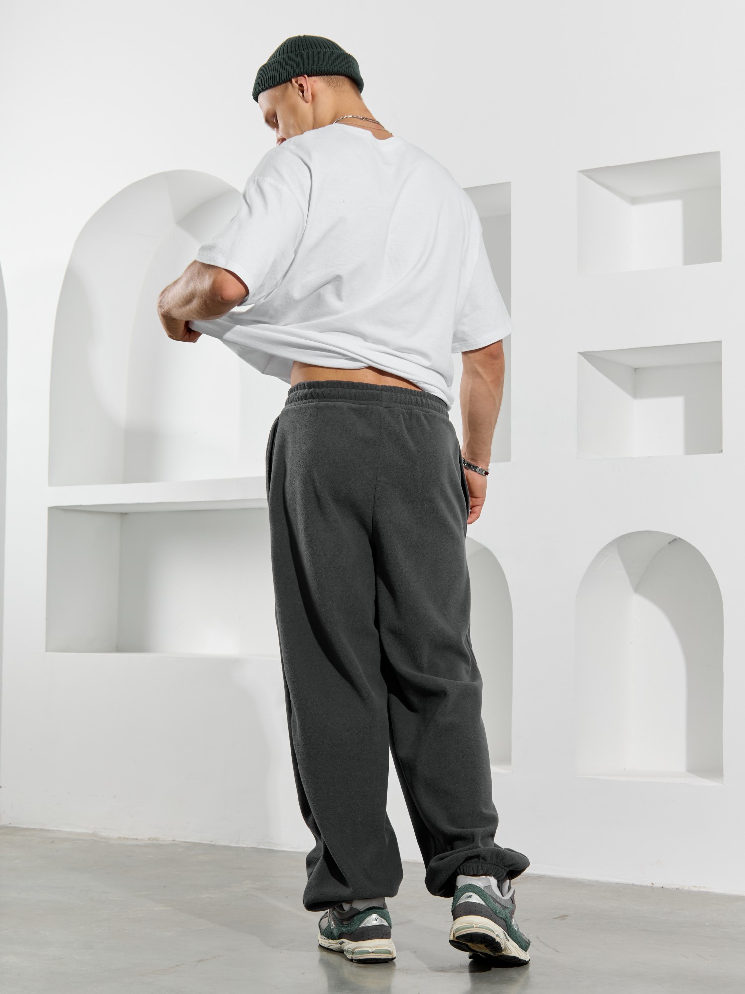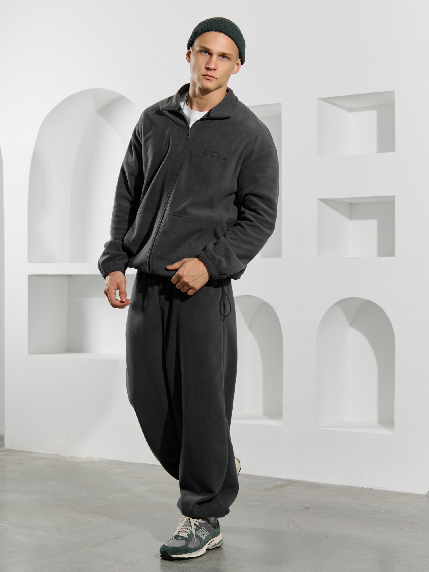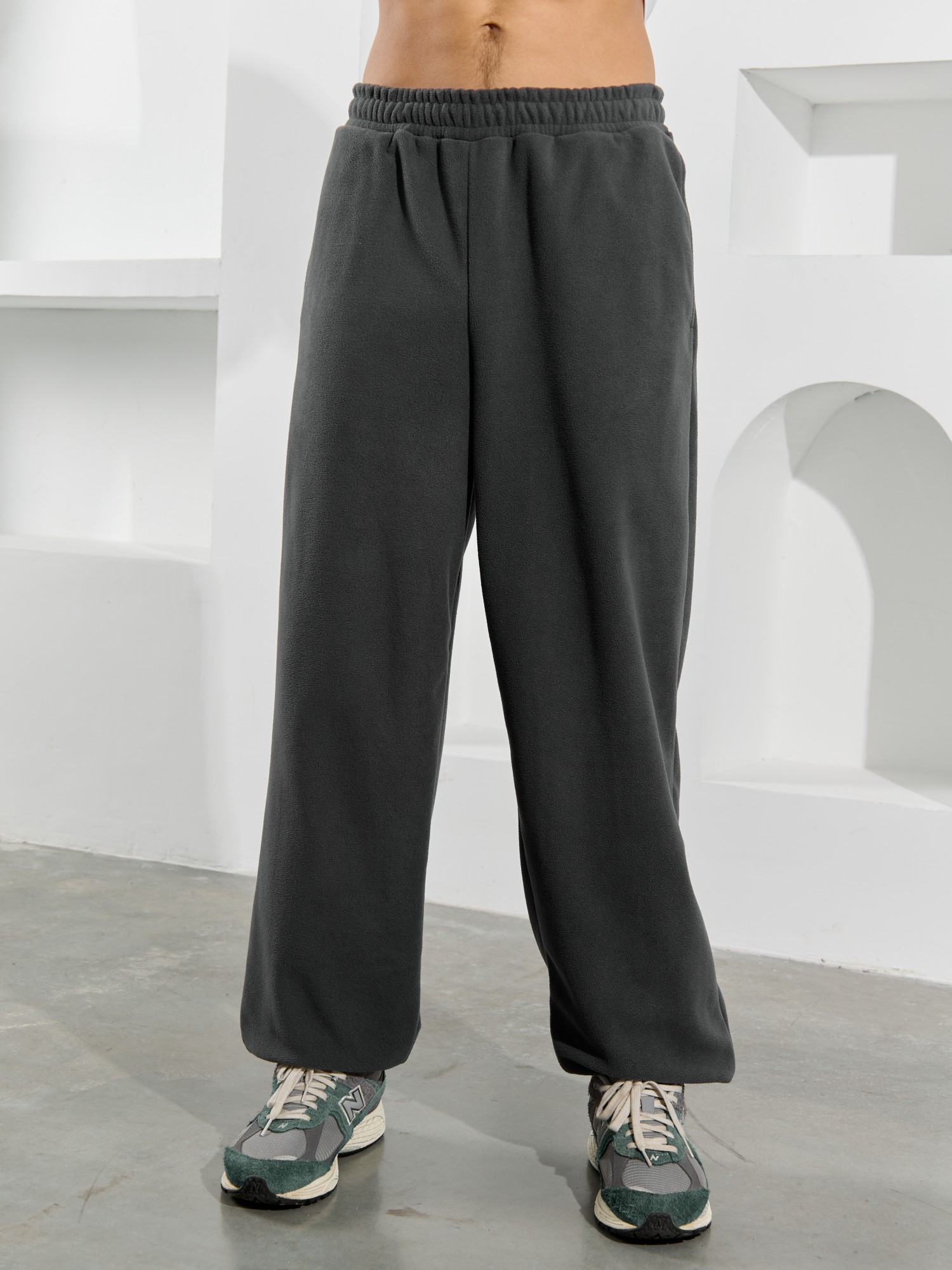 Брюки мужские из флиса, свободного покроя, на притачном поясе с эластичной тесьмой внутри, с карманами в боковых швах. С изнаночной стороны пояса вставлен шнурок для регулирования степени прилегания изделия по талии. Нижние срезы брюк обработаны подгибкой с эластичной тесьмой.