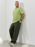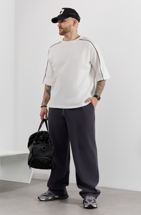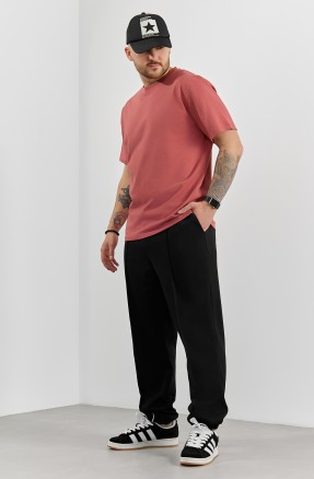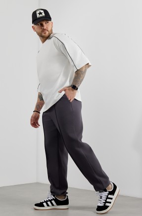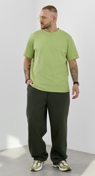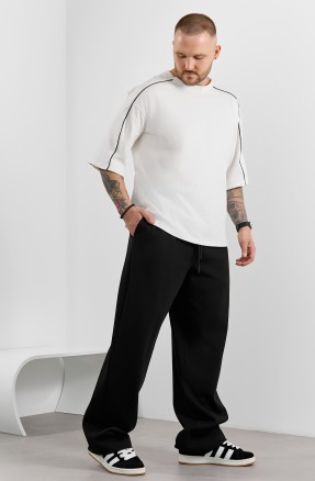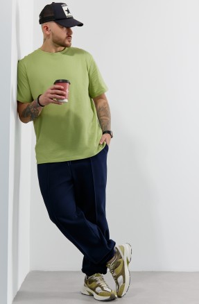 Брюки мужские из трикотажного полотна "интерлок-пике", на притачном поясе с эластичной тесьмой внутри, с карманами в боковых швах. Низ брюк прямой с подгибкой. Для регулирования степени прилегания изделия по линии талии предусмотрен декоративный шнурок, вставленный в пояс и продетый через две обметанные петли в центре.