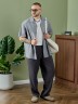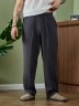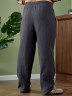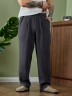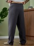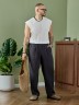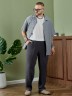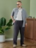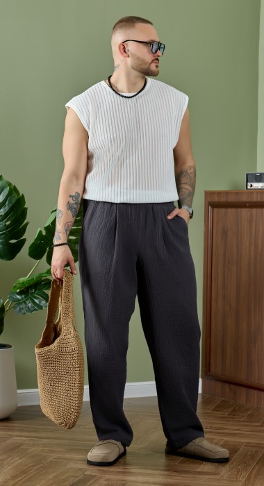 Брюки мужские из фактурного гладкокрашеного полотна на притачном поясе с эластичной тесьмой внутри , с карманами в боковых швах. На передних половинах брюк в шве притачивания пояса обработаны складки-защипы по две с каждой стороны. Нижние срезы брюк обработаны подгибкой.
