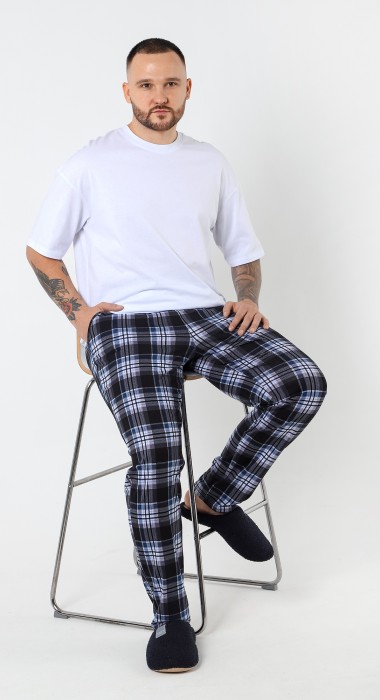 Брюки из полотна с набивным рисунком, классического покроя, прямые, на притачном поясе с эластичной тесьмой внутри, с карманами в боковых швах. Входы в карманы окантованы основным материалом.