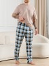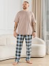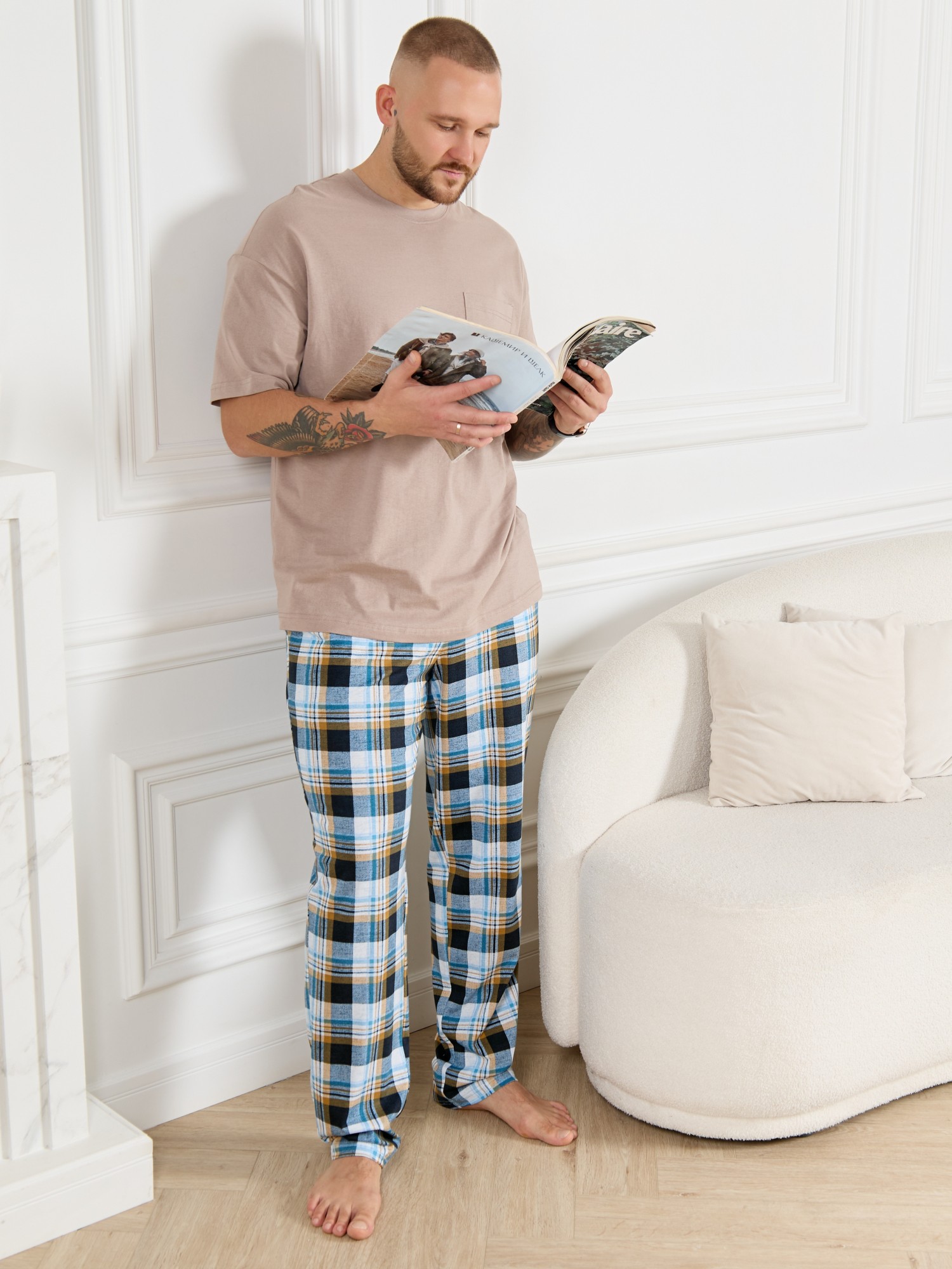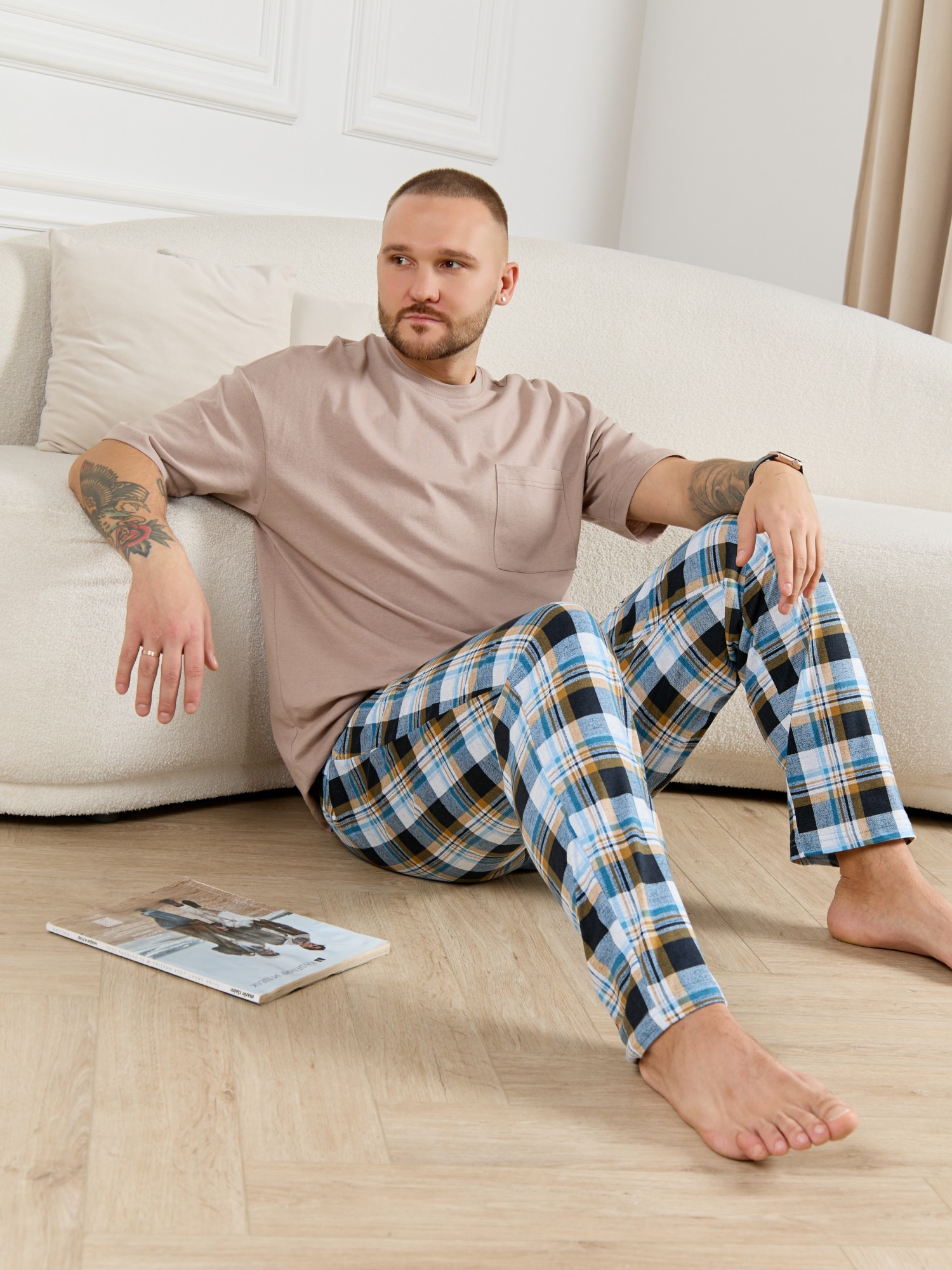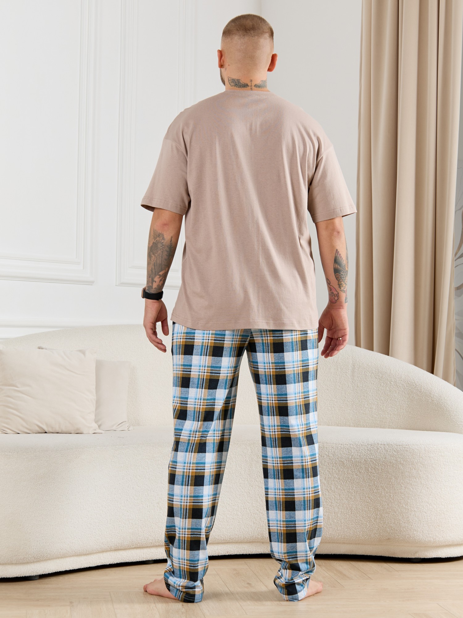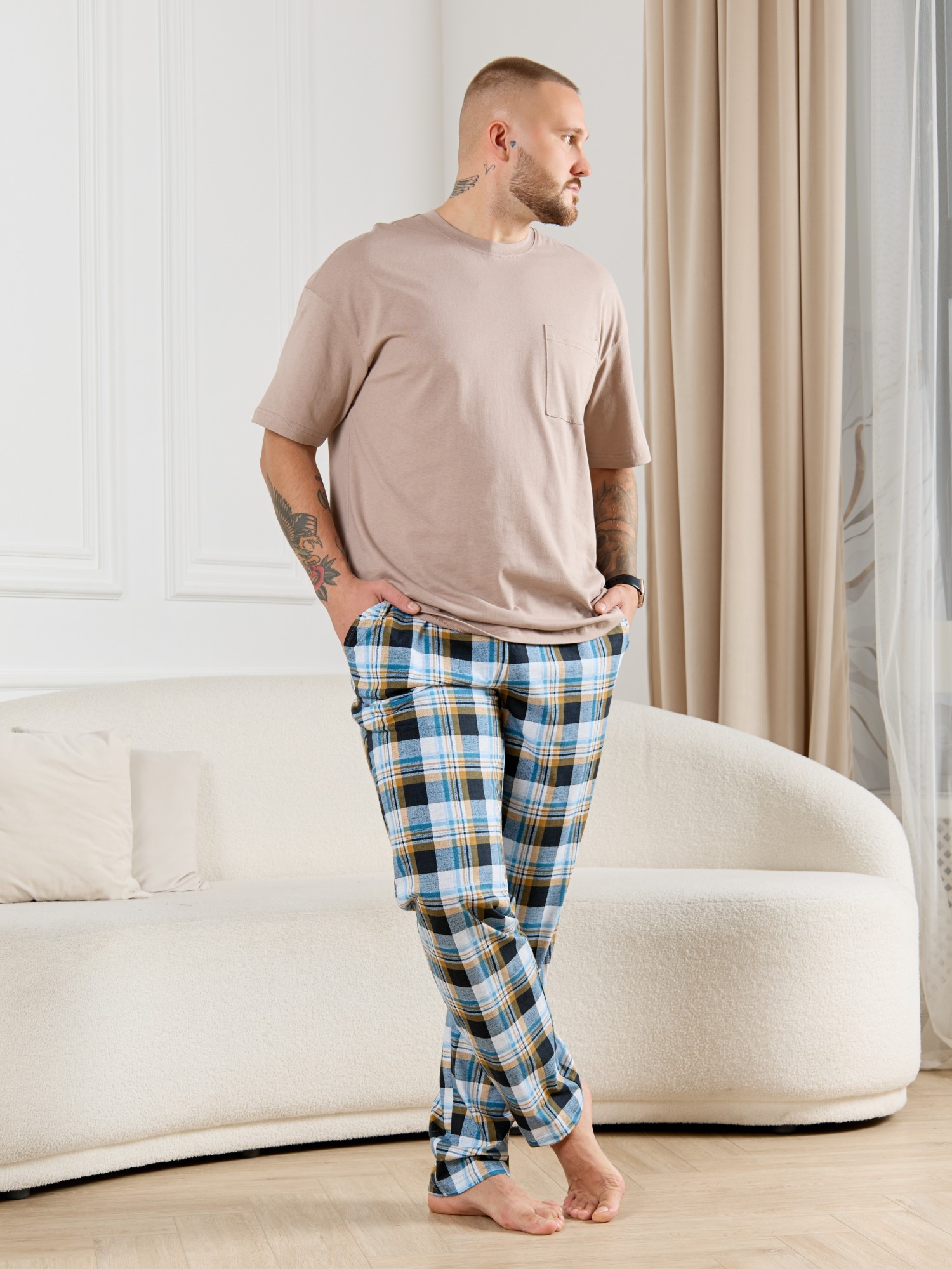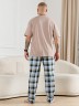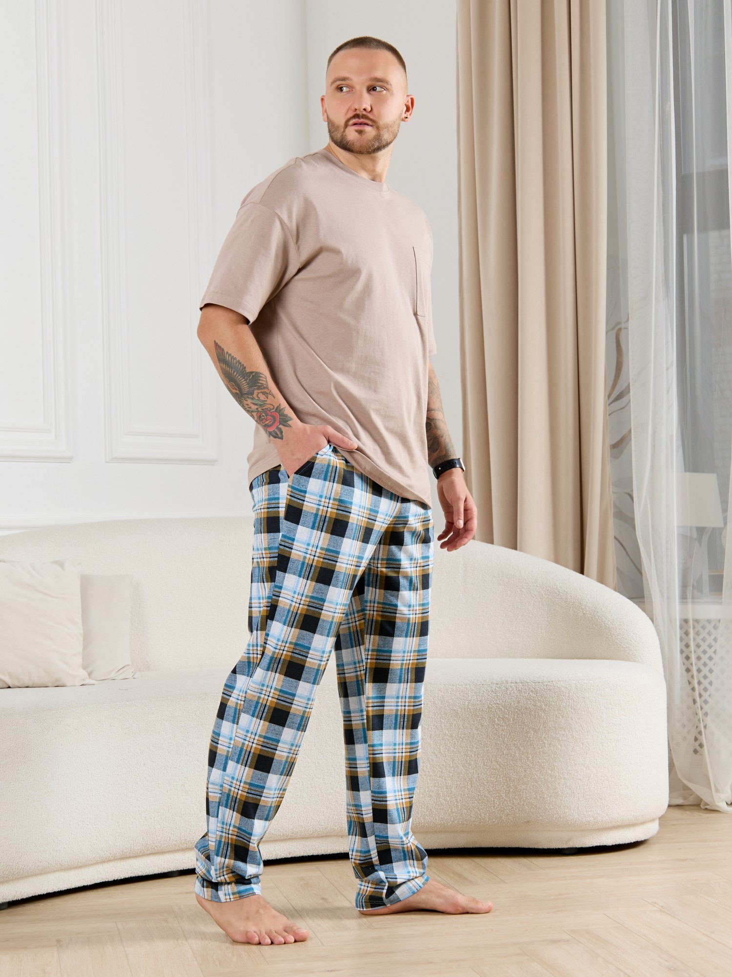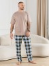 Брюки мужские из трикотажного полотна "кулирка" в клетку, свободного покроя, на притачном поясе с эластичной тесьмой внутри, с карманами в боковых швах. Нижние срезы обработаны подгибкой.