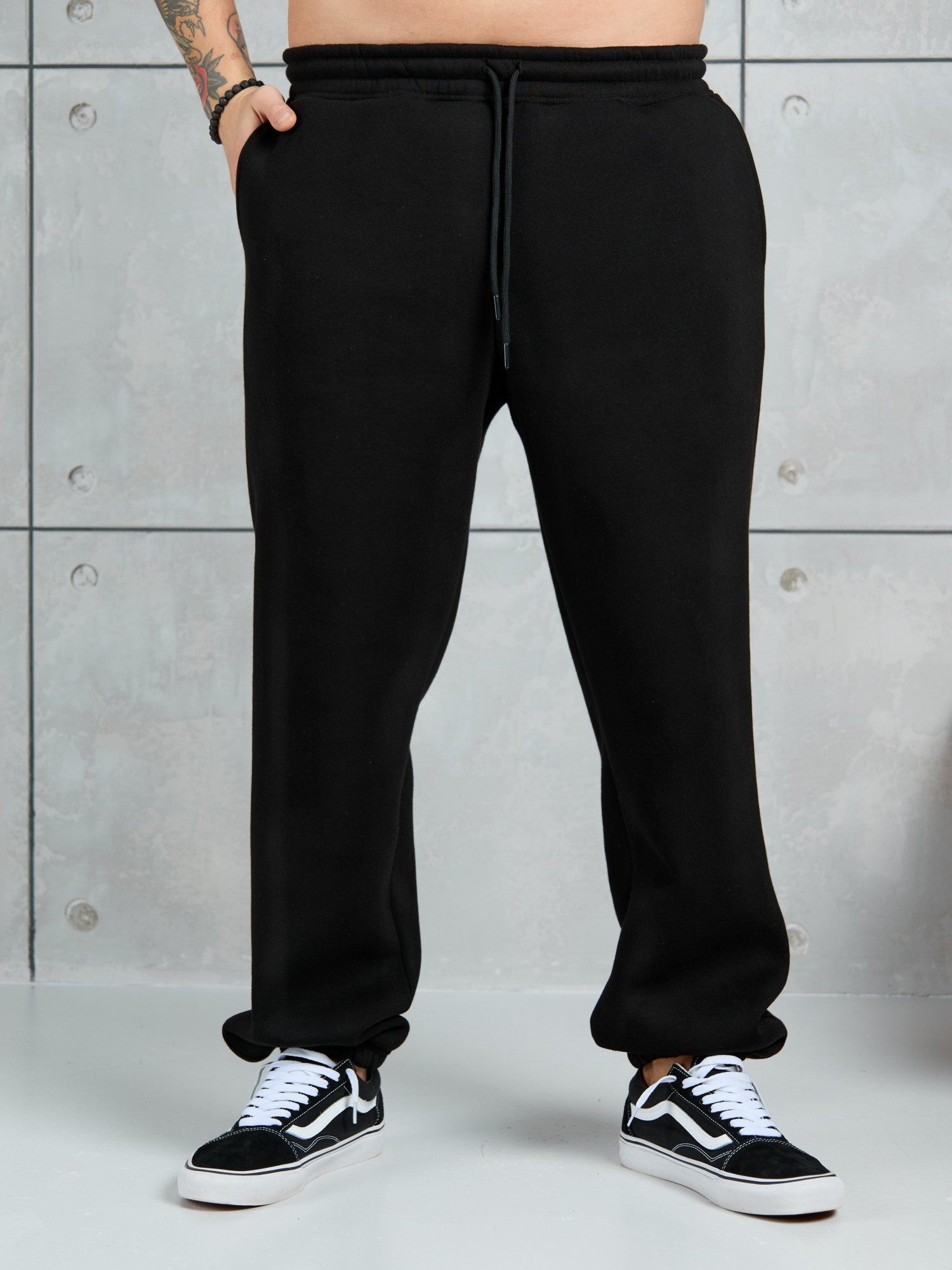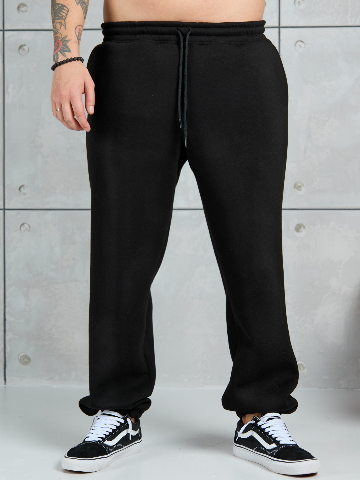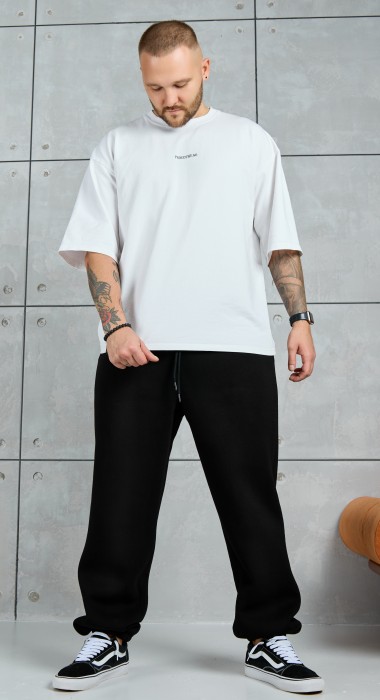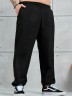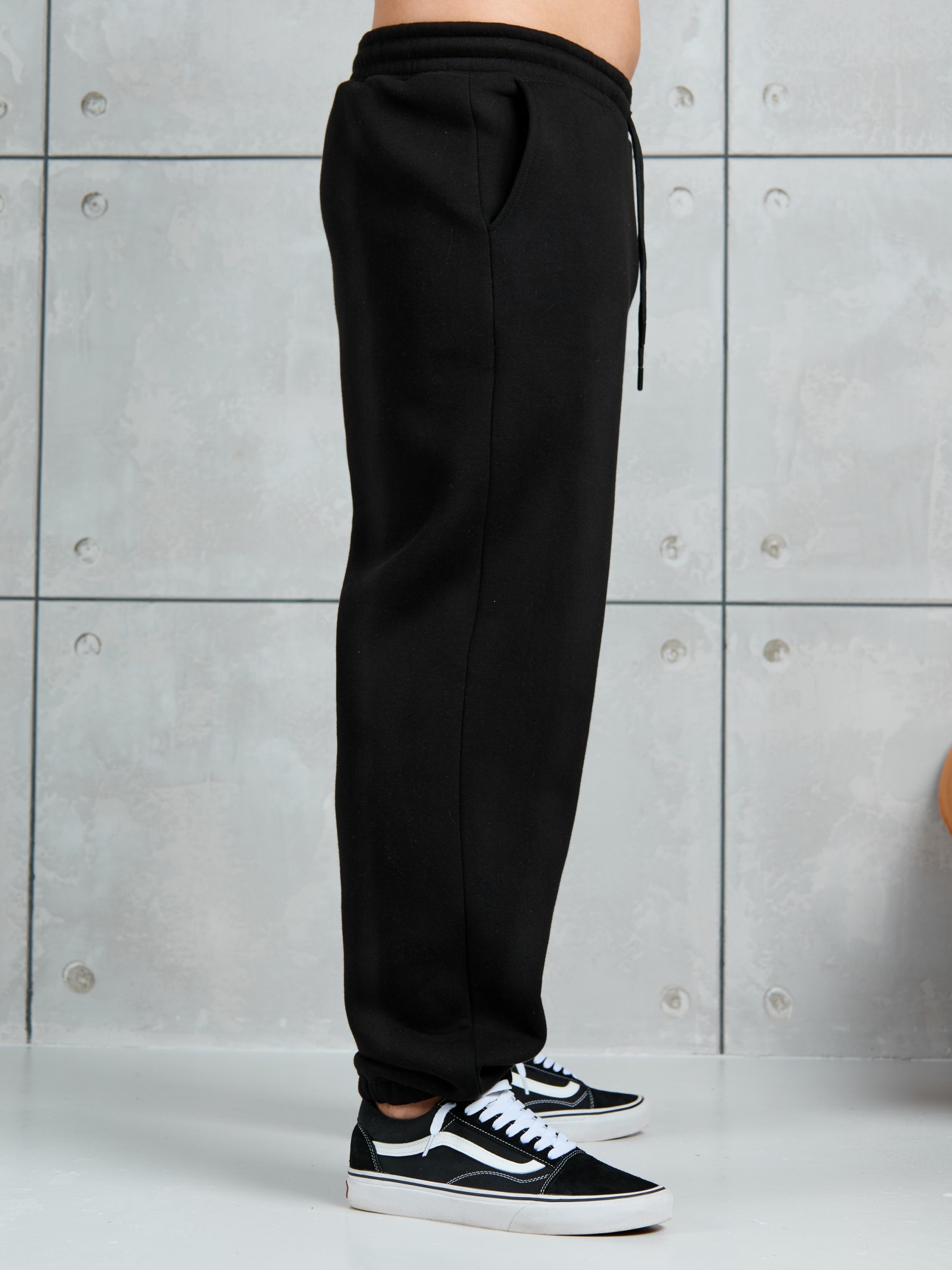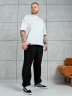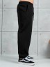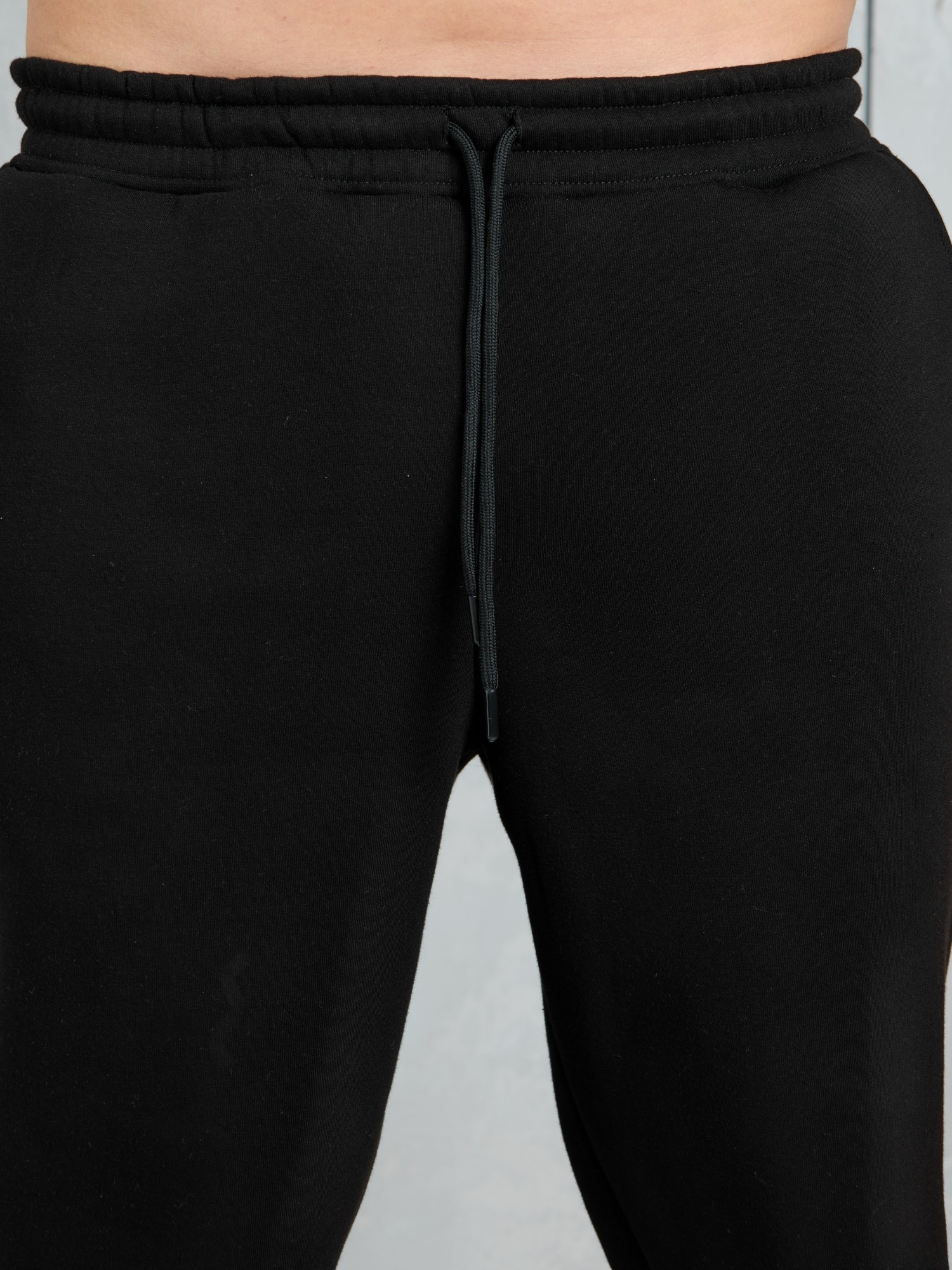 Брюки мужские из трикотажного полотна "футер-3-нитка с начесом", на притачном поясе с эластичной тесьмой внутри, с карманами в боковых швах. Нижние срезы обработаны подгибкой с эластичной тесьмой. Для регулирования степени прилегнания изделия по линии талии предусмотрен декоративный шнурок, вставленный в пояс и продетый через две обметанные петли в центре.