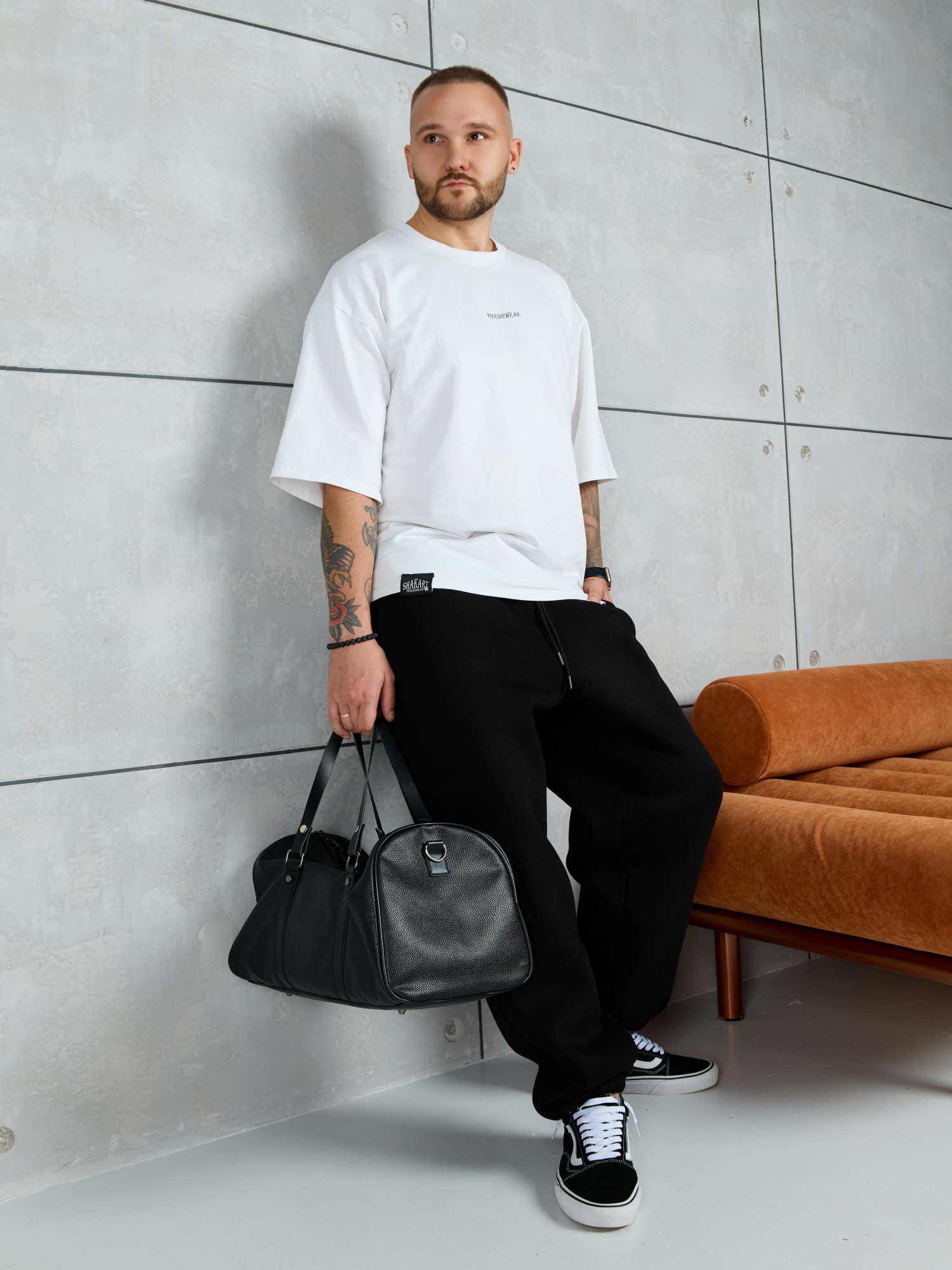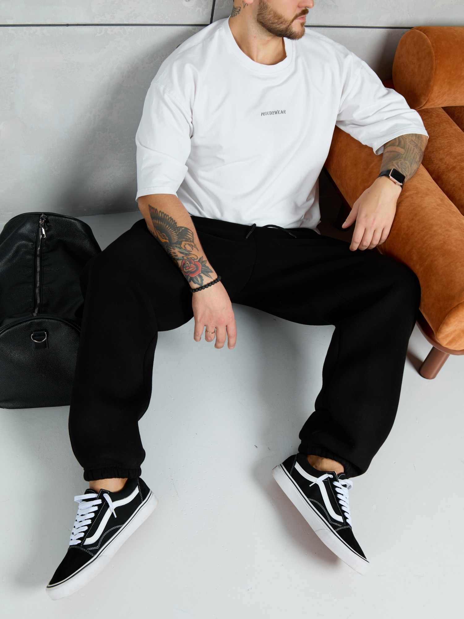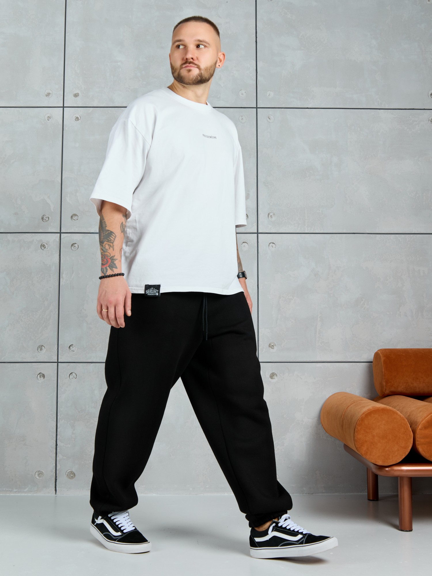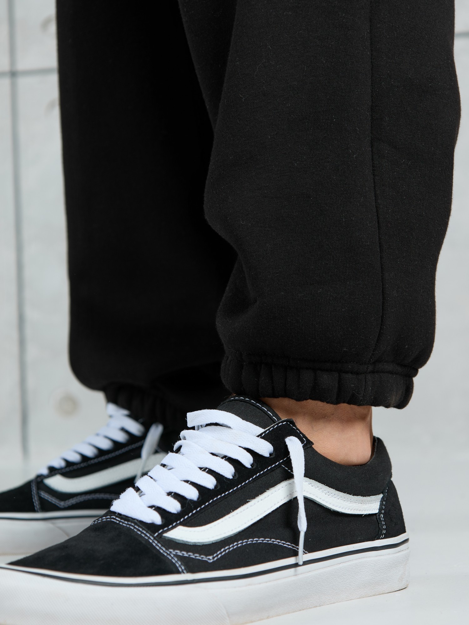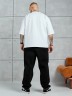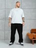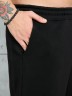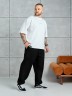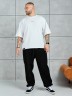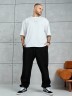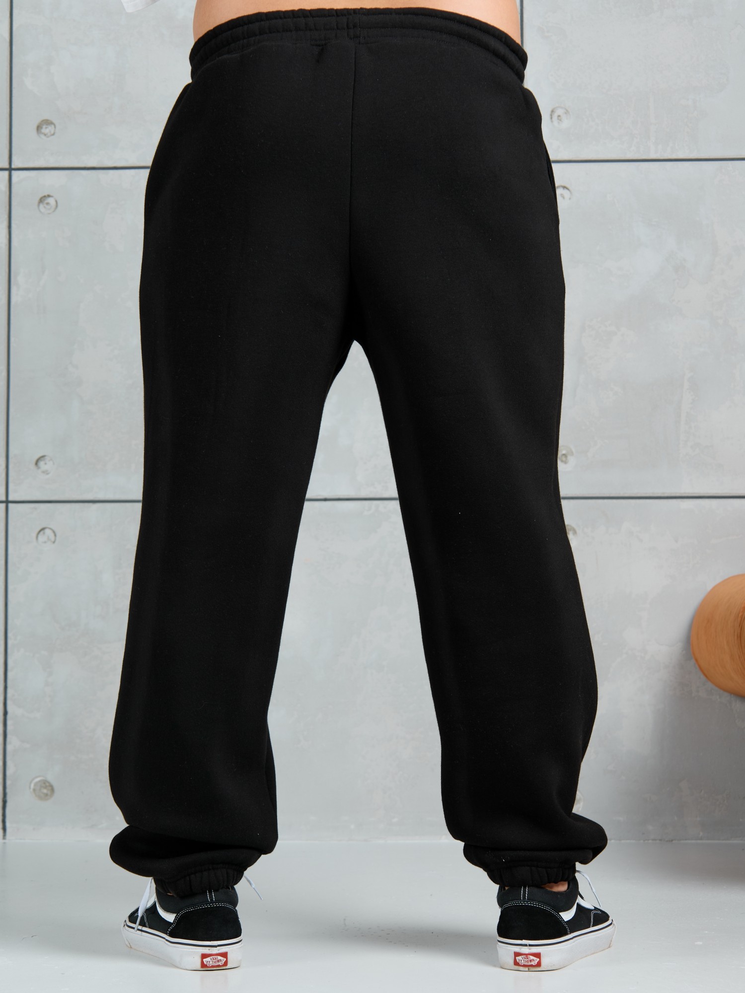 Брюки мужские из трикотажного полотна "футер-3-нитка с начесом", на притачном поясе с эластичной тесьмой внутри, с карманами в боковых швах. Нижние срезы обработаны подгибкой с эластичной тесьмой. Для регулирования степени прилегнания изделия по линии талии предусмотрен декоративный шнурок, вставленный в пояс и продетый через две обметанные петли в центре.