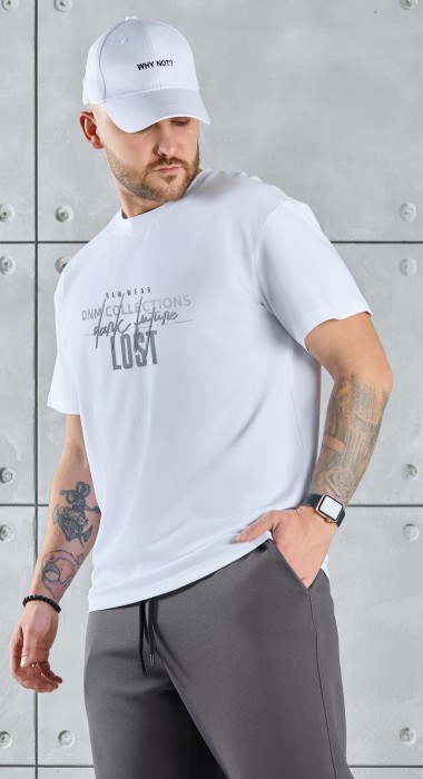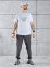 Футболка мужская из гладкокрашеного трикотажного полотна "кулирка с лайкрой" классического покроя со слегка удлиненными плечевыми швами, короткими втачными рукавами, и горловиной овальной формы, обработанной втачной планкой. На детали переда - принт, выполненный в технике шелкографии. По горловине настрочена двойная отделочная строчка. Низ рукавов и изделия обработаны подгибкой.