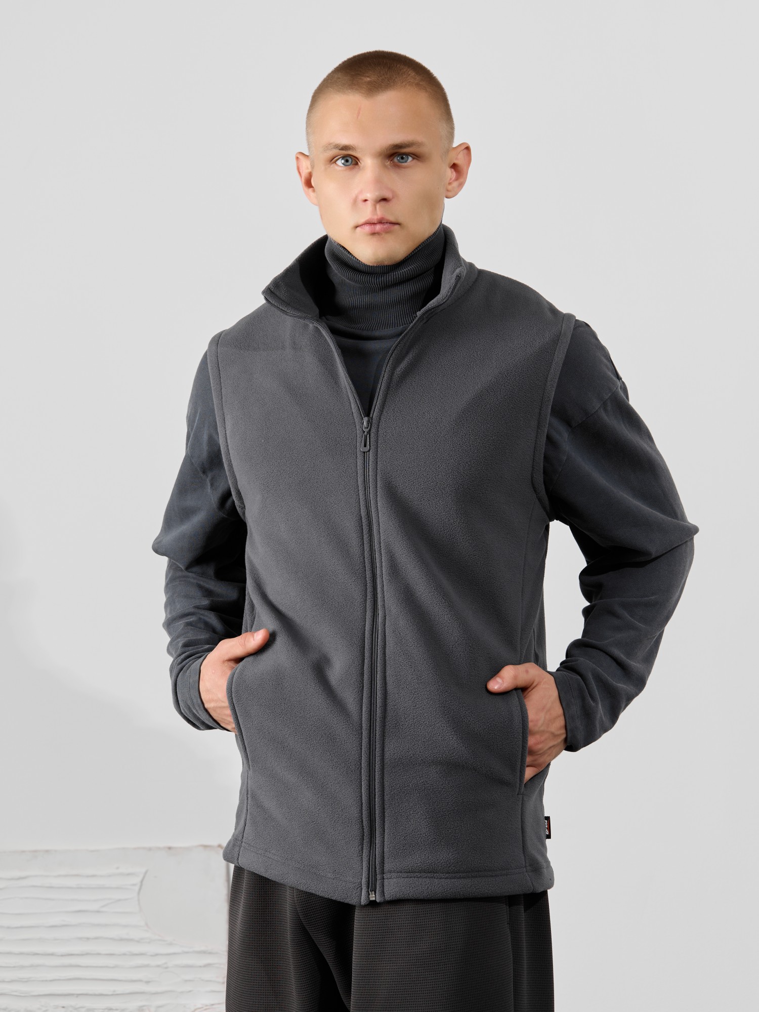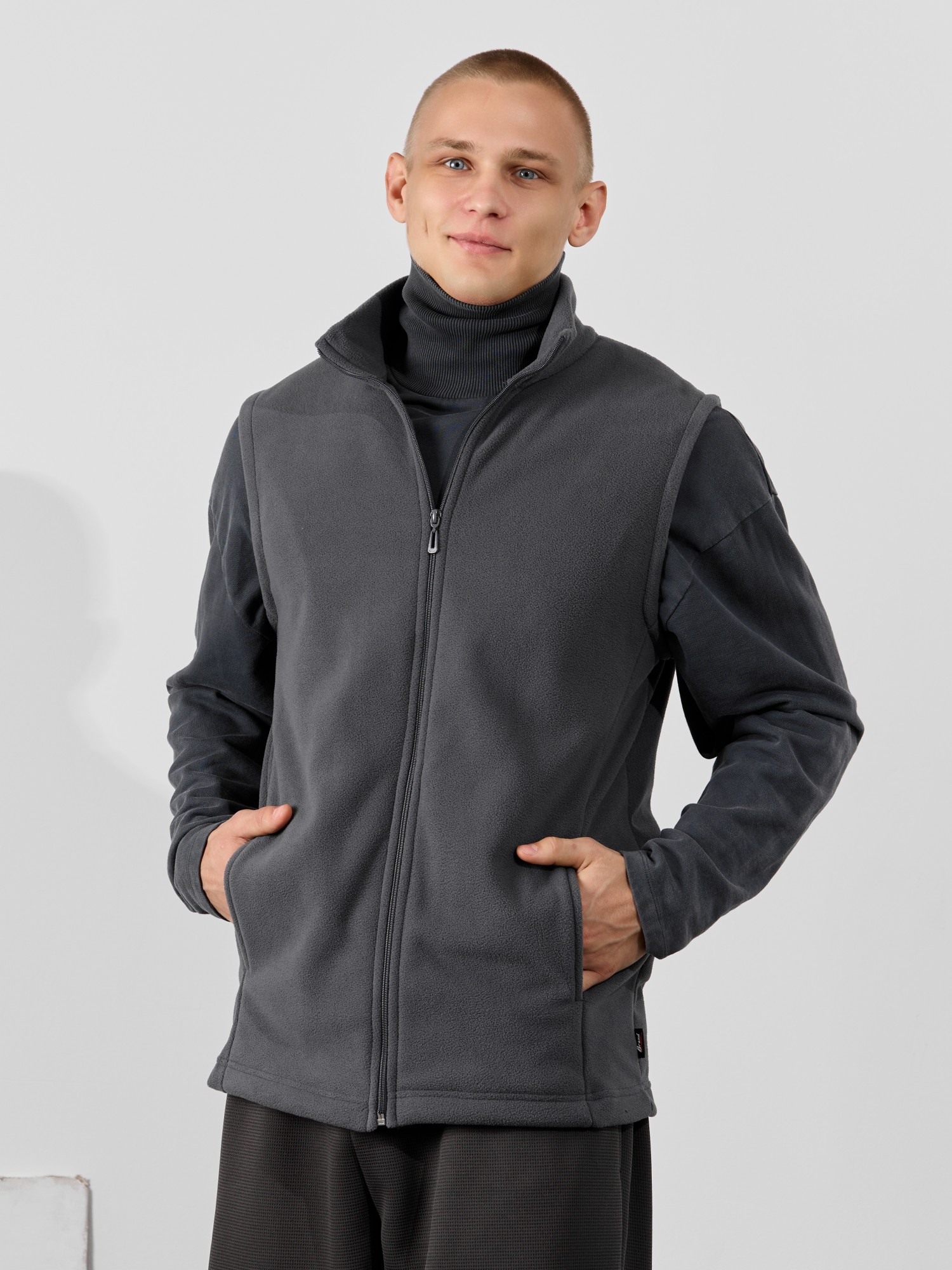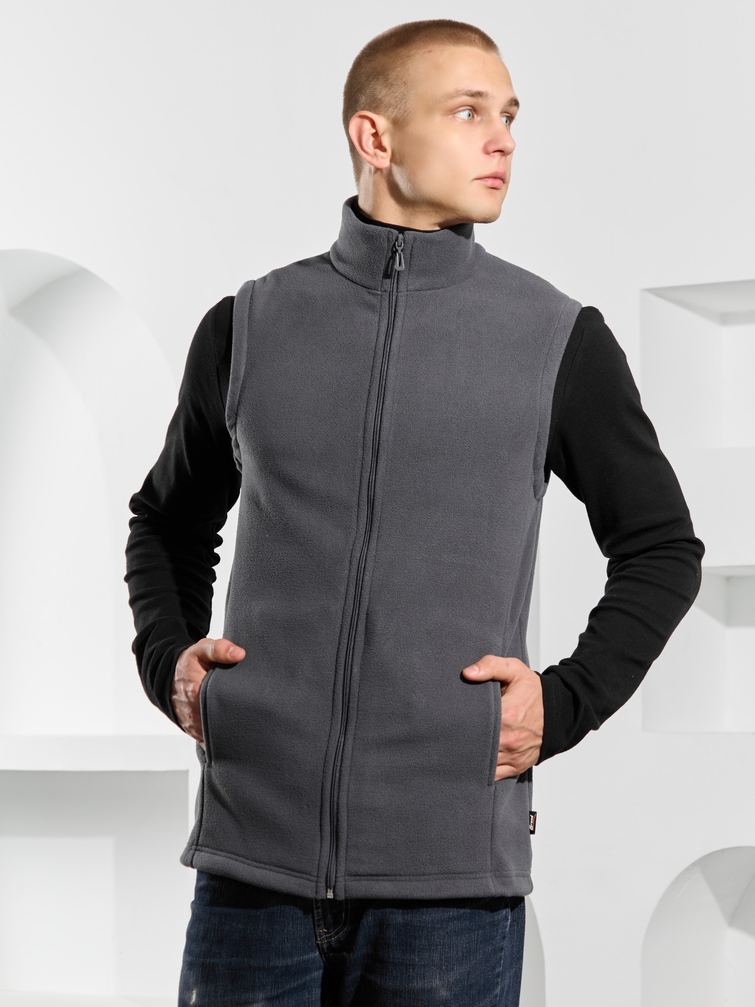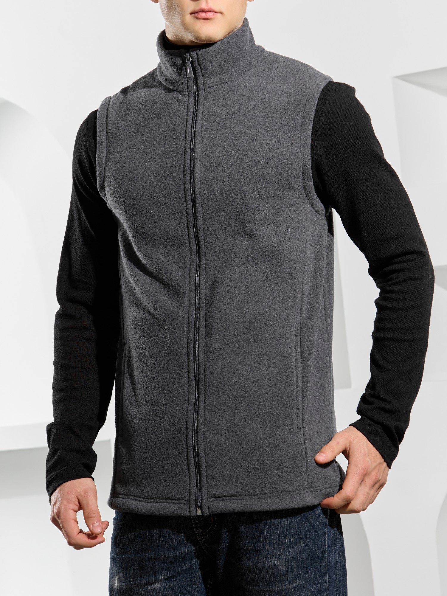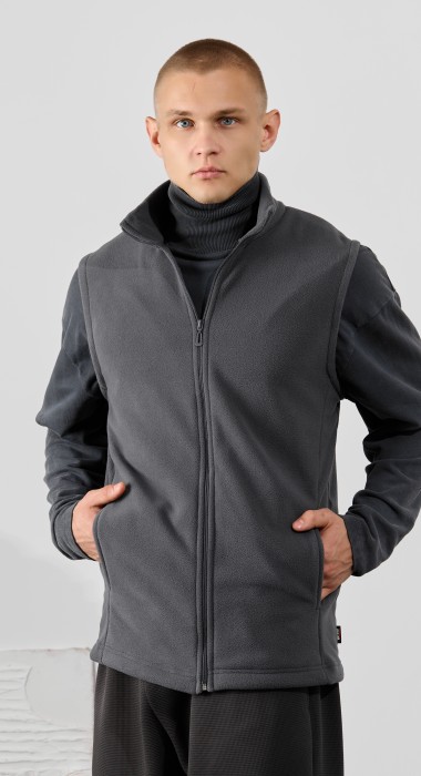 Жилет мужской из флиса, прилегающего силуэта, с воротником-стойкой , центральной боротовой застежкой на тесьму "молния" и вертикальными рельефами на полочках, в швах которых обработаны карманы. Проймы и низ изделия обработаны подгибкой. В нижней части левого бокового шва вставлен небольшой декоративный элемент из репсовой ленты.