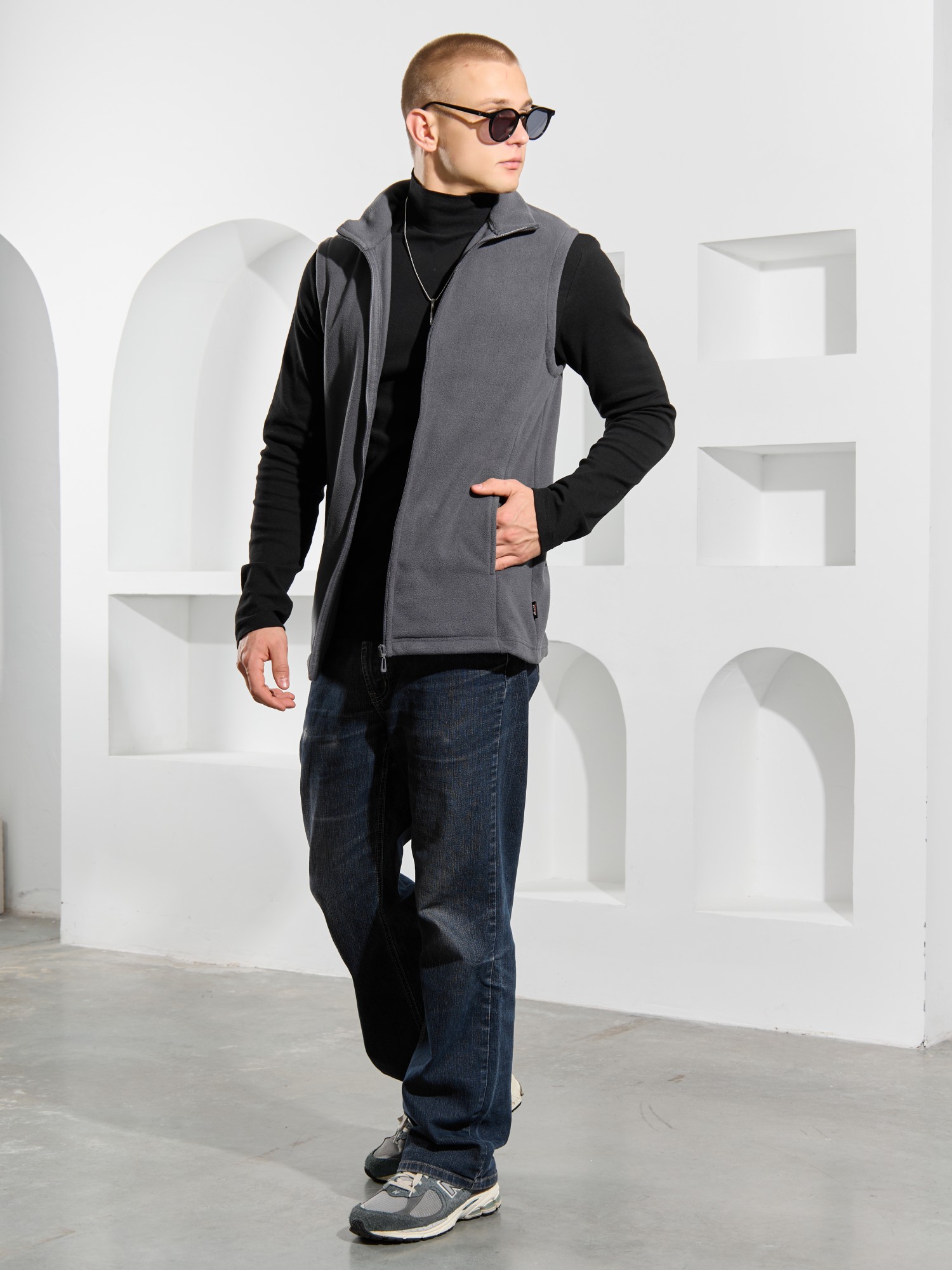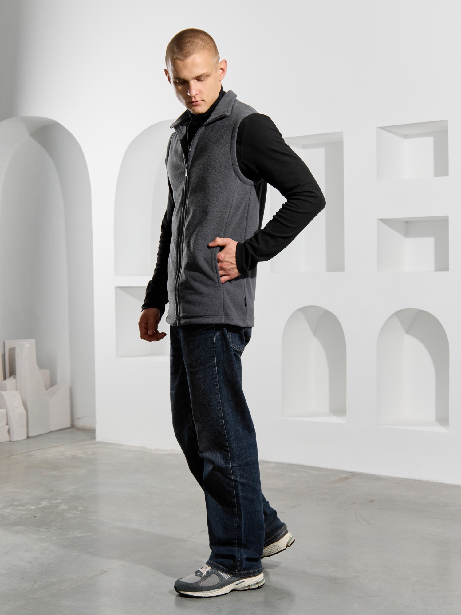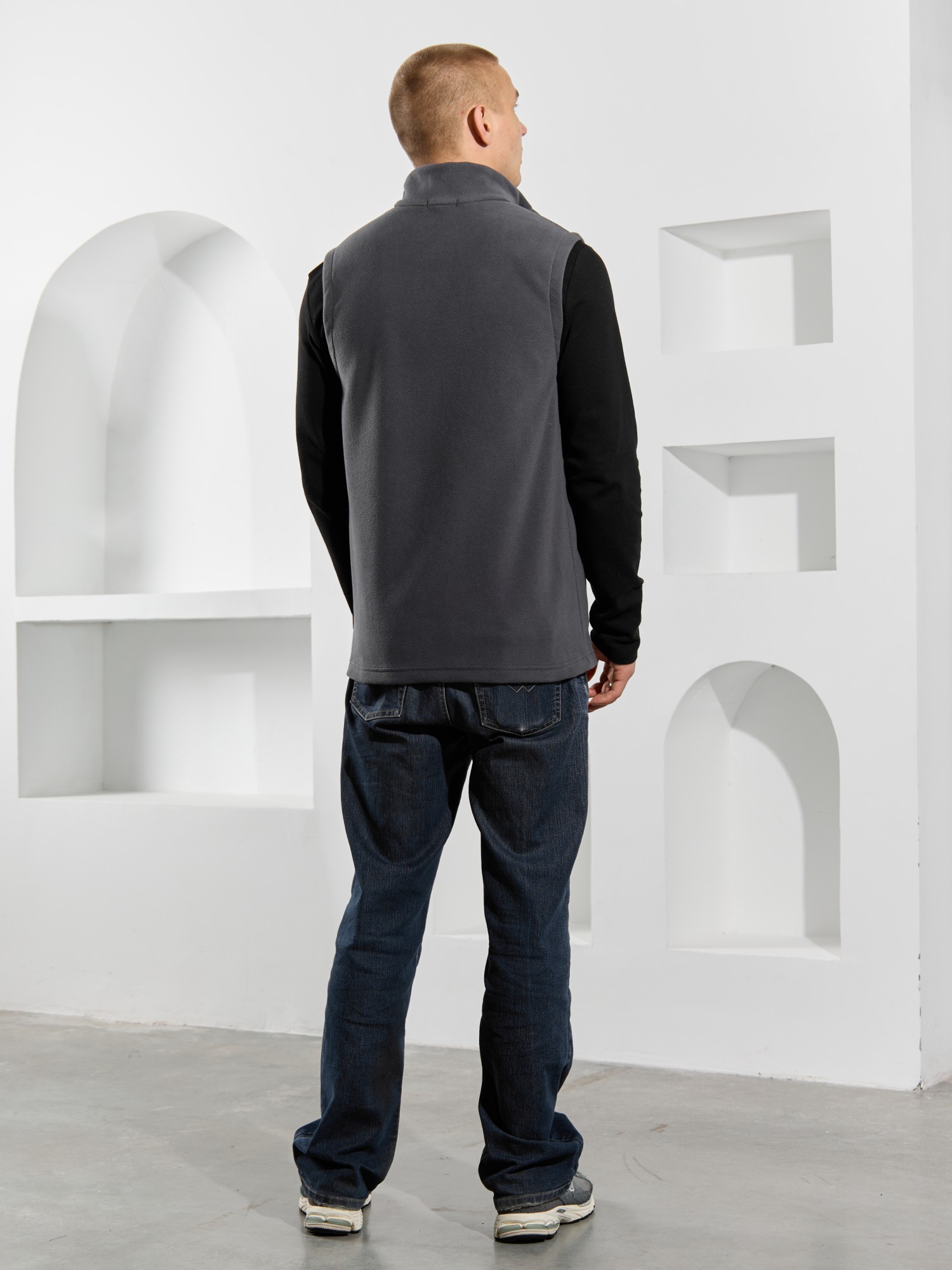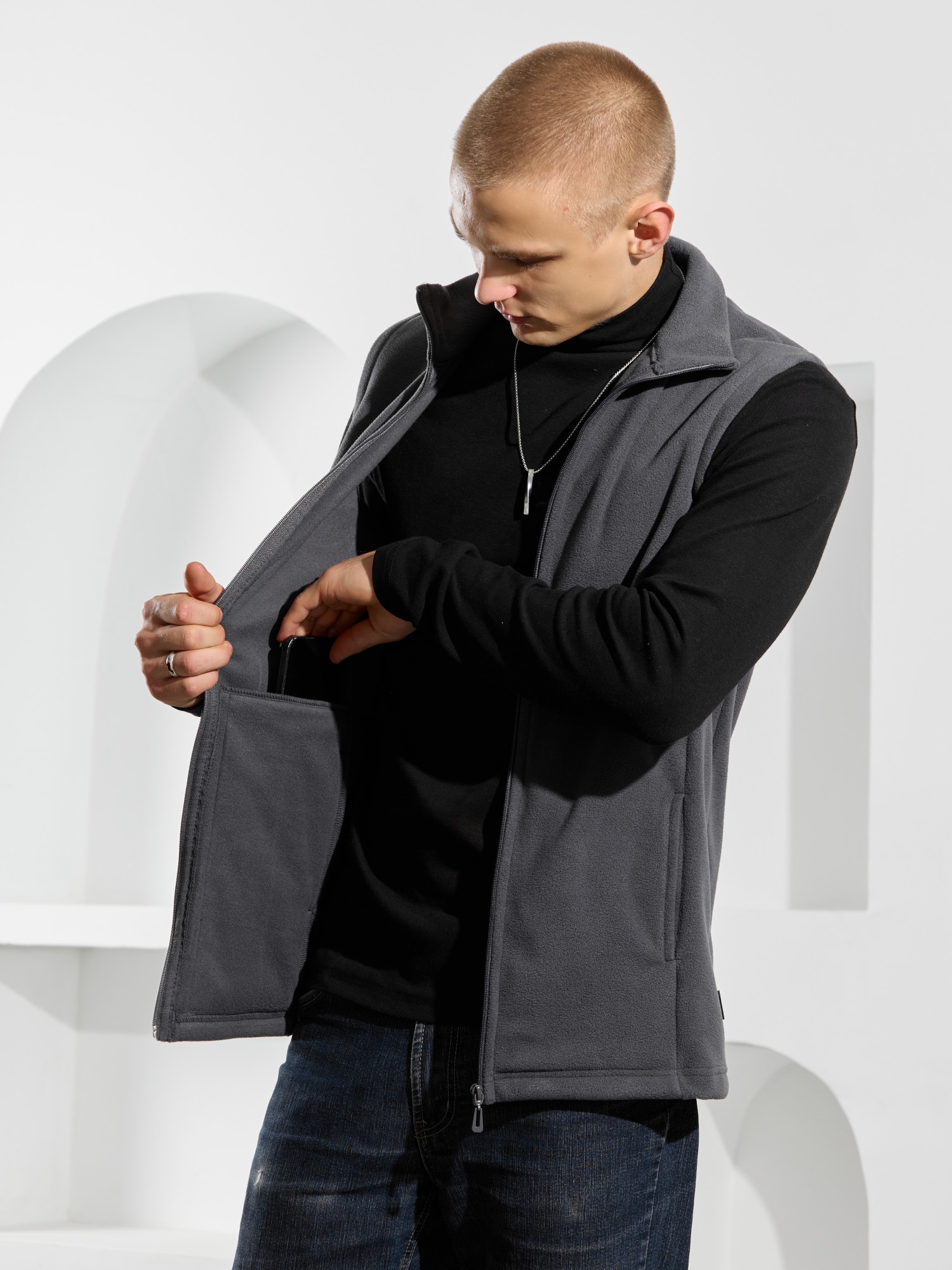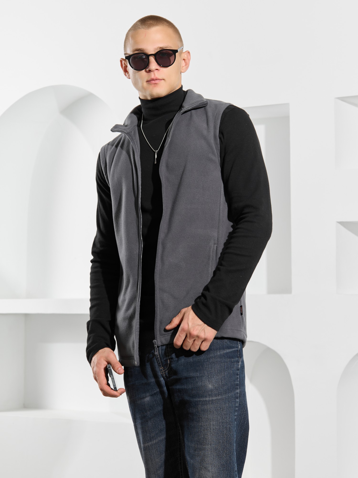 Жилет мужской из флиса, прилегающего силуэта, с воротником-стойкой , центральной боротовой застежкой на тесьму "молния" и вертикальными рельефами на полочках, в швах которых обработаны карманы. Проймы и низ изделия обработаны подгибкой. В нижней части левого бокового шва вставлен небольшой декоративный элемент из репсовой ленты.
