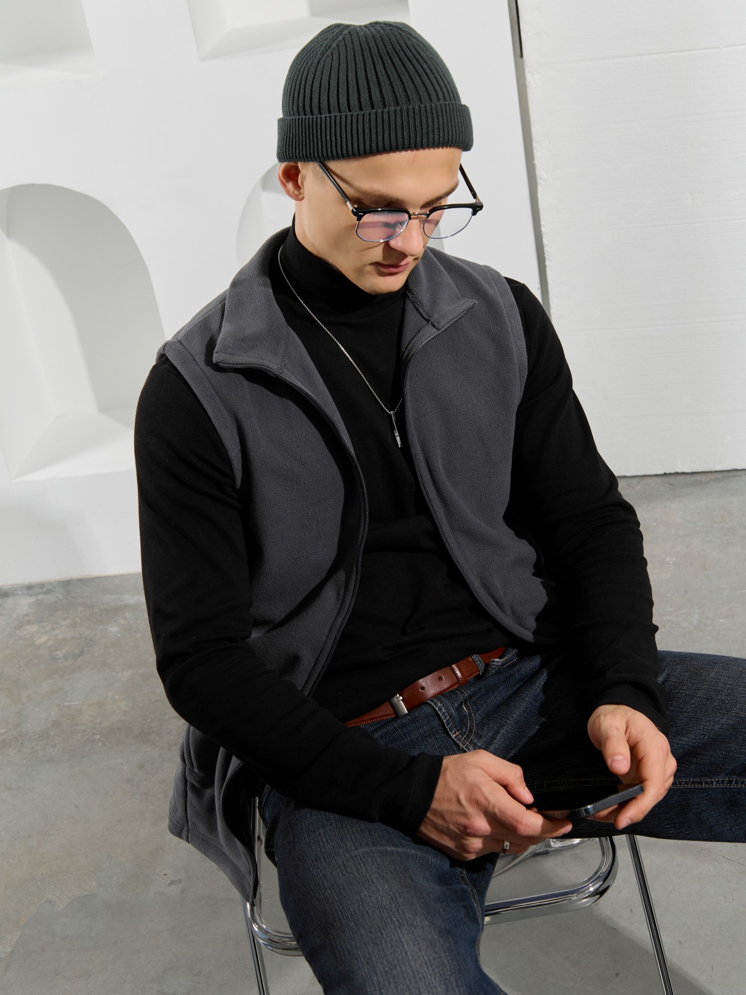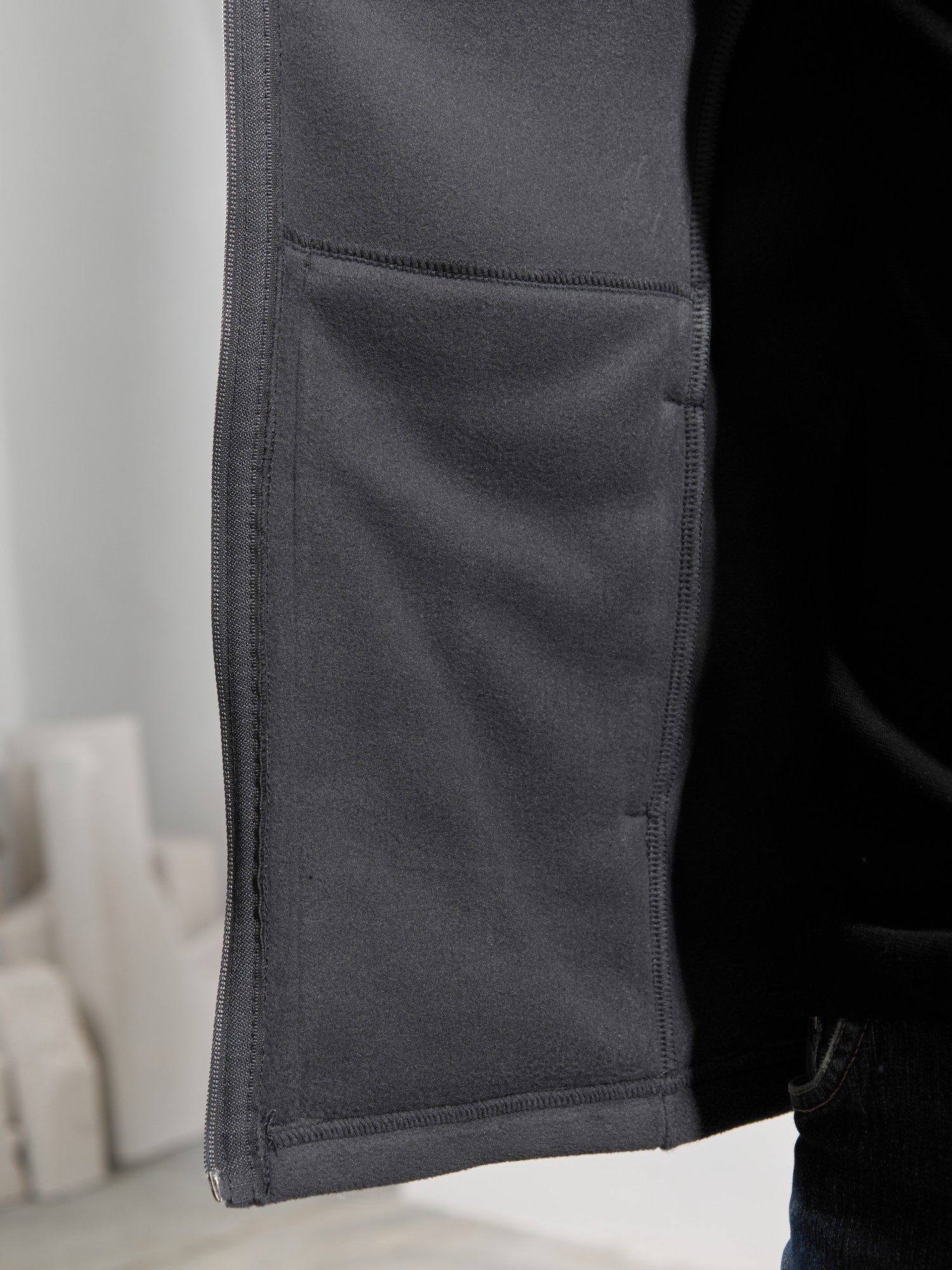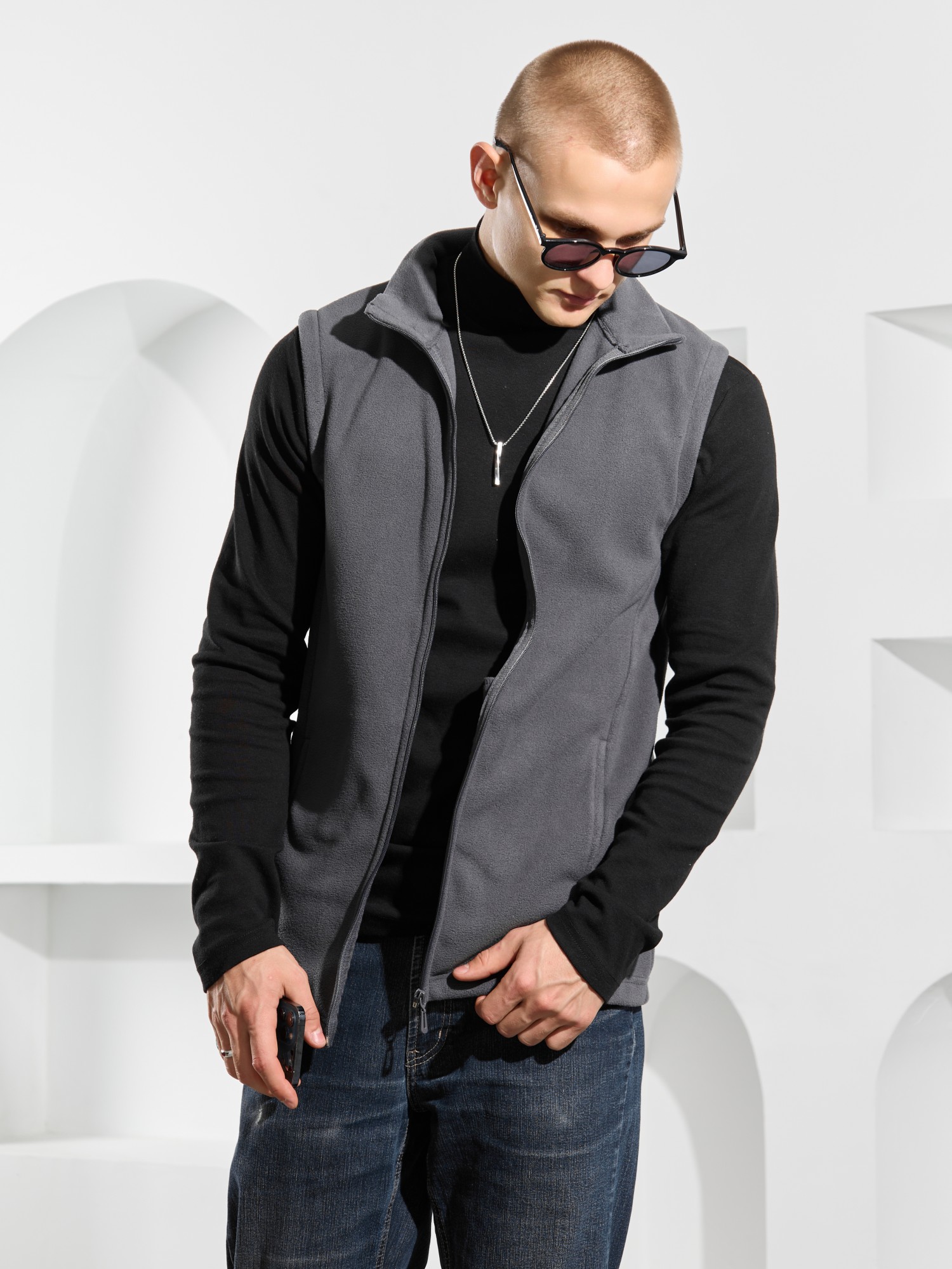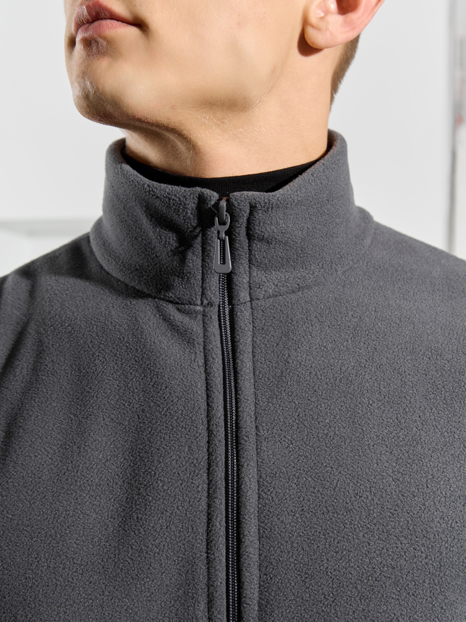 Жилет мужской из флиса, прилегающего силуэта, с воротником-стойкой , центральной боротовой застежкой на тесьму "молния" и вертикальными рельефами на полочках, в швах которых обработаны карманы. Проймы и низ изделия обработаны подгибкой. В нижней части левого бокового шва вставлен небольшой декоративный элемент из репсовой ленты.