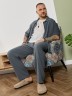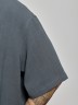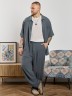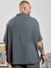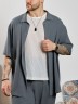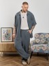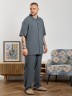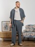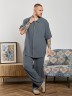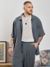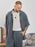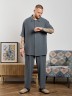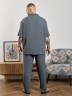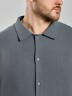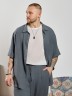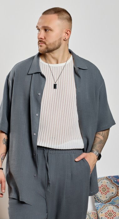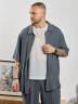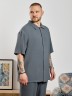 Рубашка мужская из фактурного полотна с втачными рукавами длиной до локтя, стояче-отложным воротником и центральной бортовой застежкой на петли и пуговицы. По воротнику и проймам настрочены отделочные строчки. Нижние срезы рукавов и изделия обработаны подгибкой.