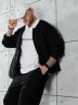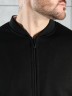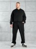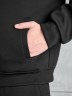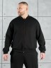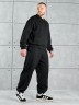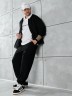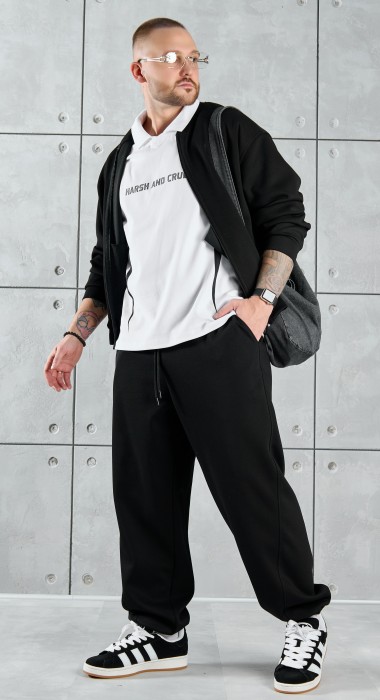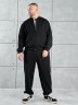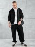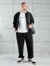Костюм мужской из трикотажного полотна "лининг", состоящий из бомбера и брюк. Бомбер - с длиннми втачными рукавами с притачными манжетами, прорезными карманами с листочками на полочках, центральной бортовой застежкой на тесьму "молния", втачным воротником-стойкой с закругленными концами и притачным поясом по низу. По шву притачивания пояса и проймам настрочены отделочные строчки. Брюки - свободного покроя, со смещенными к центрам передних половин боковыми швами, карманами в боковых швах и притачным поясом с эластичной тесьмой внутри. Нижние срезы обработаны подгибкой с эластичной тесьмой. Для регулирования степени прилегания изделия по талии предусмотрен шнурок, вставленный через две обметанные петли в центре пояса спереди.