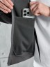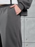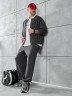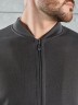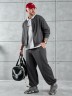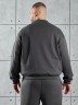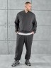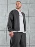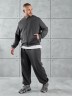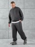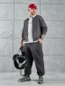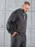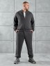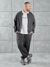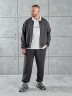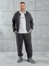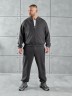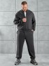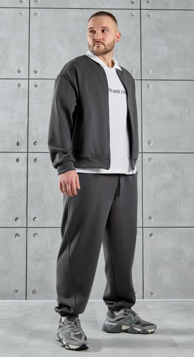 Костюм мужской из трикотажного полотна "лининг", состоящий из бомбера и брюк. Бомбер - с длиннми втачными рукавами с притачными манжетами, прорезными карманами с листочками на полочках, центральной бортовой застежкой на тесьму "молния", втачным воротником-стойкой с закругленными концами и притачным поясом по низу. По шву притачивания пояса и проймам настрочены отделочные строчки. Брюки - свободного покроя, со смещенными к центрам передних половин боковыми швами, карманами в боковых швах и притачным поясом с эластичной тесьмой внутри. Нижние срезы обработаны подгибкой с эластичной тесьмой. Для регулирования степени прилегания изделия по талии предусмотрен шнурок, вставленный через две обметанные петли в центре пояса спереди.