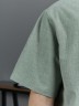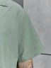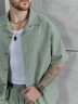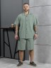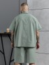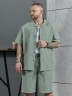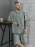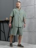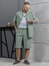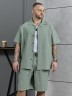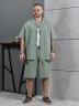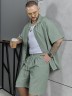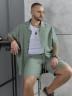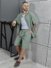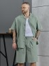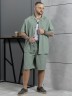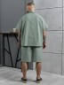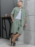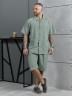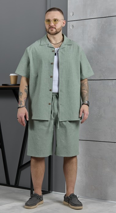 Костюм мужской, состоящий их рубашки и шорт из гладкокрашеного фактурного полотна. Рубашка - с короткими втачными рукавами, стояче-отложнеым воротником и центральной бортовой застежкой на обметаные петли и пуговицы. Спинка - с притачной кокеткой. По плечевым швам, воротнику, кокетке и швам втачивания рукавов настрочены отделочные строчки. Нижние срезы изделия и рукавов обработаны подгибкой. Шорты - удлиненные, на притачном поясе с эластичной тесьмой внутри и карманами в боковых шва. Средний шов переда обработан с имитацией застежки "гульфик". Для регулировани я степени прилегания изделия по талии предусмотрен шнурок вставленный в пояс через две обметанные петли. Нижние срезы обработаны подгибкой.
