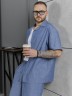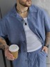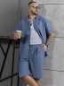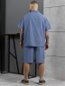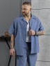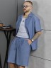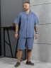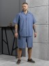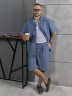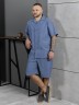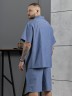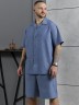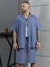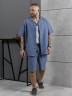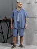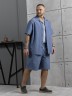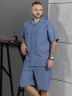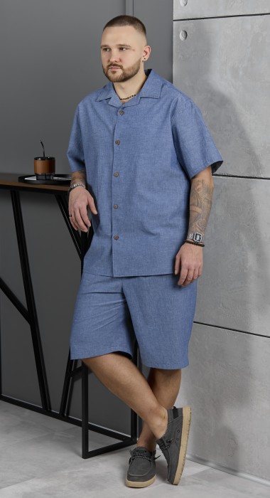 Костюм мужской, состоящий их рубашки и шорт из гладкокрашеного фактурного полотна. Рубашка - с короткими втачными рукавами, стояче-отложнеым воротником и центральной бортовой застежкой на обметаные петли и пуговицы. Спинка - с притачной кокеткой. По плечевым швам, воротнику, кокетке и швам втачивания рукавов настрочены отделочные строчки. Нижние срезы изделия и рукавов обработаны подгибкой. Шорты - удлиненные, на притачном поясе с эластичной тесьмой внутри и карманами в боковых шва. Средний шов переда обработан с имитацией застежки "гульфик". Для регулировани я степени прилегания изделия по талии предусмотрен шнурок вставленный в пояс через две обметанные петли. Нижние срезы обработаны подгибкой.