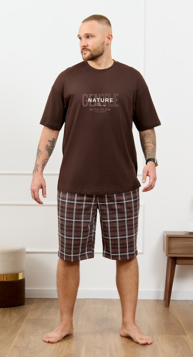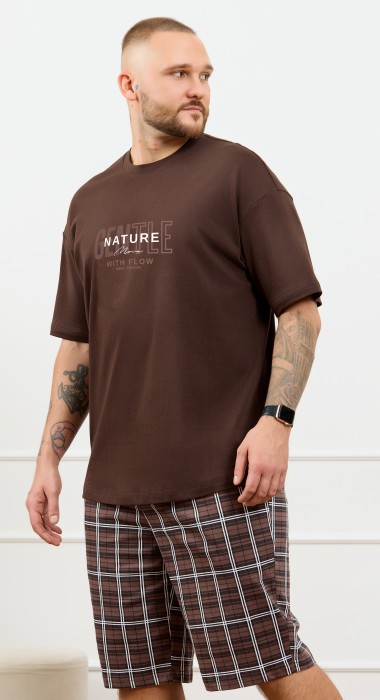 Костю мужской из трикотажного полотна "кулирка", состоящий из футболки и шорт. Футболка классического покроя, с короткими втачными рукавами и приспущенной линией плеч, горловиной овальной формы, обработанной втачной планкой и принтом на детали переда, выполненным в технике шелкографии. Нижние срезы рукавов и изделия обработаны подгибкой. По горловине настрочена отделочная строчка. Шорты длиной до колен, на притачном поясе с эластичной тесьмой внутри, с карманами в боковых швах. Нижние срезы обработаны подгибкой.