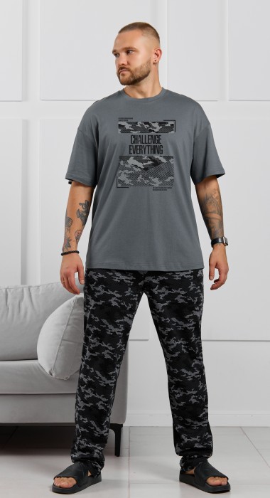 Костюм мужской, состоящий из футболки и брюк. Футболка однотонная с принтом на груди; модель свободная, со спущенной линией плеч, овальным вырезом горловины. Брюки из полотна с набивным рисунком эксклюзивного дизайна, прямые, с боковыми карманами с обтачными входами, на притачном поясе с отстроченной эластичной тесьмой.