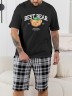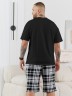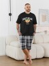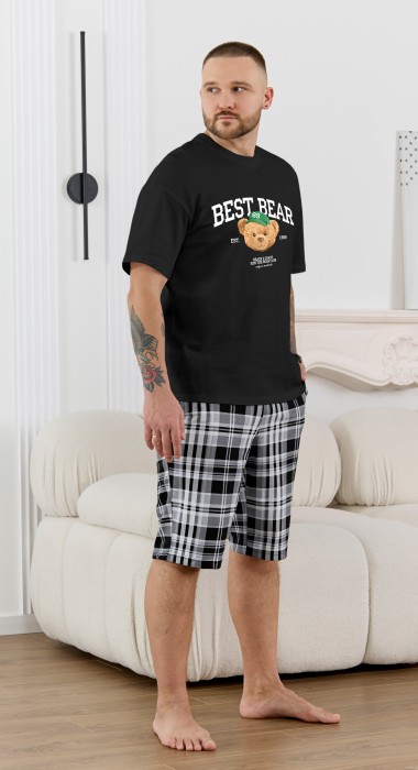 Костюм мужской, состоящий из футболки и шорт. Футболка однотонная с принтом на груди; модель свободная, со спущенной линией плеч, втачными рукавами, овальным вырезом горловины. Шорты из полотна с набивным рисунком эксклюзивного дизайна, с боковыми карманами с обтачными входами, на притачном поясе с отстроченной эластичной тесьмой.