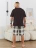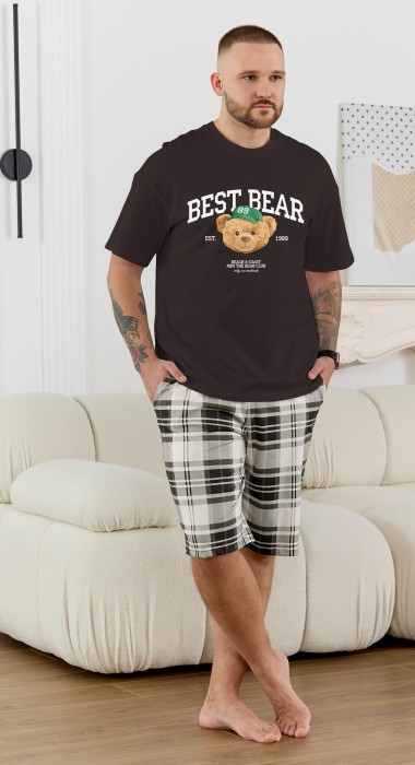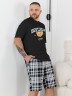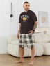 Костюм мужской, состоящий из футболки и шорт. Футболка однотонная с принтом на груди; модель свободная, со спущенной линией плеч, втачными рукавами, овальным вырезом горловины. Шорты из полотна с набивным рисунком эксклюзивного дизайна, с боковыми карманами с обтачными входами, на притачном поясе с отстроченной эластичной тесьмой.