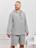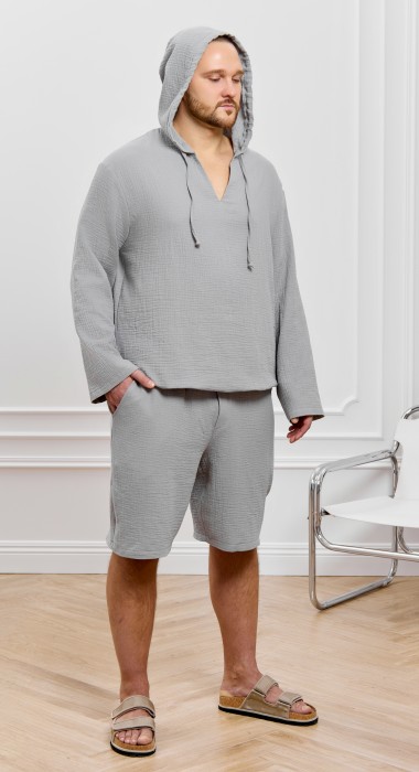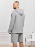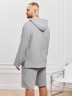 Костюм мужской из фактурного гладкокрашеного полотна, состоящий их джемпера и брюк. Джемпер - с капюшоном, длинными втачными рукавами и V-образным вырезом горловины спереди. В шве подгибки переднего края капюшона вставлен шнурок из основного материала. Нижние срезы рукавов и низ изделия обработаны подгибкой. Шорты - классическогь покроя, на притачном поясе с эластичной тесьмой внутри, с карманами в боковых швах. Нижние срезы обработаны подгибкой.