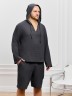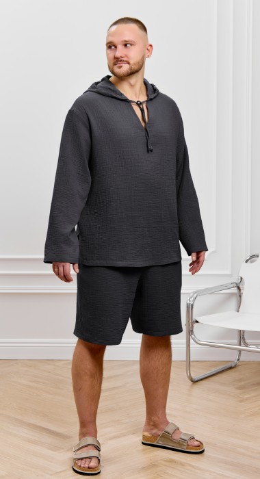 Костюм мужской из фактурного гладкокрашеного полотна, состоящий их джемпера и брюк. Джемпер - с капюшоном, длинными втачными рукавами и V-образным вырезом горловины спереди. В шве подгибки переднего края капюшона вставлен шнурок из основного материала. Нижние срезы рукавов и низ изделия обработаны подгибкой. Шорты - классическогь покроя, на притачном поясе с эластичной тесьмой внутри, с карманами в боковых швах. Нижние срезы обработаны подгибкой.